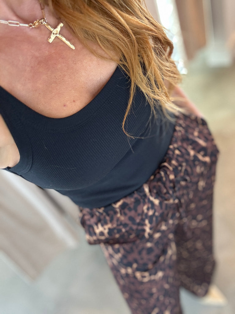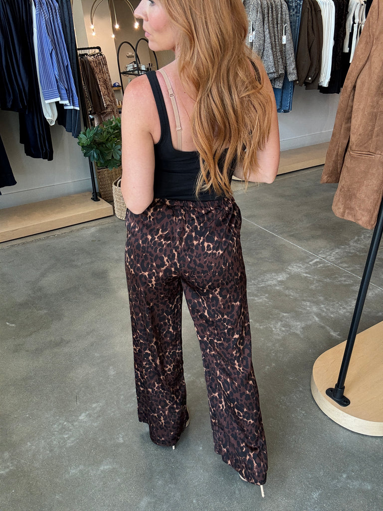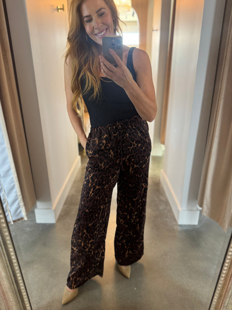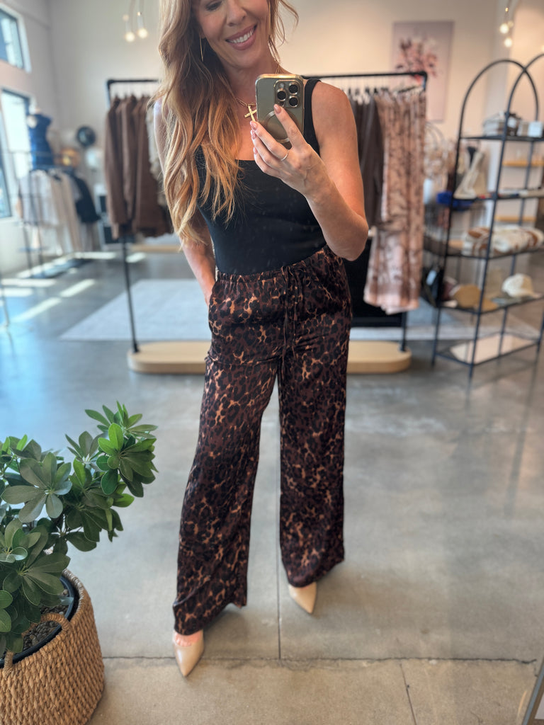 Silky Animal Print Tie Waist Pants that fit just right. The drawstring lets you rock them on your hips or at your natural waist. Pair with a bodysuit or cozy sweater this fall for a fun and stylish vibe.