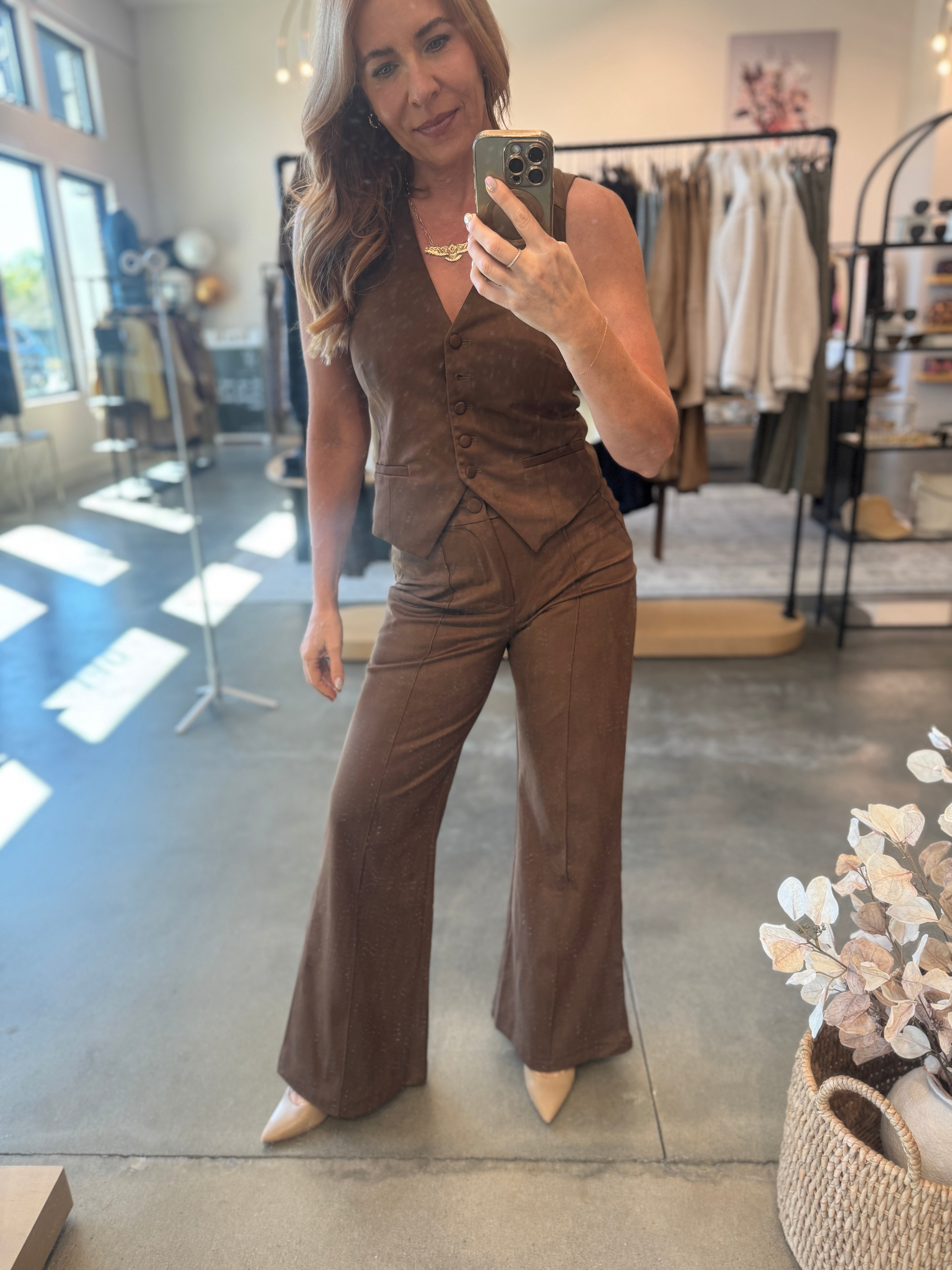 Slip into these Wide Leg Suede Pants for a comfy yet stylish vibe. They fit true to size and feature a silky faux suede fabric with a chic seam running down the center. The elastic waistband at the back keeps things relaxed and easygoing. Andrea’s rocking a size small!