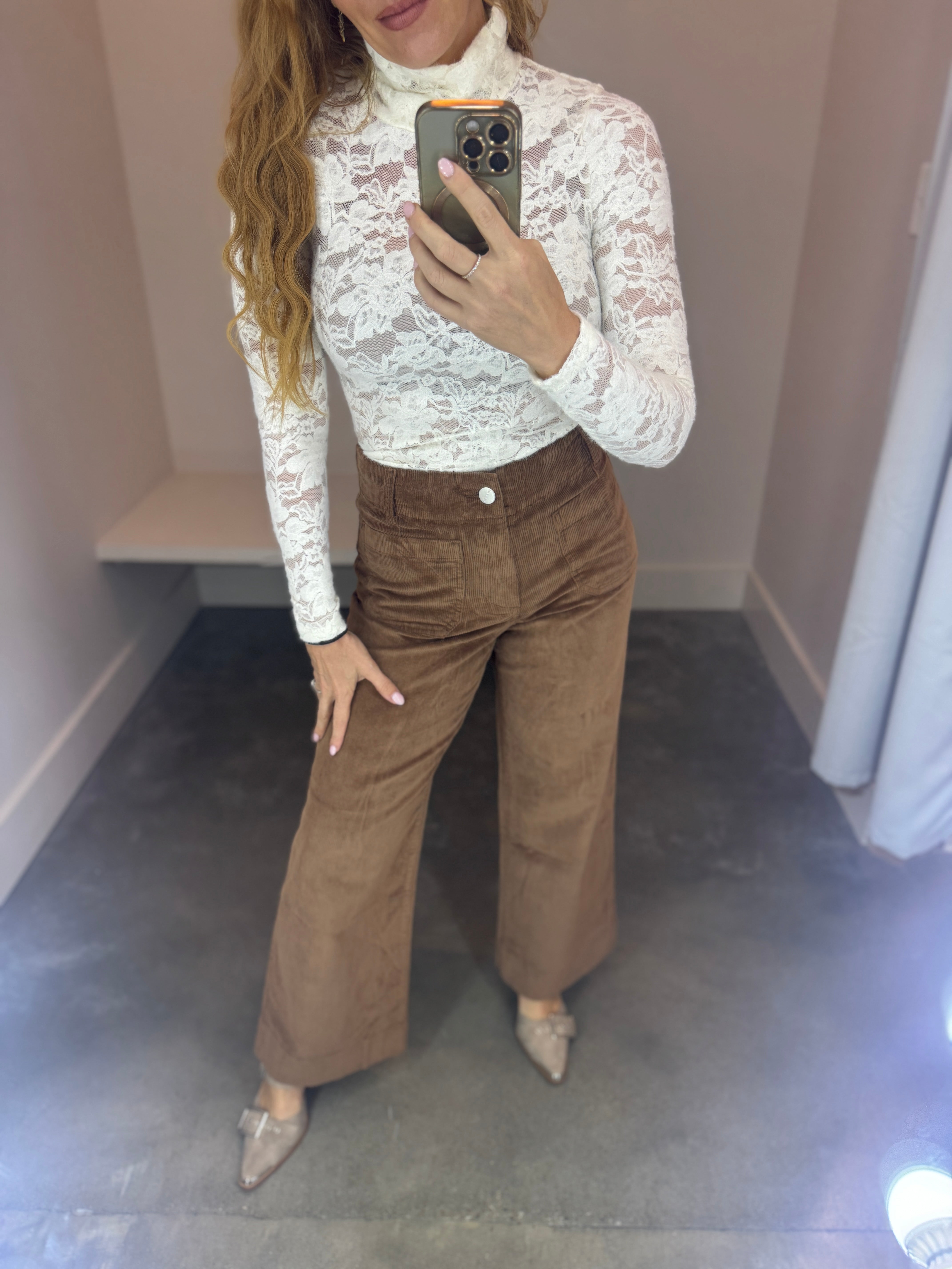 Colette High Rise Front Pocket Corduroy Pants feature a 30" inseam and run large, so be sure to size down. Andrea is sporting a size 25 here. Perfect for fall, these cozy pants offer a stylish alternative to denim. Pair them with a graphic tee and sneakers for a casual vibe, or dress them up with your favorite sweater and boots for a chic look.