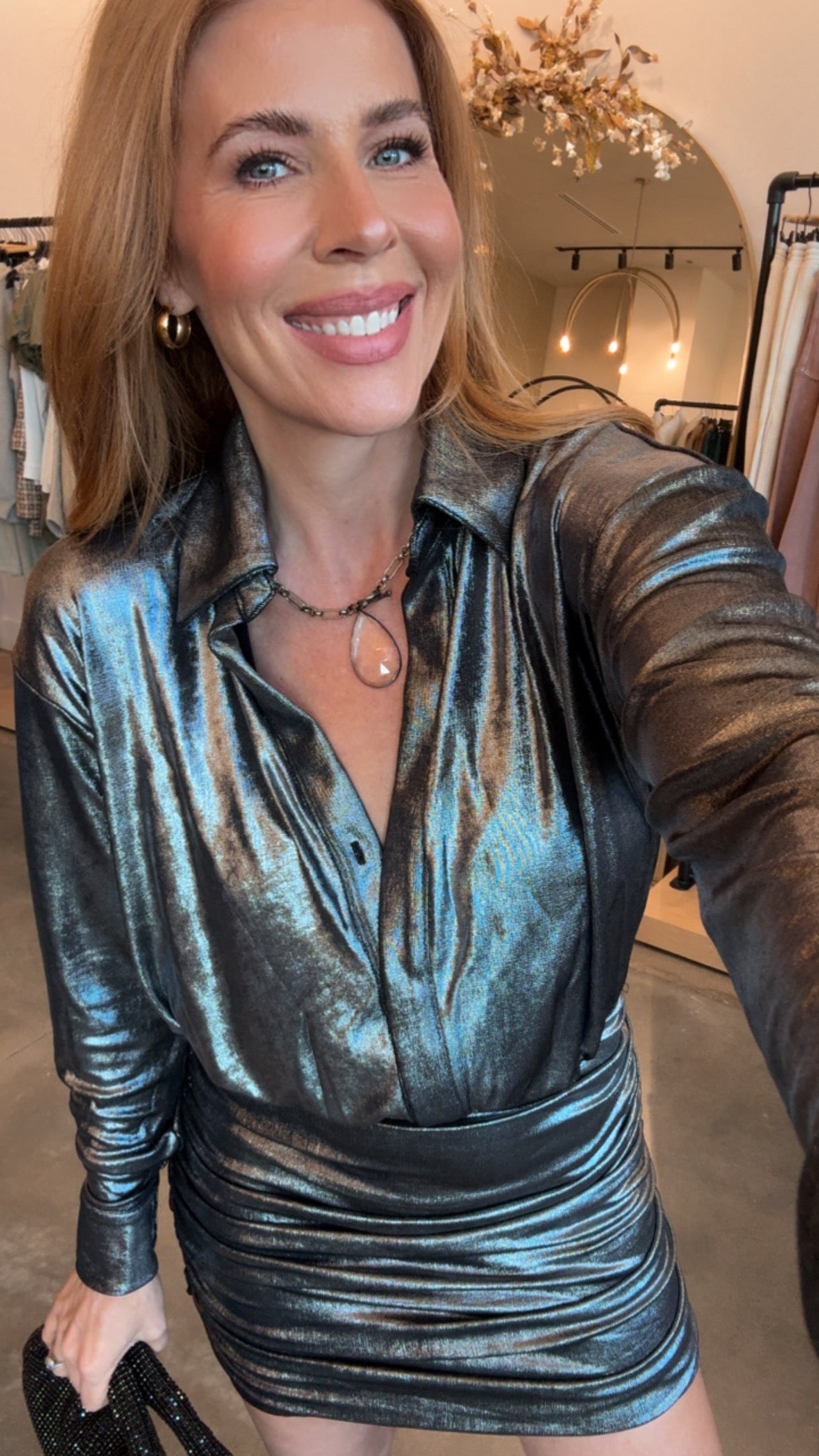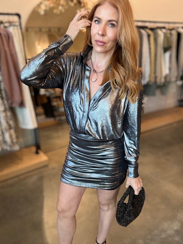 Slip into this show-stopping metallic collar mini dress and prepare for compliments. The ruched silhouette hugs you in all the right ways, while the shimmery shirt-style collar adds an unexpected edge. Whether you're hitting a holiday bash, catching your favorite band, or just want to feel fabulous, this dress delivers effortless cool with serious impact. Perfect for anyone ready to make an entrance.