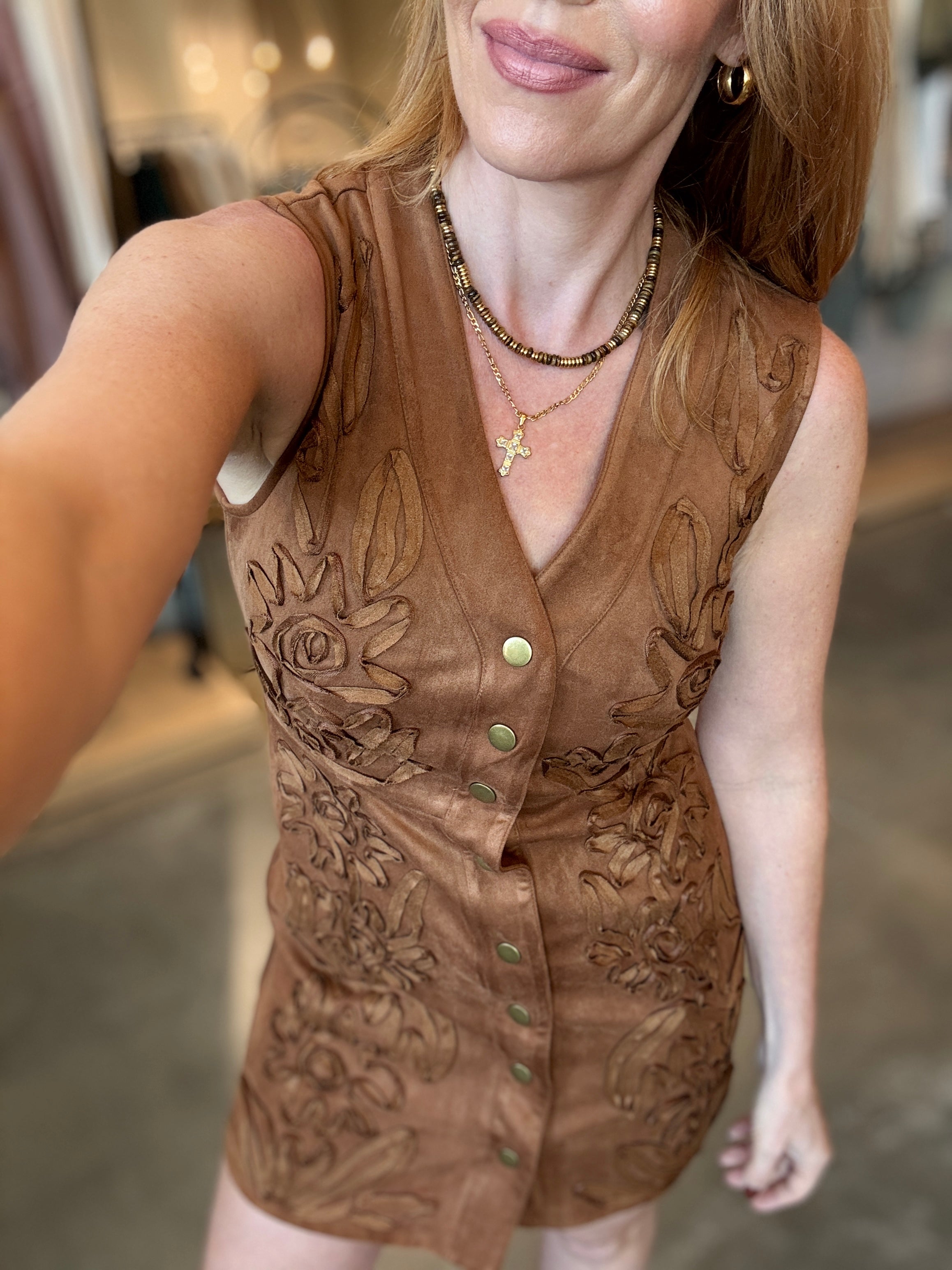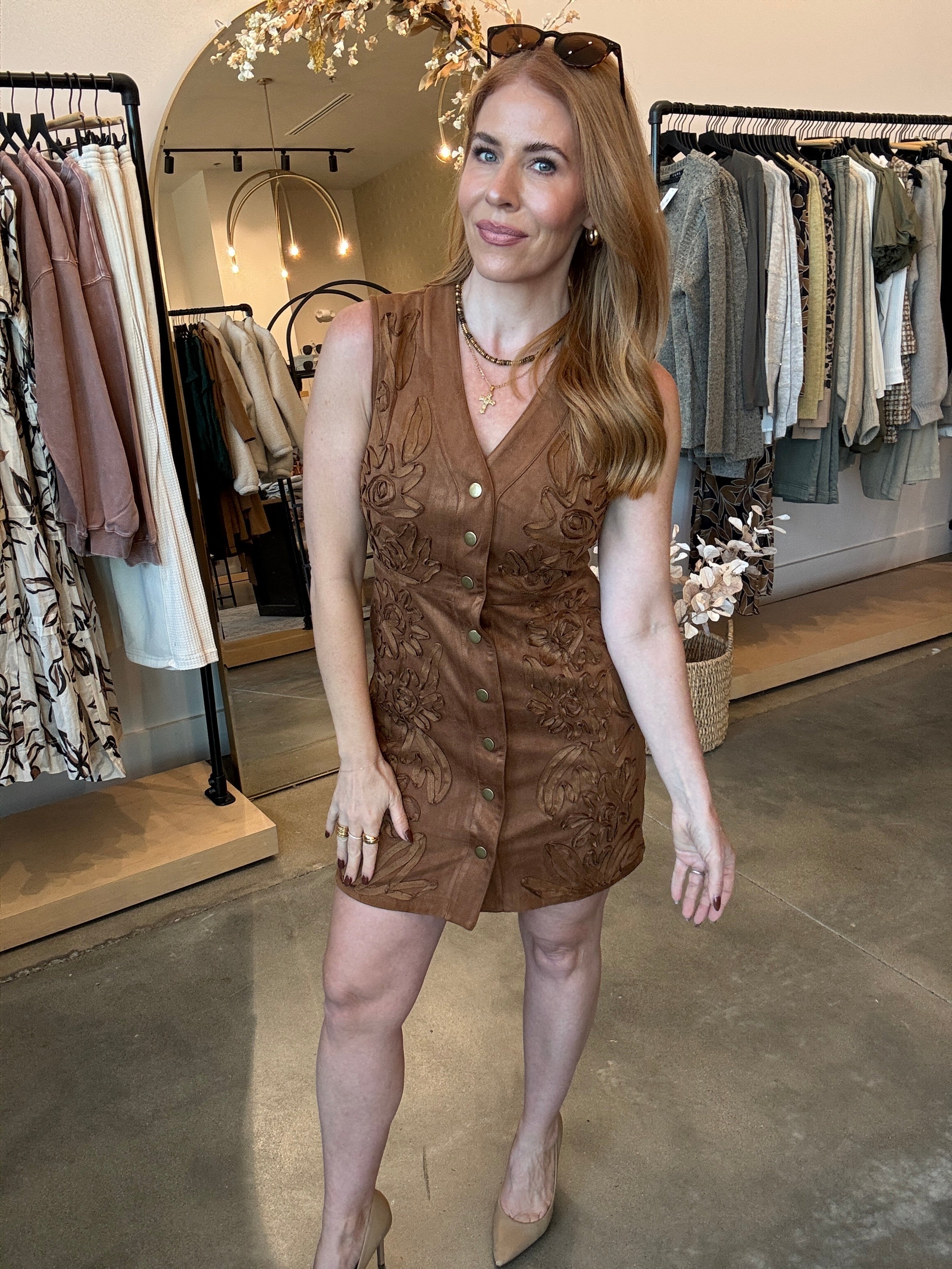 Slip into effortless elegance with this sleeveless button-down dress crafted from buttery-soft faux suede. The luxurious fabric feels amazing against your skin while maintaining a flattering fit that runs true to size. Pair it with boots for a casual vibe or dress it up with heels for a show-stopping look. Perfect for holiday gatherings, date nights, or any occasion where you want to turn heads.