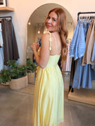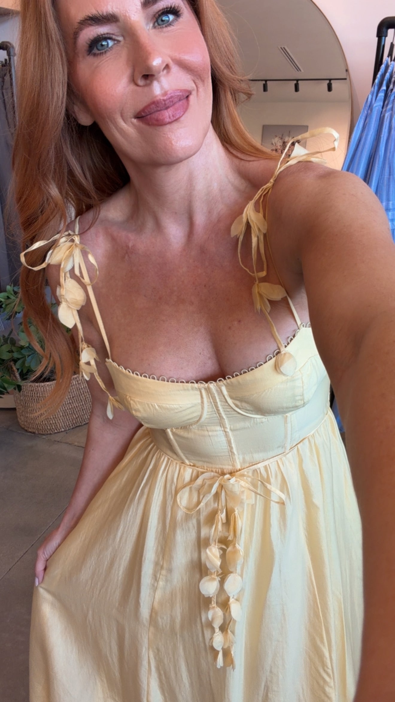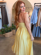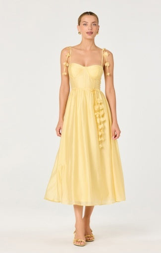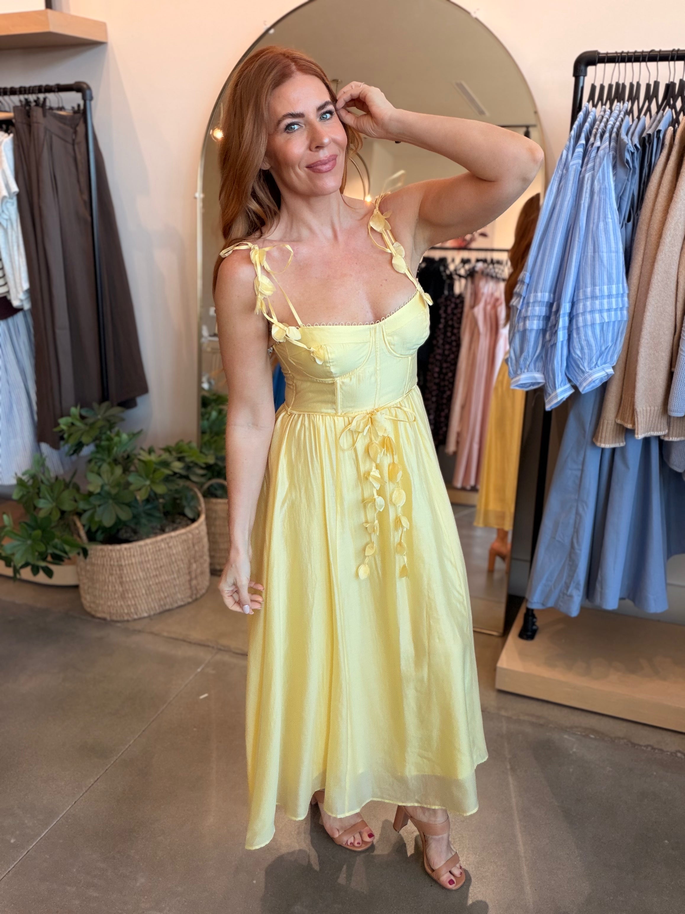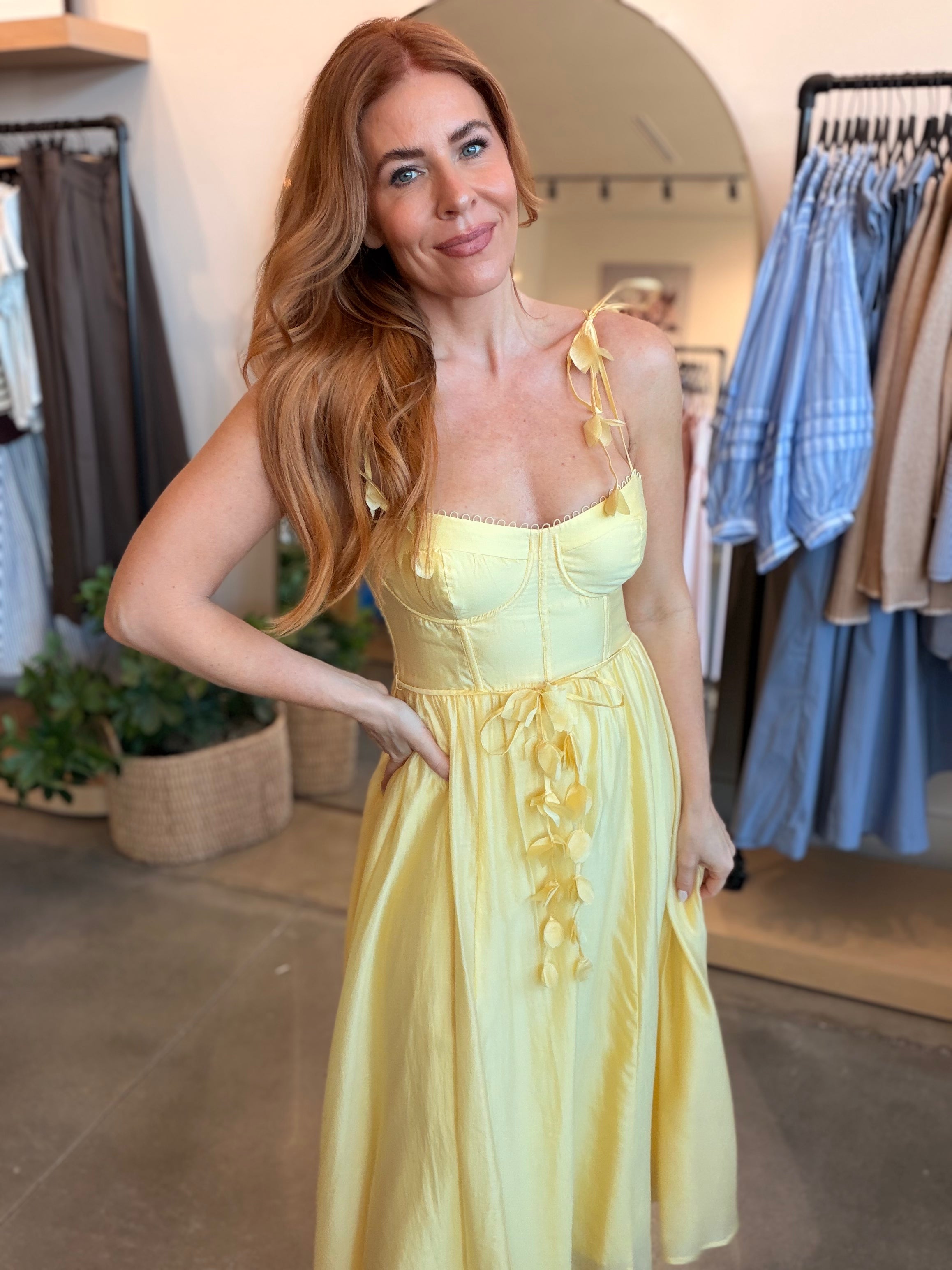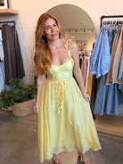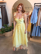 Dimensional flower appliqués and delicate scalloped trim create romantic elegance in this flowy midi dress. The structured bodice with underwire cups and boning offers support, while the adjustable tie straps with draped florals and fabric belt create a feminine silhouette.