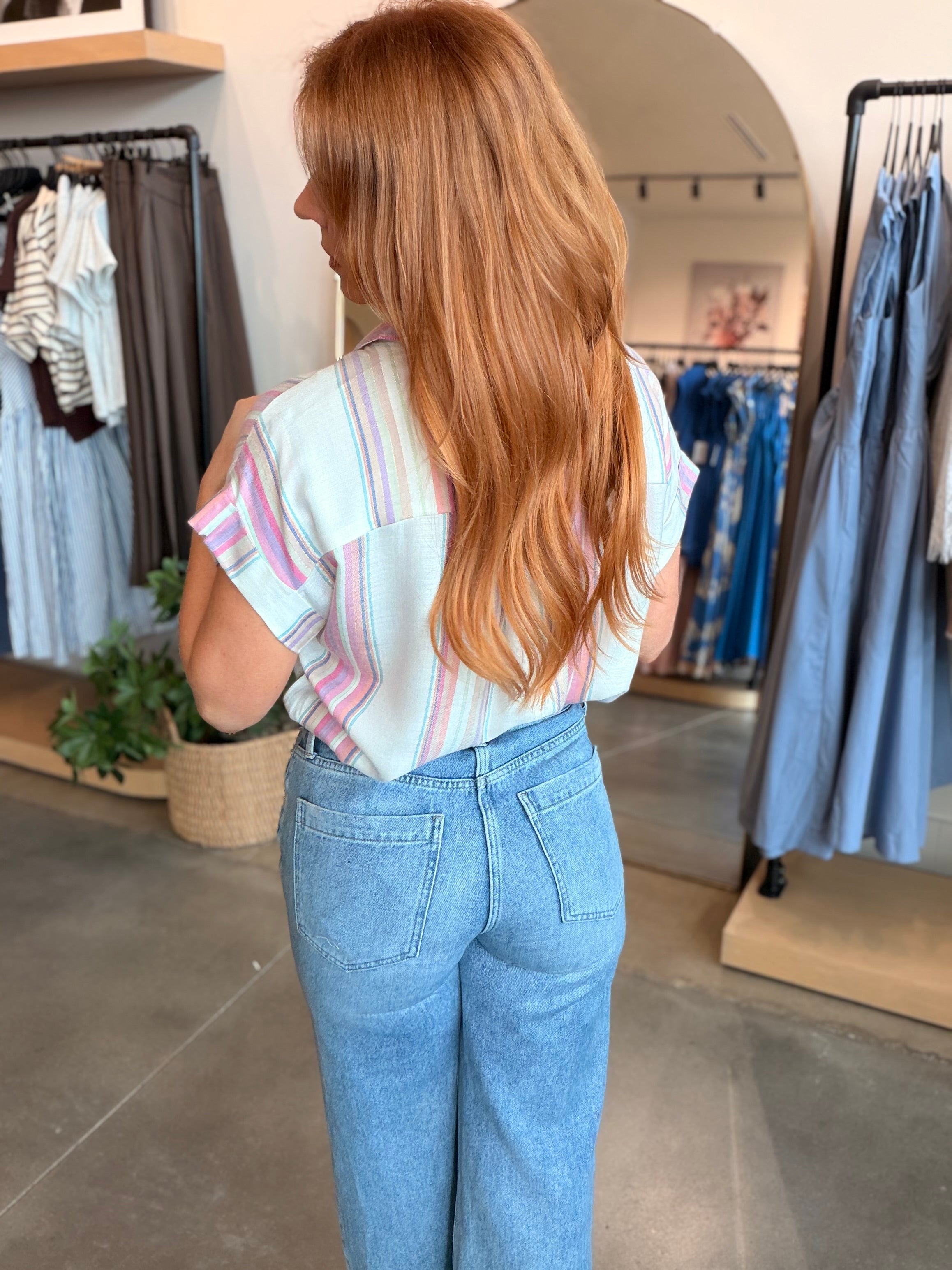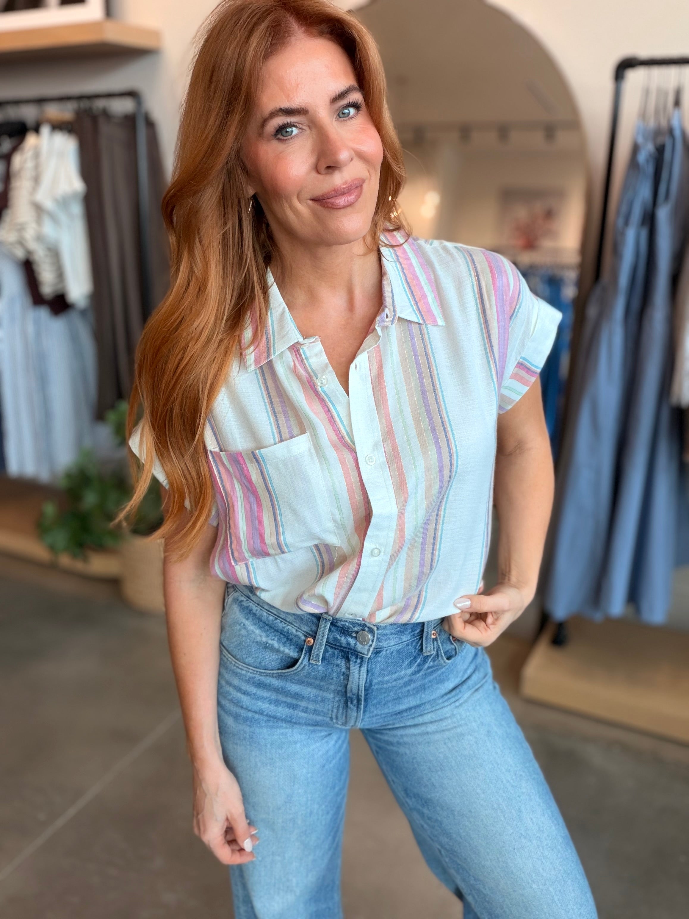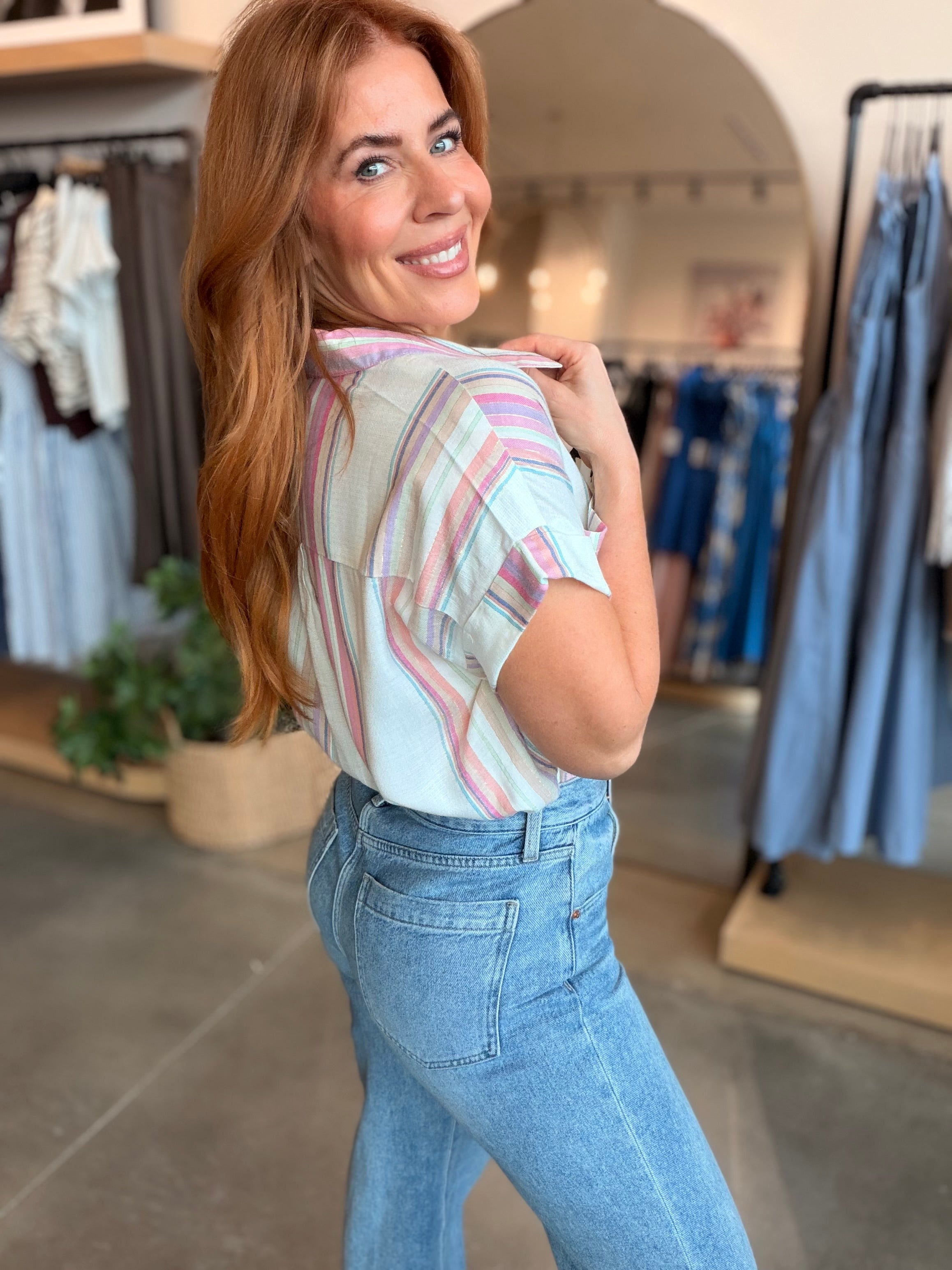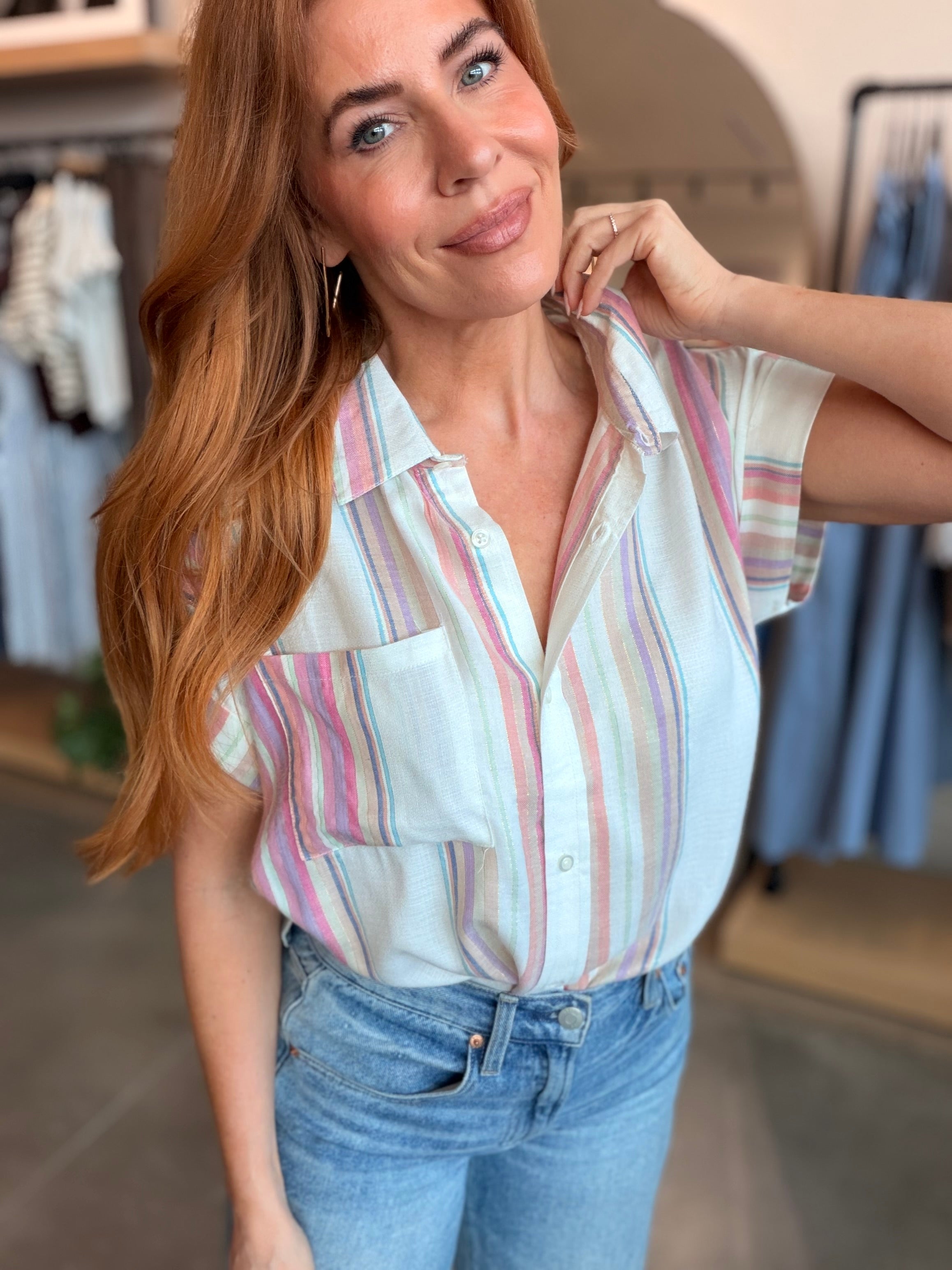 White & Pink Stripe Linen Short Sleeves that are oversized, great for knotting or tucking—like a stylish game of hide and seek!