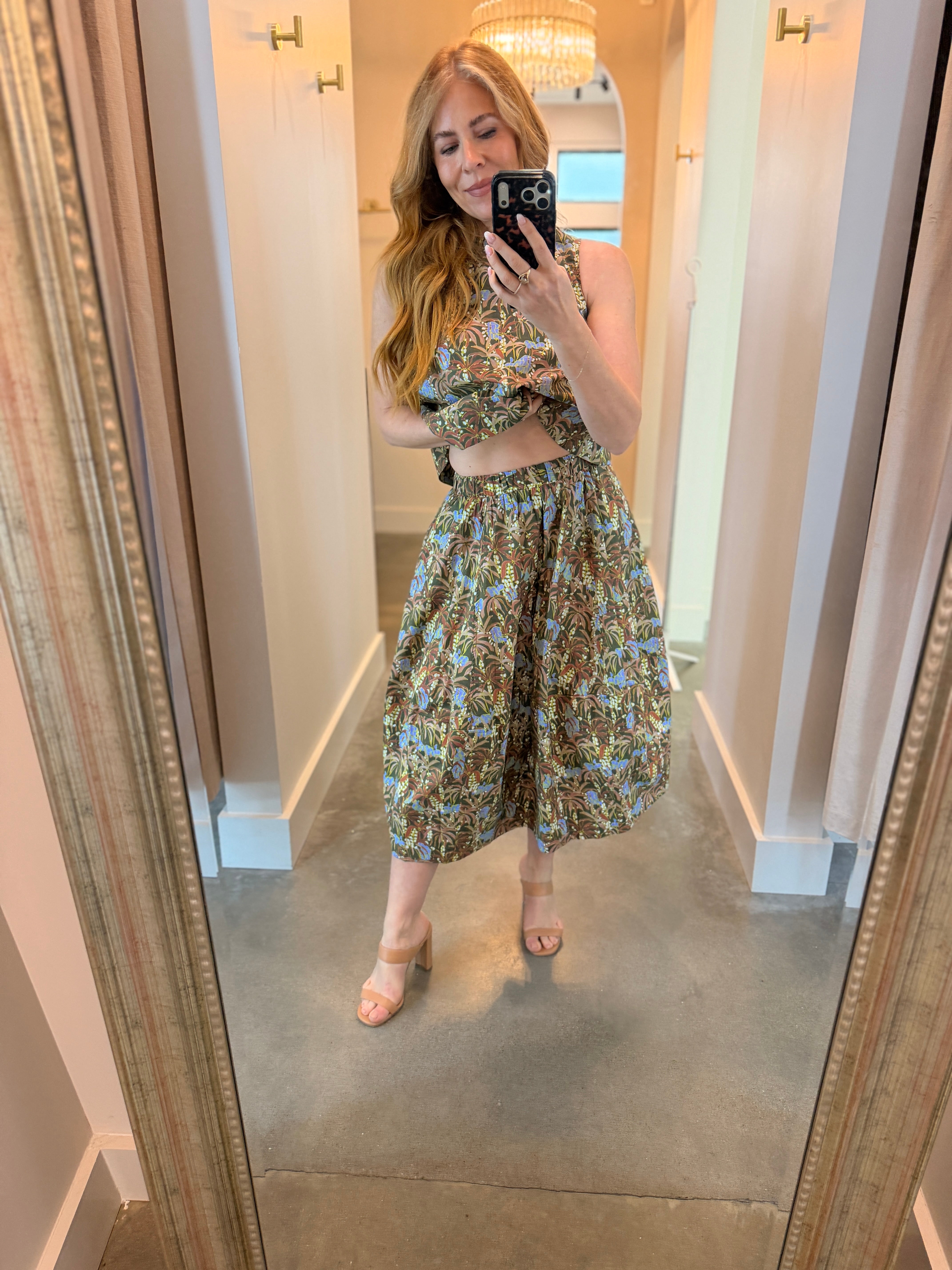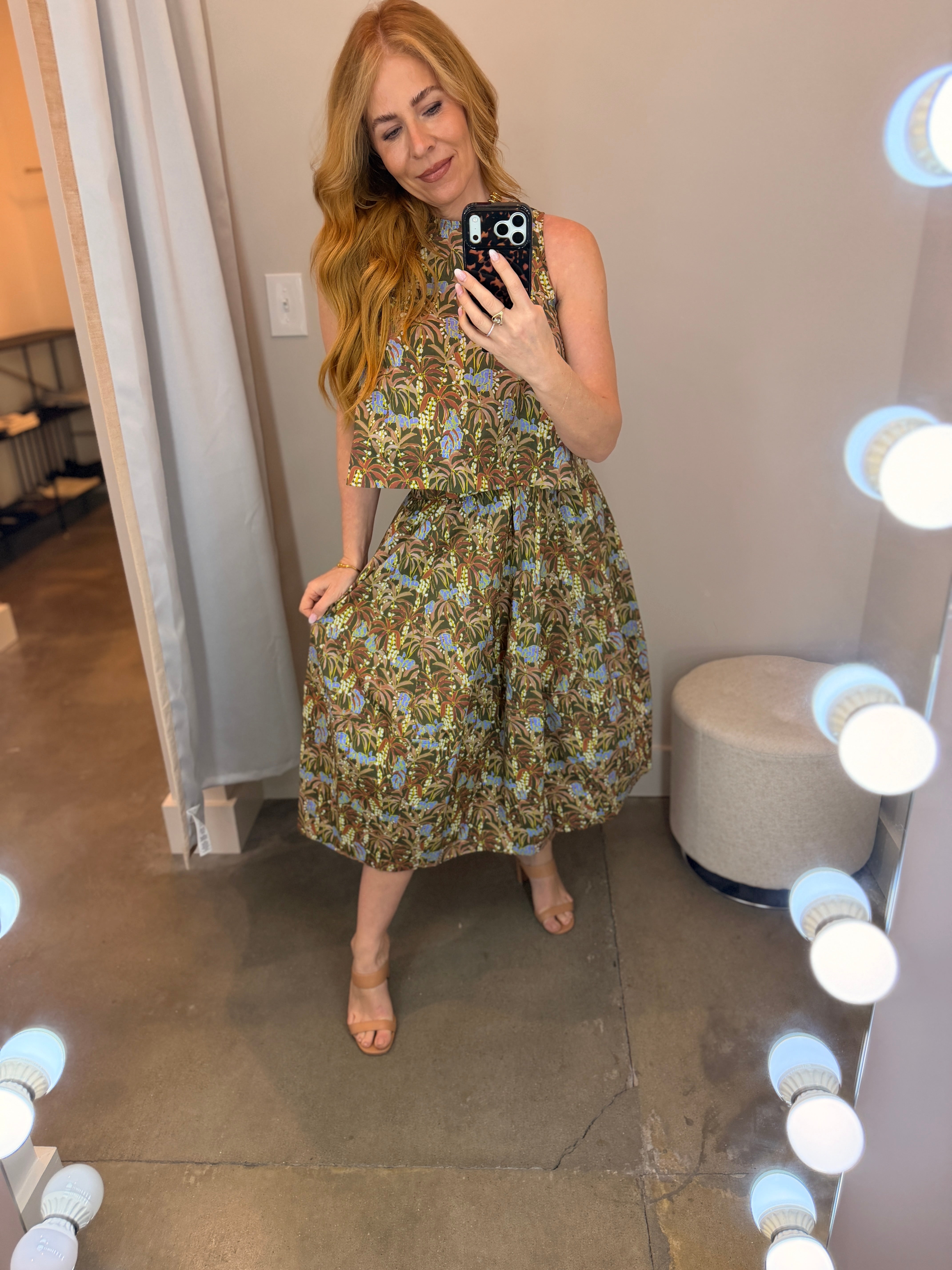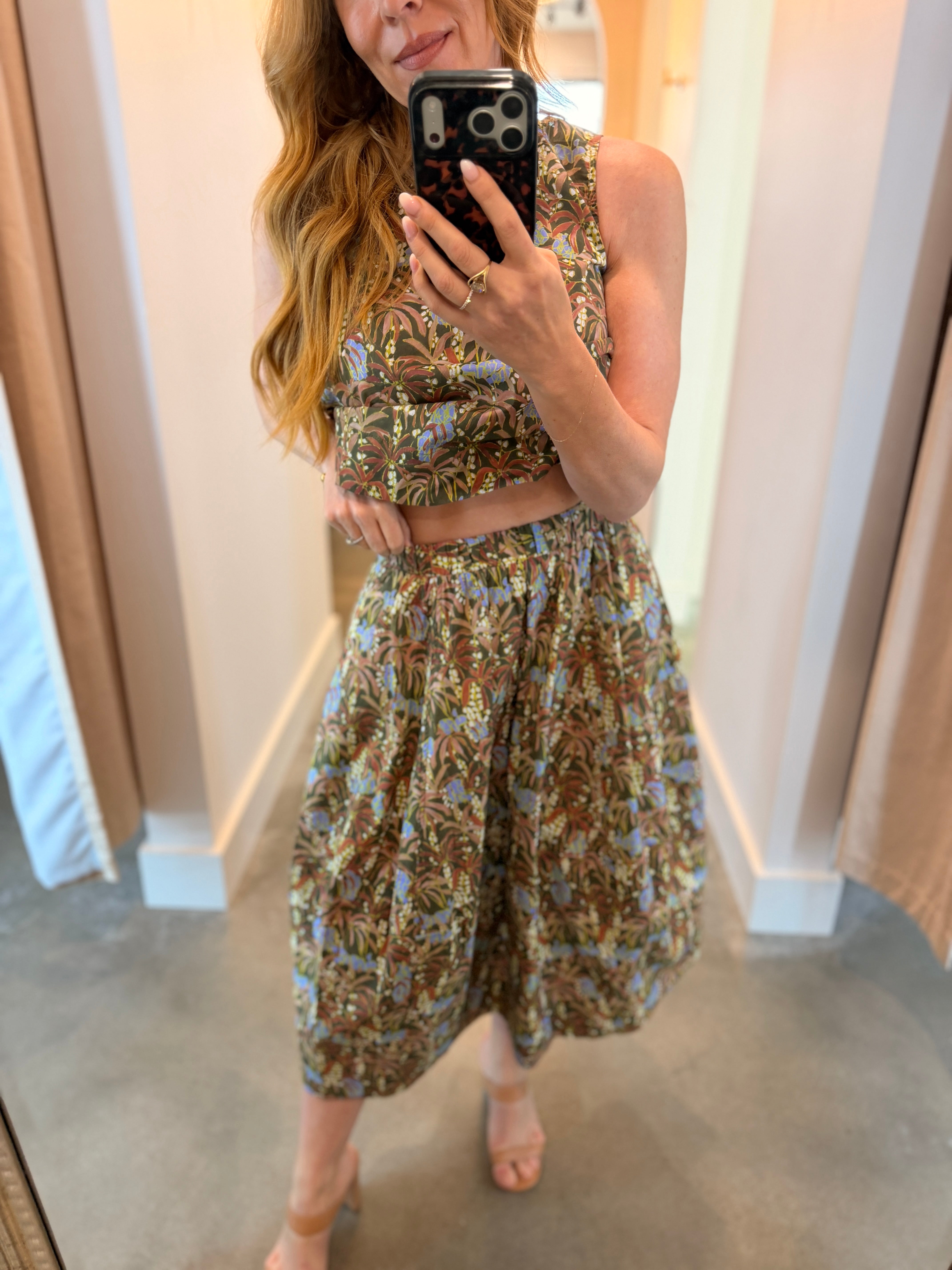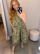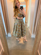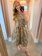 Elevate your spring wardrobe with this charming Olive Floral Midi Skirt that effortlessly transitions from casual to coordinated. Rock it solo with your favorite white top or bodysuit denim or shorts, or pair it with the matching top for an instant ensemble moment. The high neckline in front meets a scooped back for a flirty, unexpected twist. True to size and ready to become your go-to piece for every season ahead.