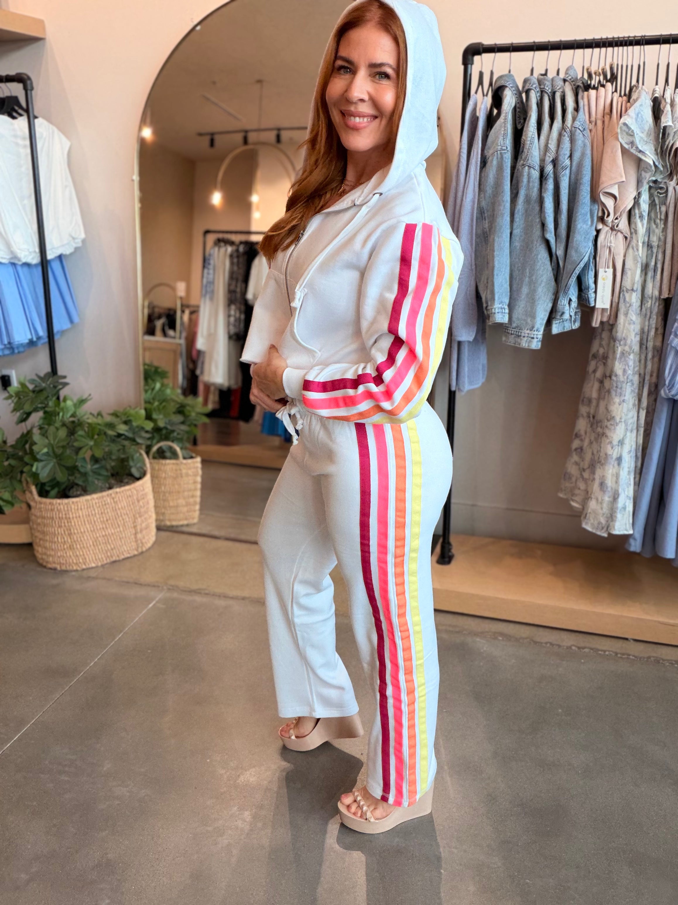 These Electric Stripe White Hoodie is your new comfort obsession. True to size, the perfect excuse to embrace that cozy-chic vibe without sacrificing style. Rock this with shorts or matching sweatpants. Soft, stretchy, and ready to become your favorite go-to summer outerwear piece.