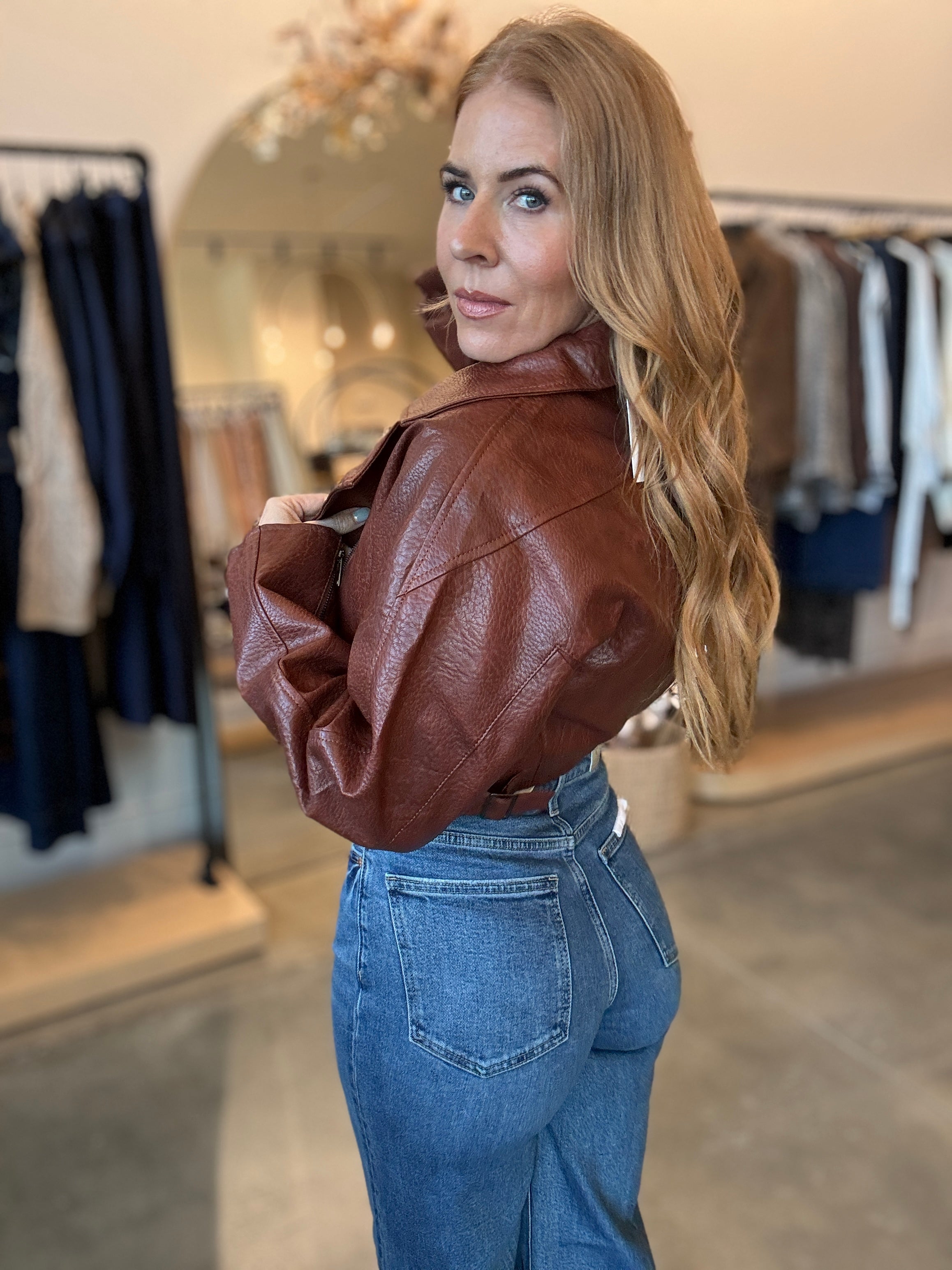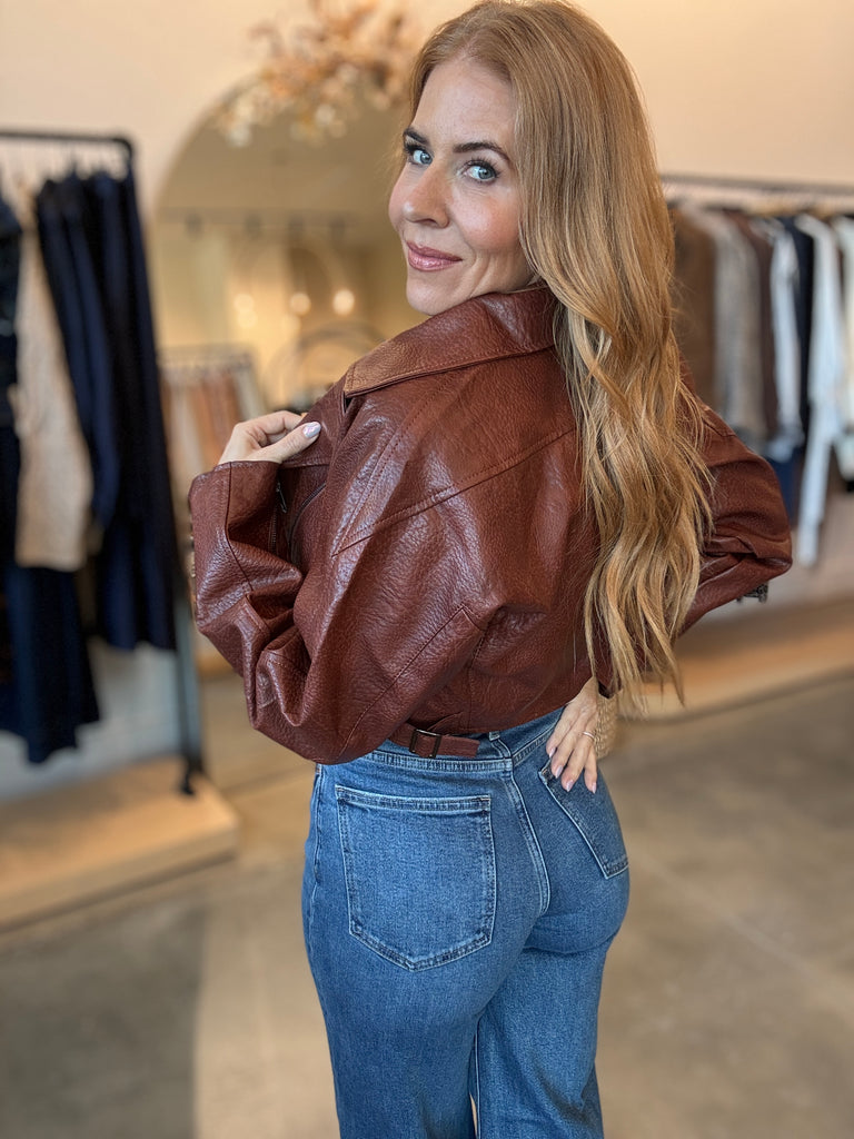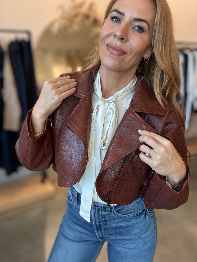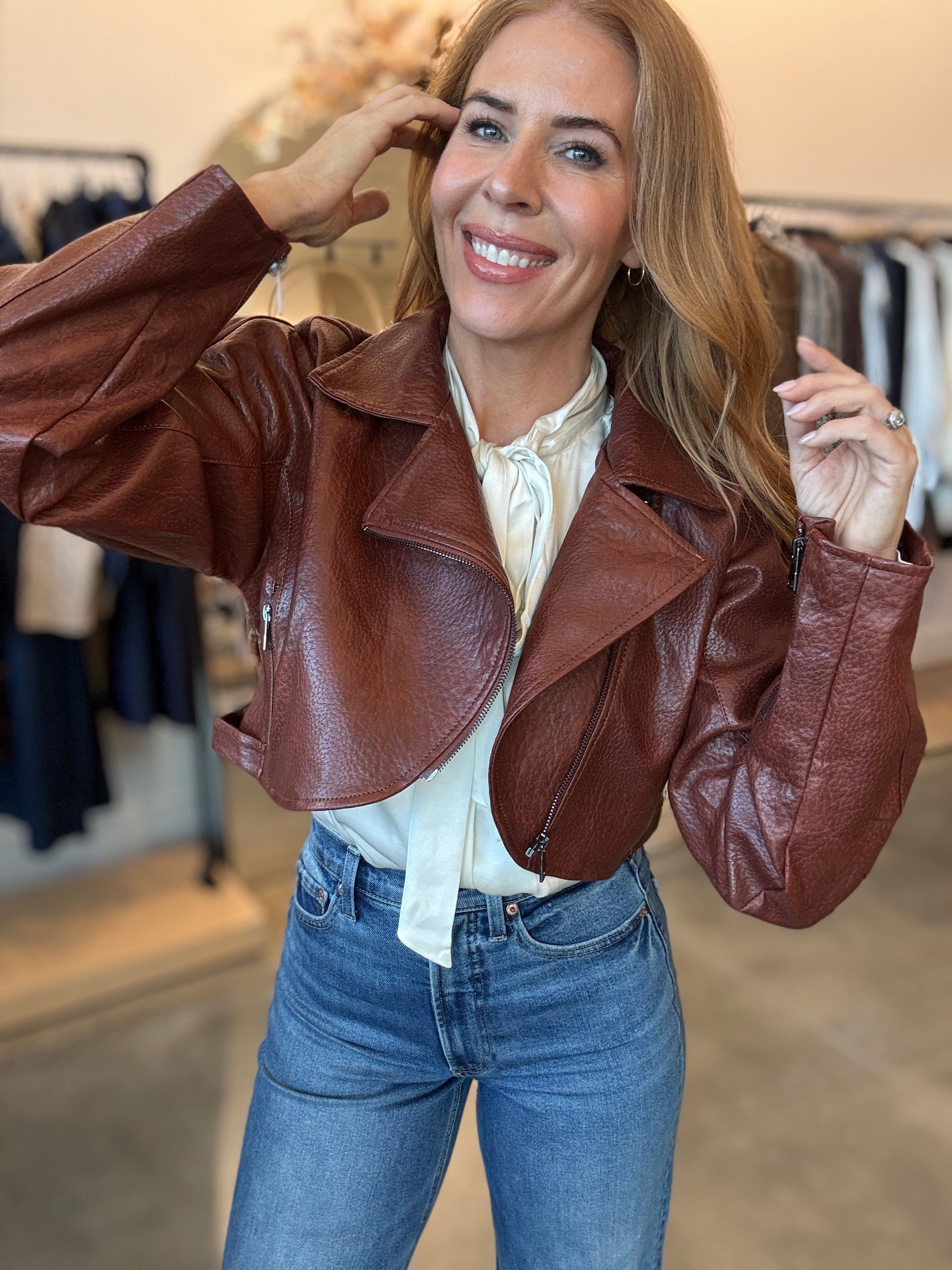 The Viper Cropped Moto Jacket fits just right and comes in a fun rust shade with a cool textured leather finish.