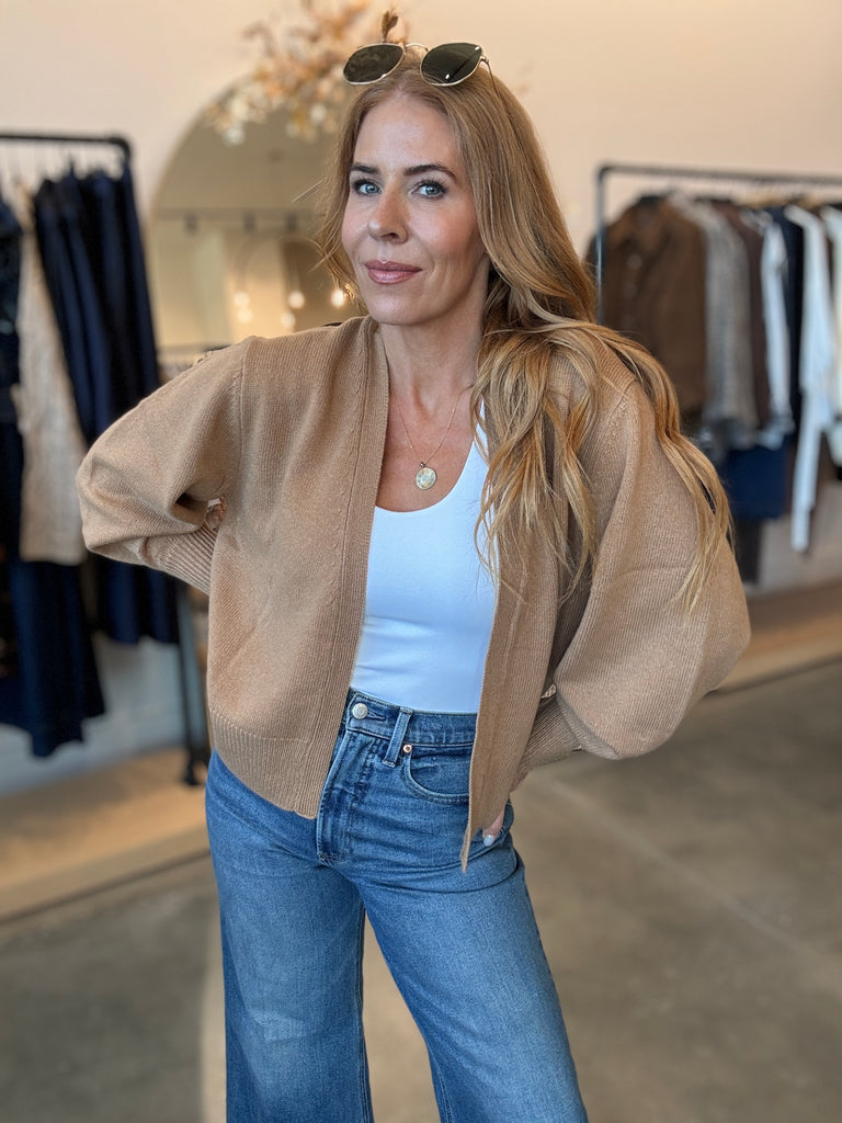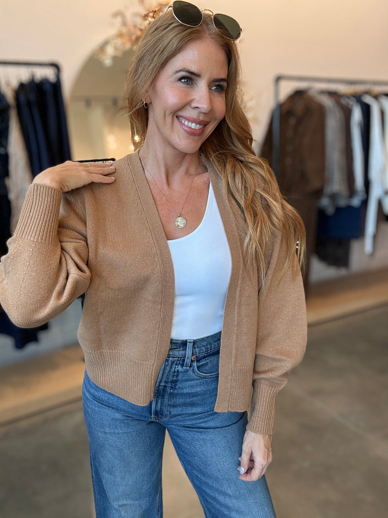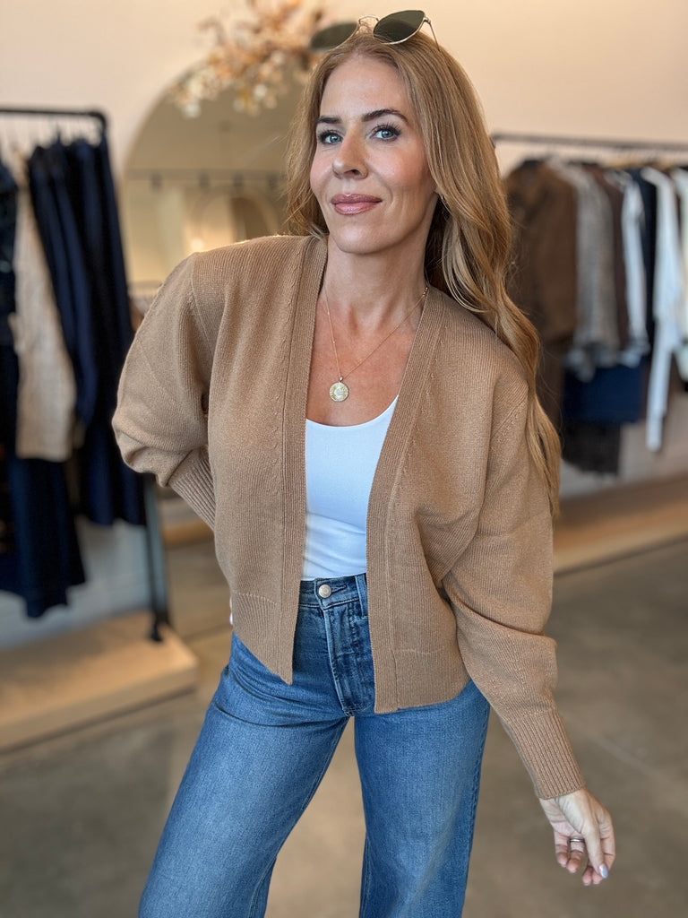 Anna Modern Wool Carmel Cardigan open front. classic staple that will last you years.