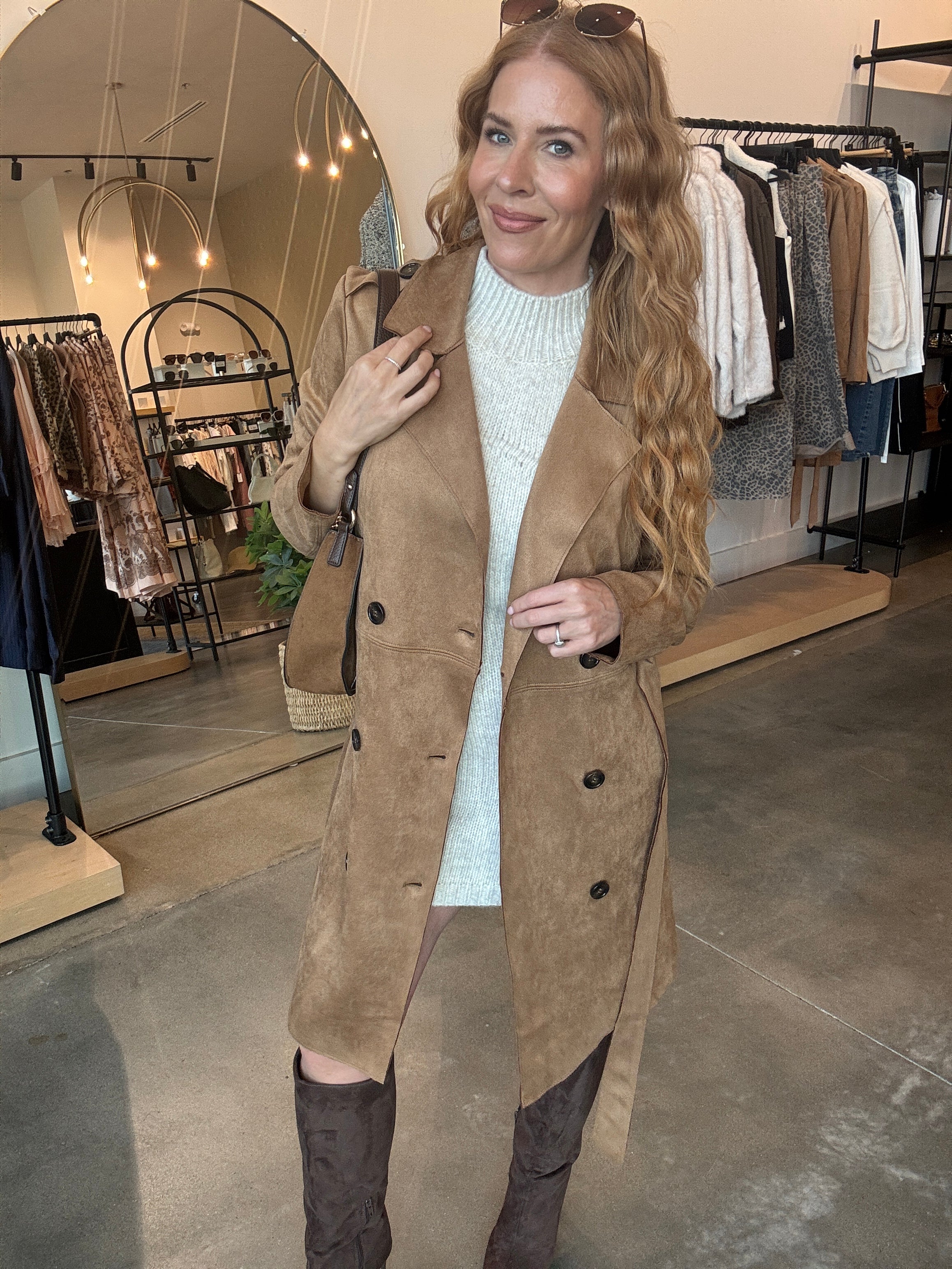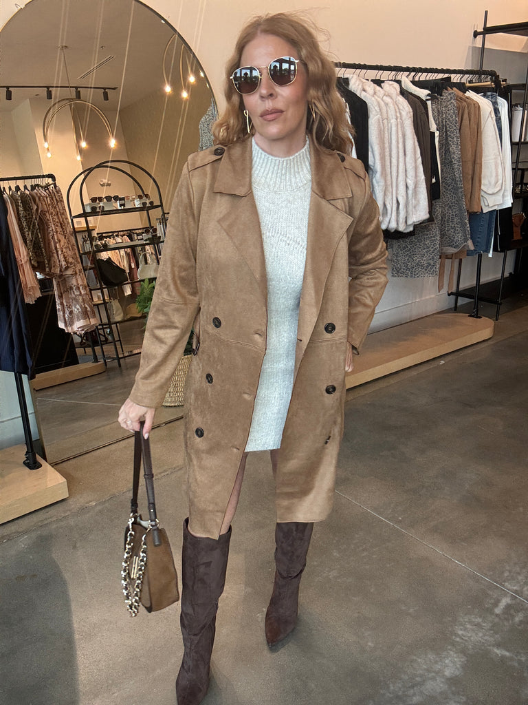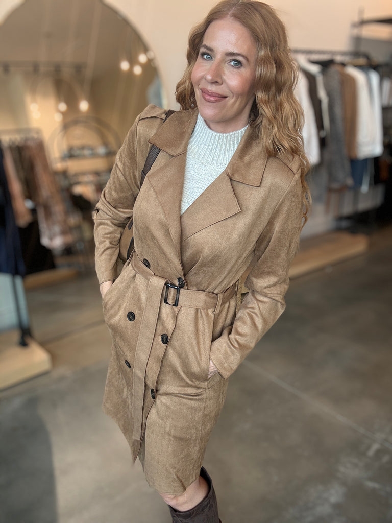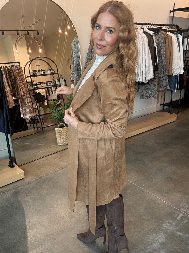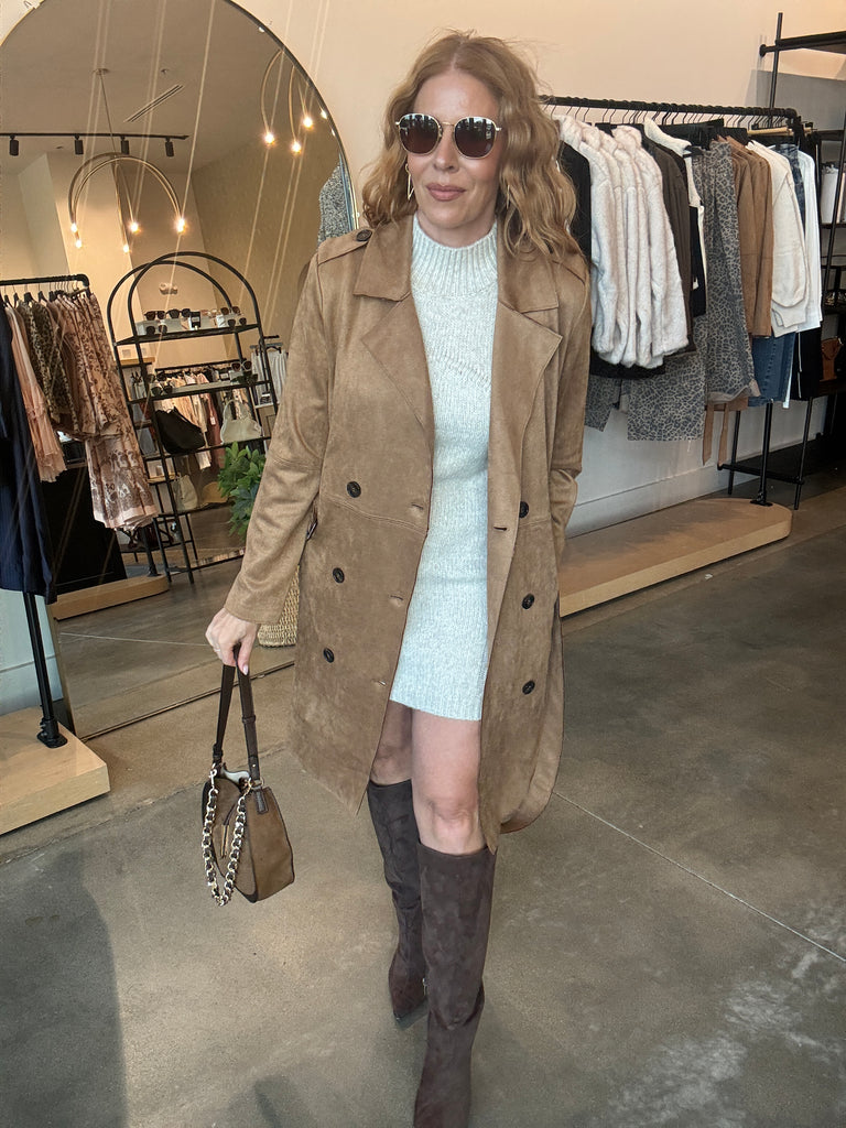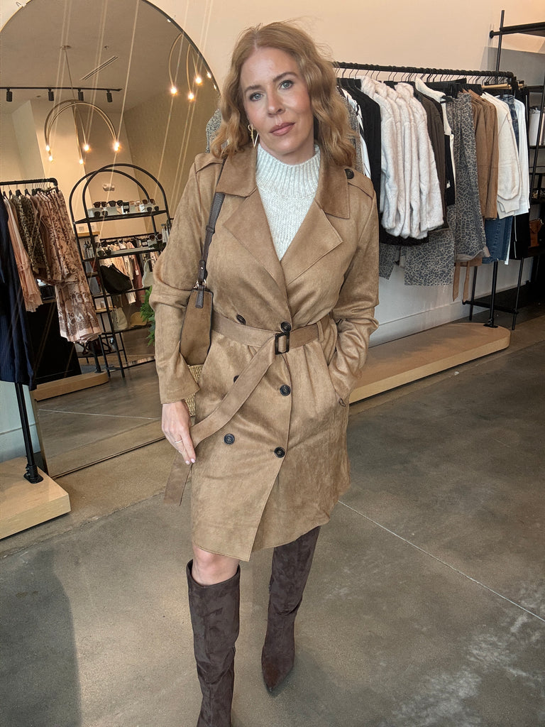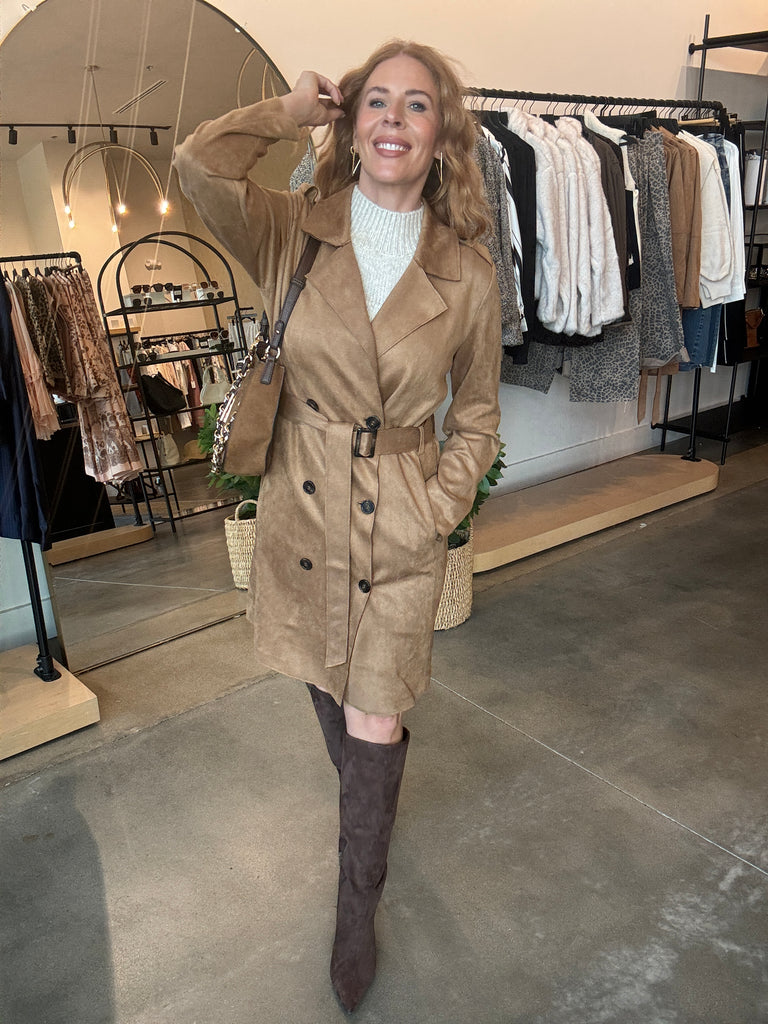 Cozy up in this camel faux suede trench, featuring a chic belt that highlights your waist. Ultra-soft and stylish, it’s just the right touch for any outfit. Andrea loves the Medium but suggests going up a size if you plan to layer with sweaters or chunkier clothes.