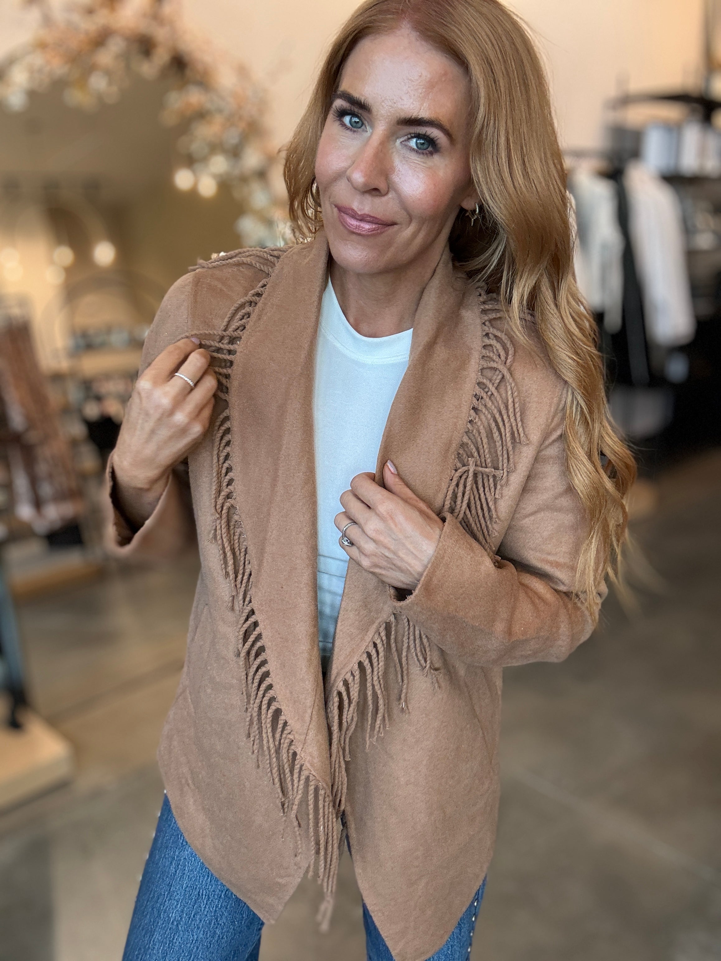 The Fernanda Fringe Coat fits a bit roomy, making it ideal for layering up. It’s a lightweight coat that comes without a bulky liner.