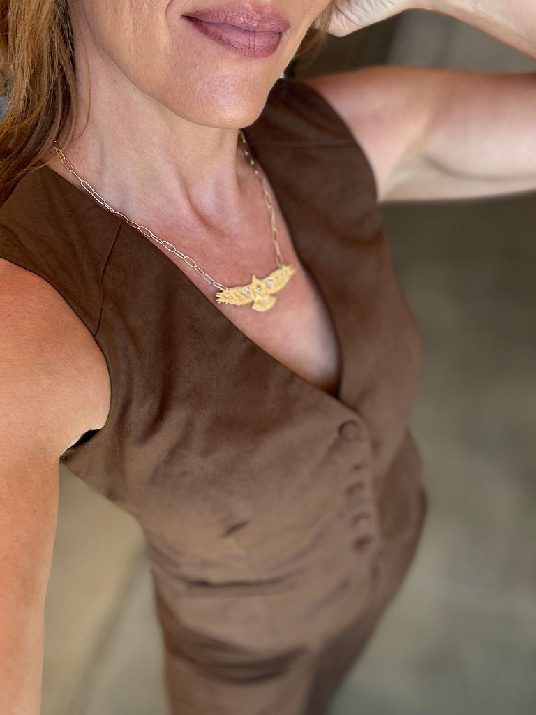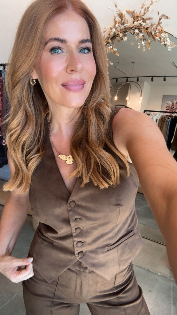 The Suede Button Vest looks absolutely charming paired with denim or styled alongside coordinating pants and a blazer. It features an adjustable back for the perfect fit. Our model is rocking a size small.