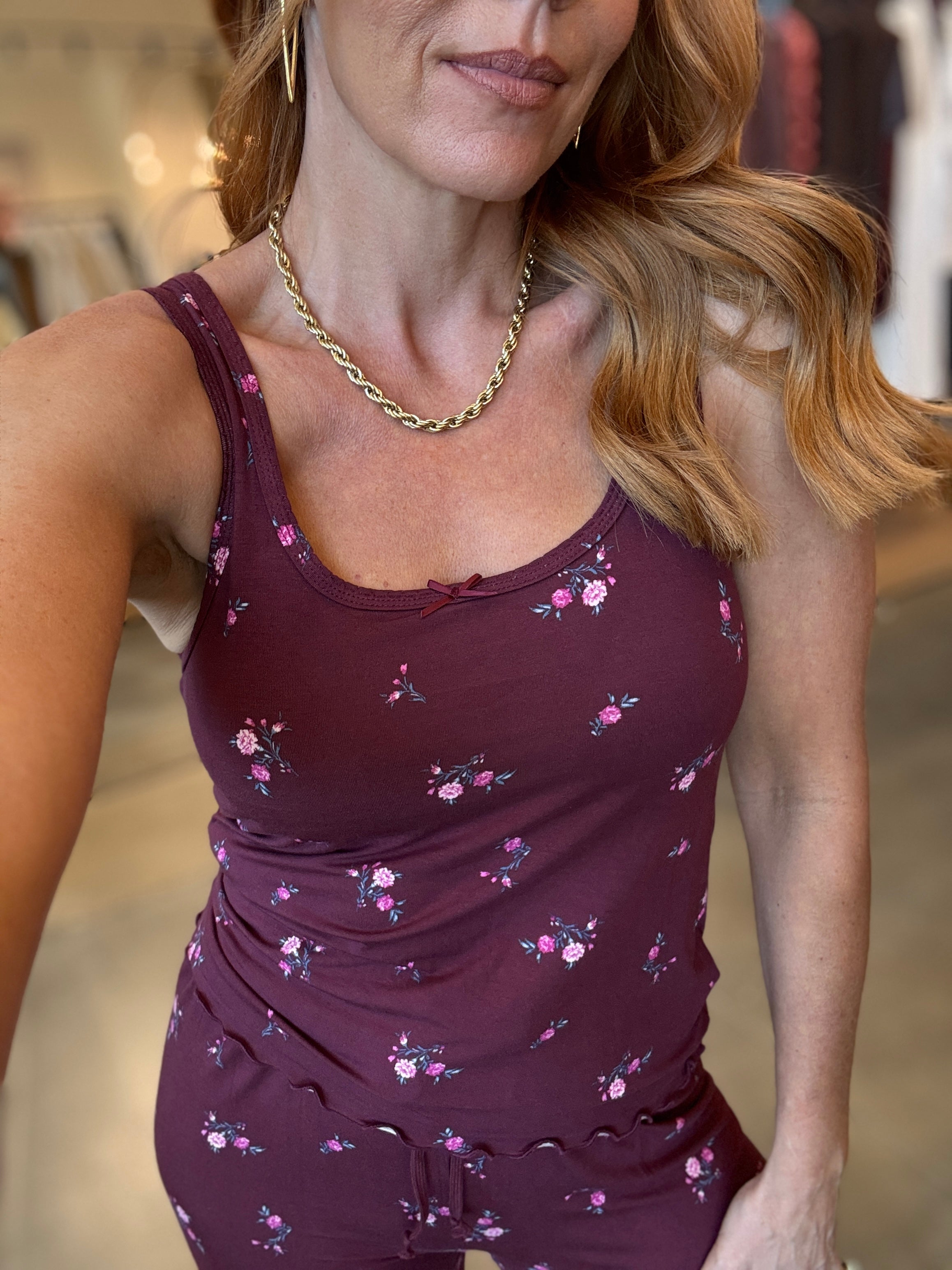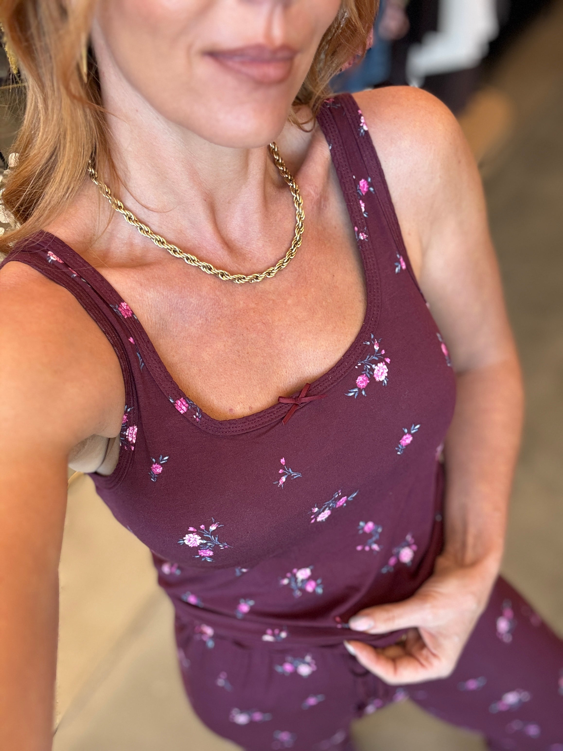 The Shania Ditsy Tank feels like a dream with its super soft, flawless fit. It features a cozy built-in shelf bra, perfect for this style. Pair it with the At Ease Ditsy Lounge Bottoms for the ultimate comfy-chic look.