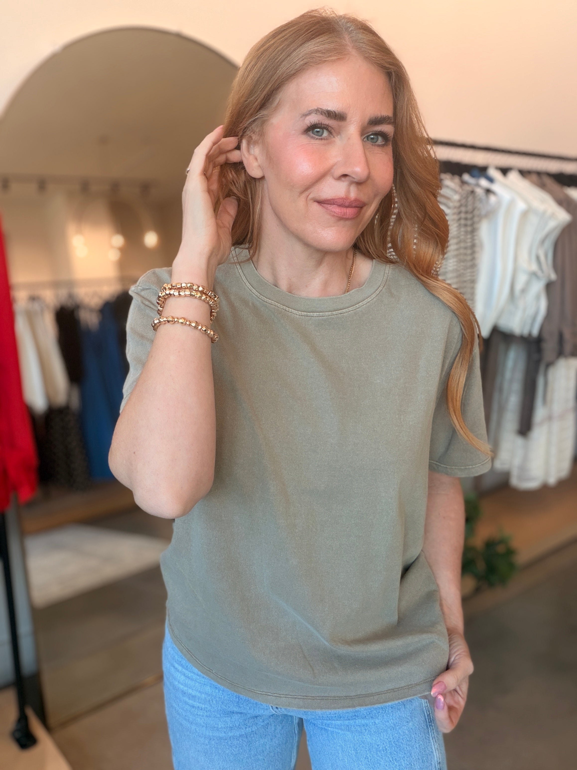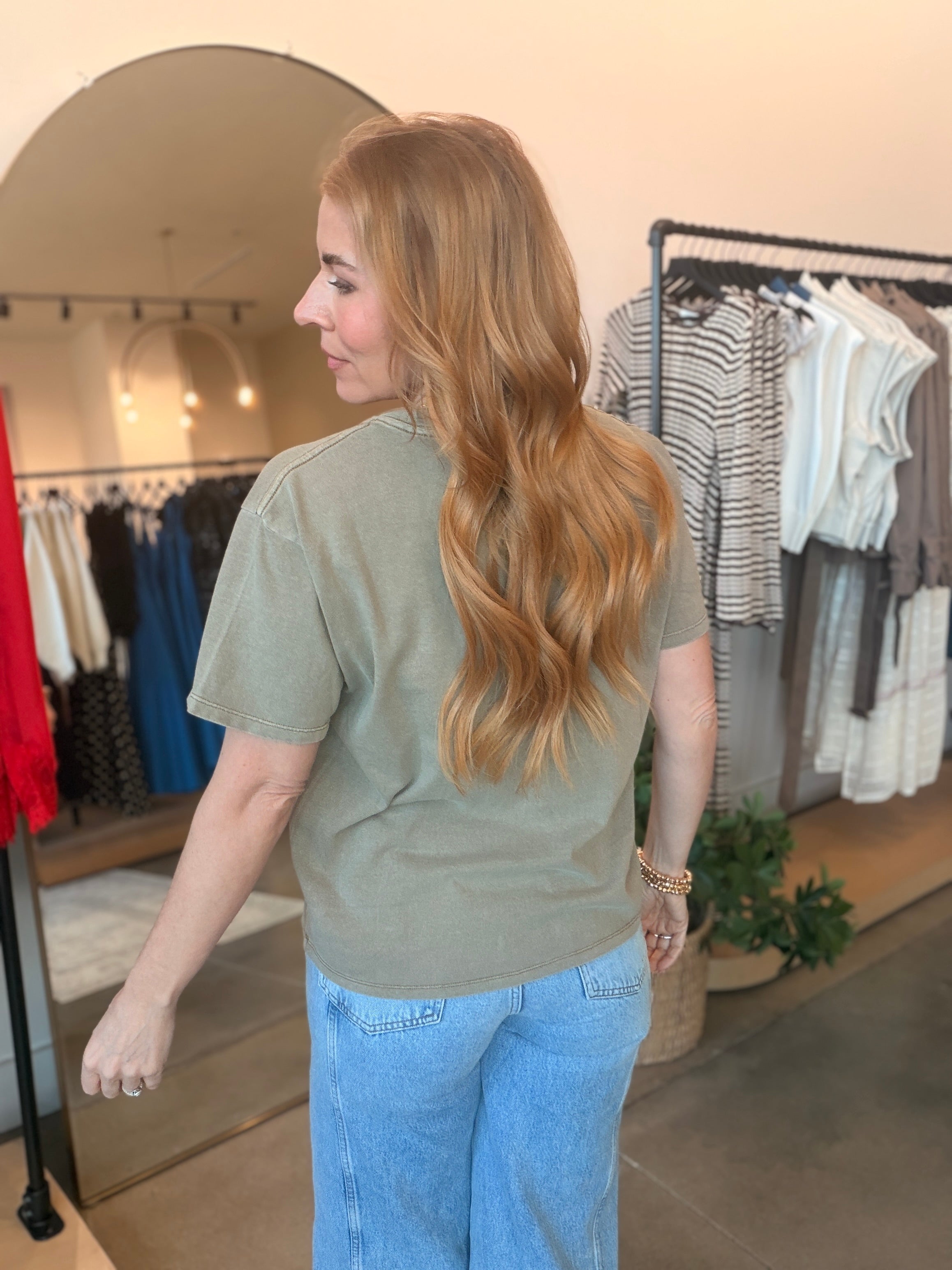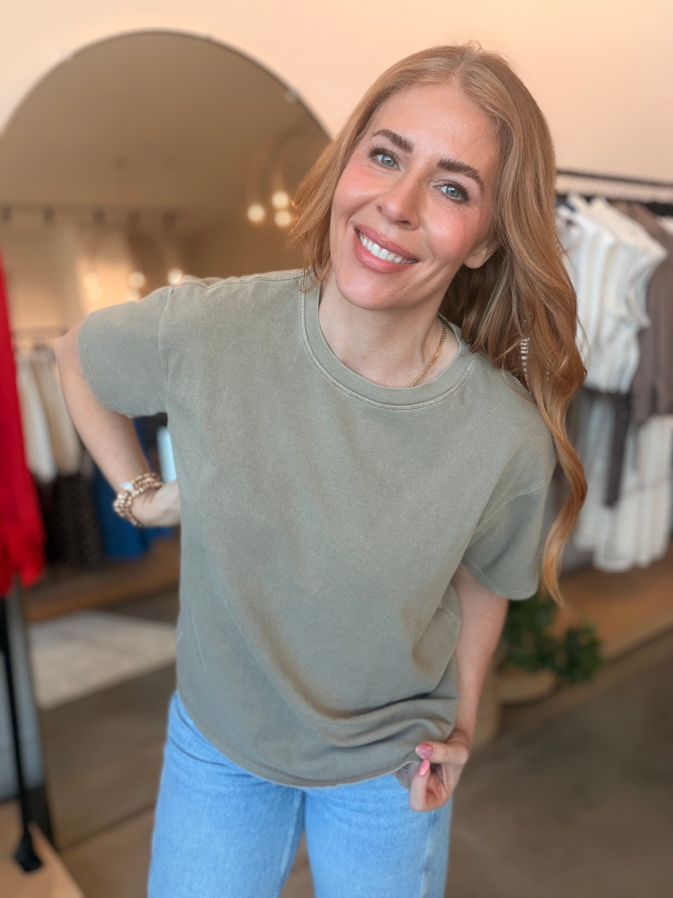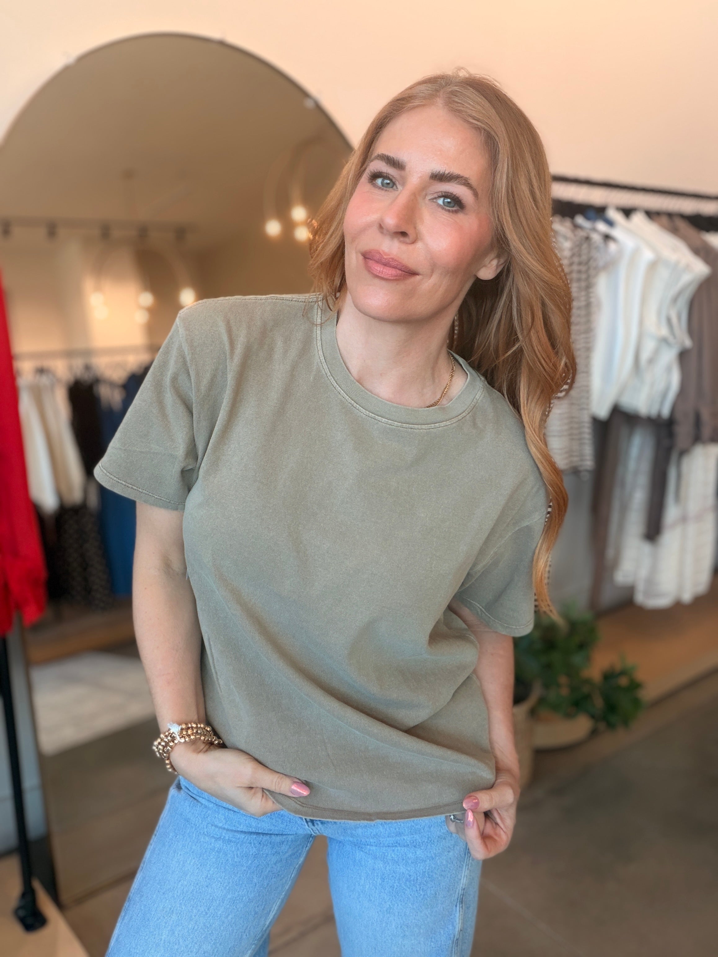 Slip into effortless style with the Ellie Basic Boyfriend Tee in Mocha—a relaxed-fit essential that nails the cozy, oversized vibe. Stick with your regular size to get that perfect boyfriend silhouette. The rich blend of taupe, olive, and brown creates a warm, sophisticated mocha tone that pairs with everything in your closet.