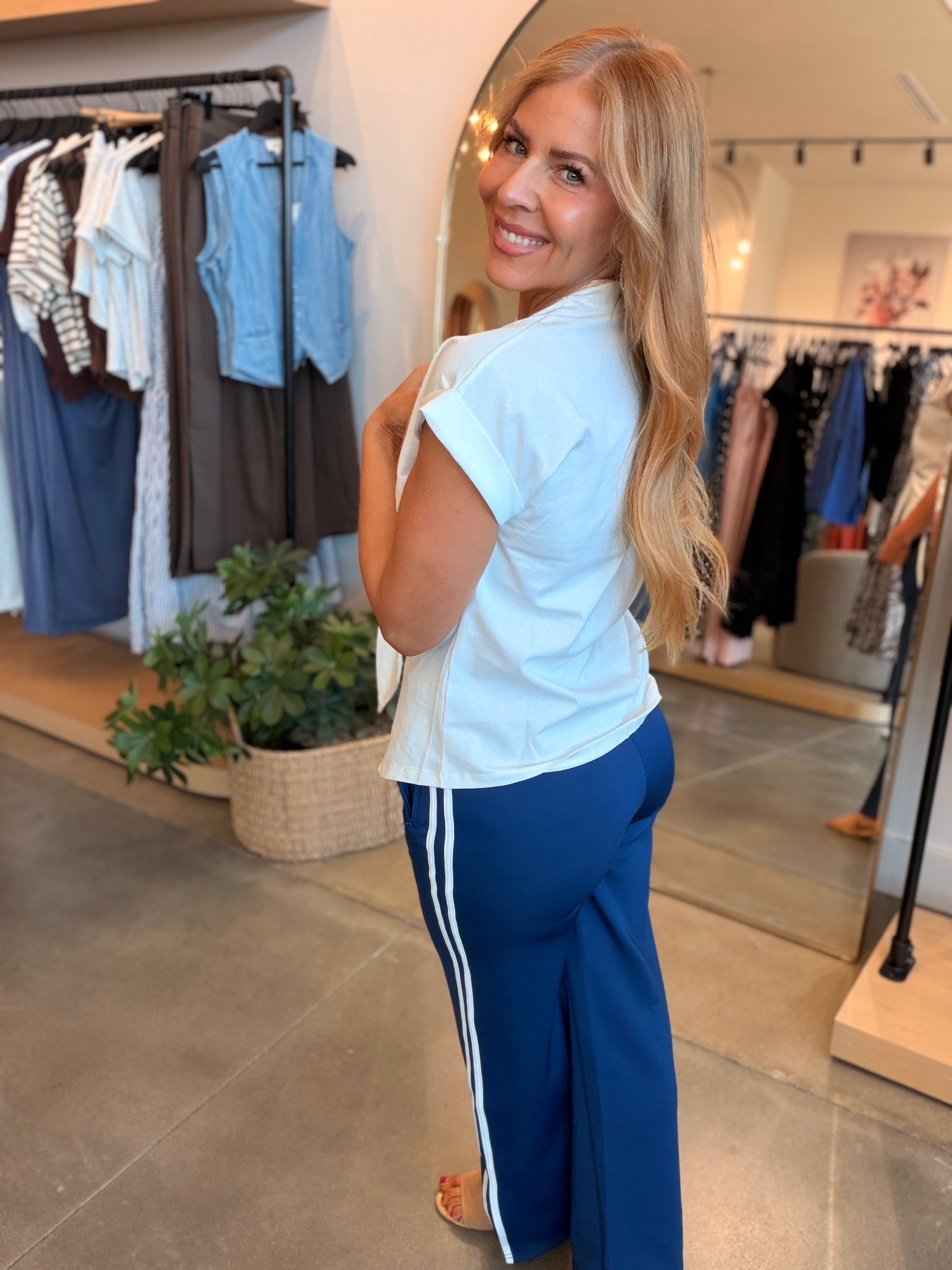 Slip into comfort with the Sonia Navy & White Joggers—a playful pair that's ready for anything. The striking navy hue keeps things fresh while the relaxed fit makes them your go-to for morning strolls, quick errands, or jet-setting adventures. True to size and endlessly versatile, these joggers prove that looking effortlessly put-together doesn't require any fuss.