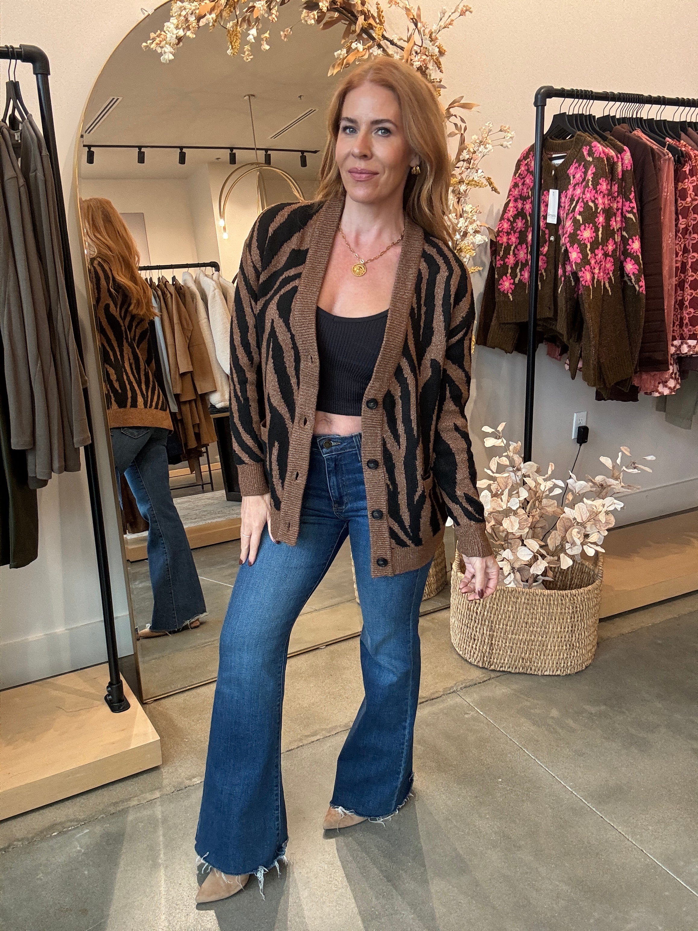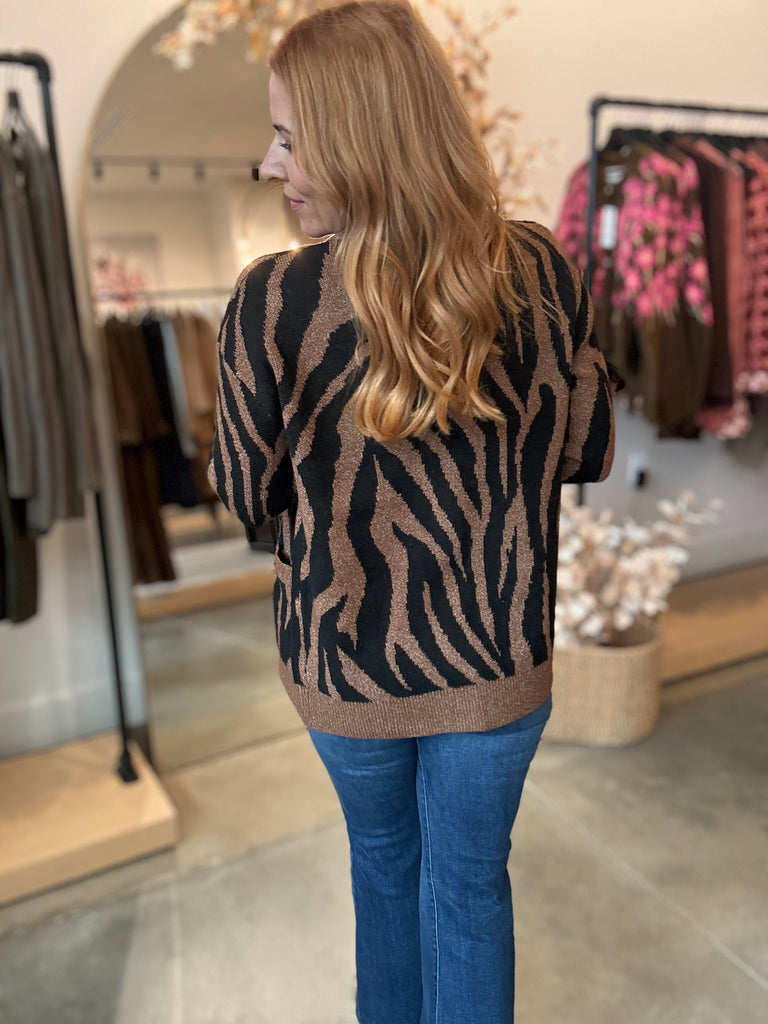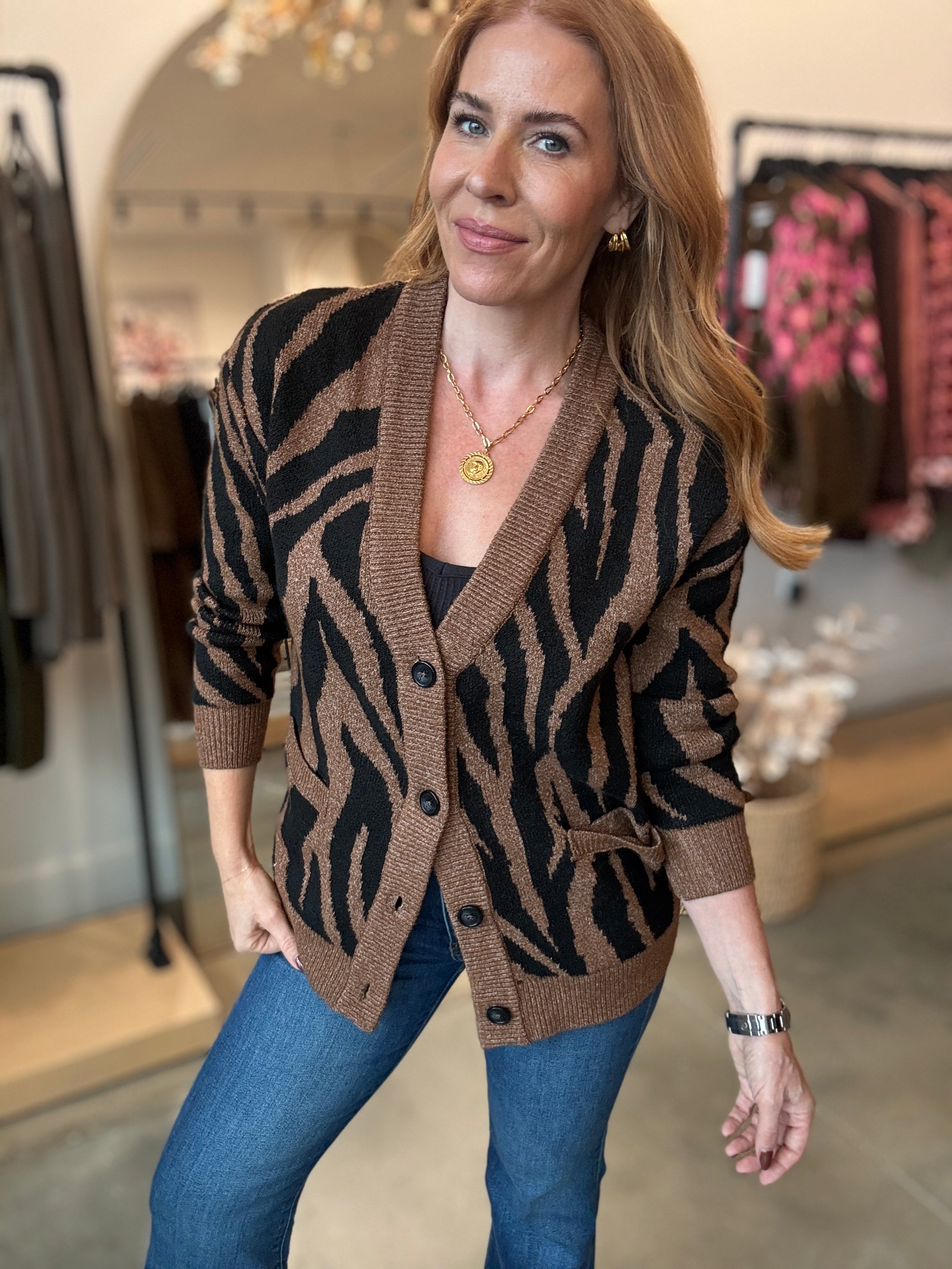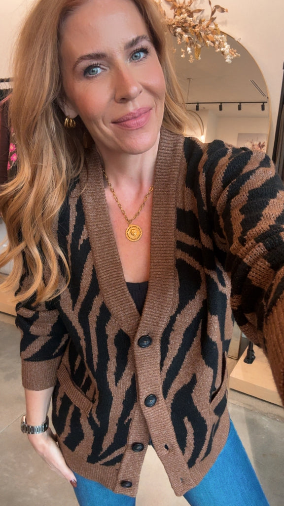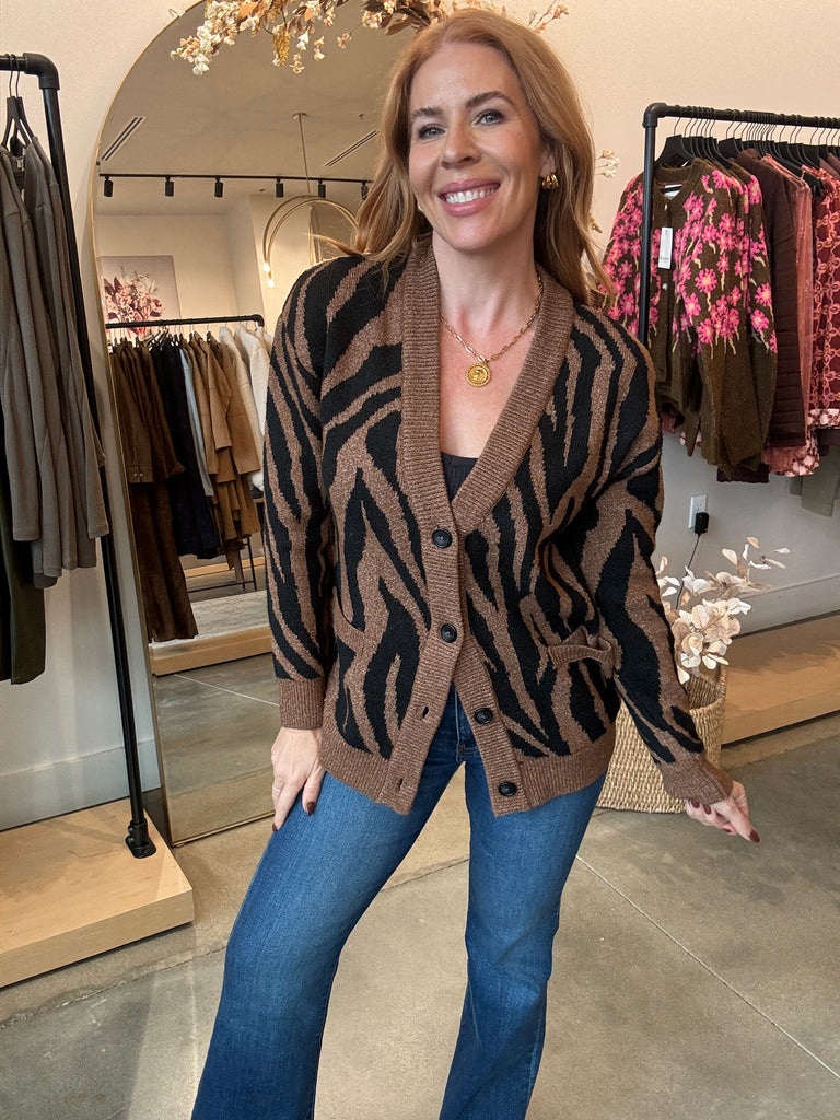 Strut your stuff in this Tiger Cardigan—a brown and black stunner that's impossibly soft and screams luxury. Layer it over a tank or turtleneck bodysuit for instant cool-girl vibes, then pair with leather or your favorite denim to complete the look. High-quality construction meets playful style in one cozy essential that feels as good as it looks.