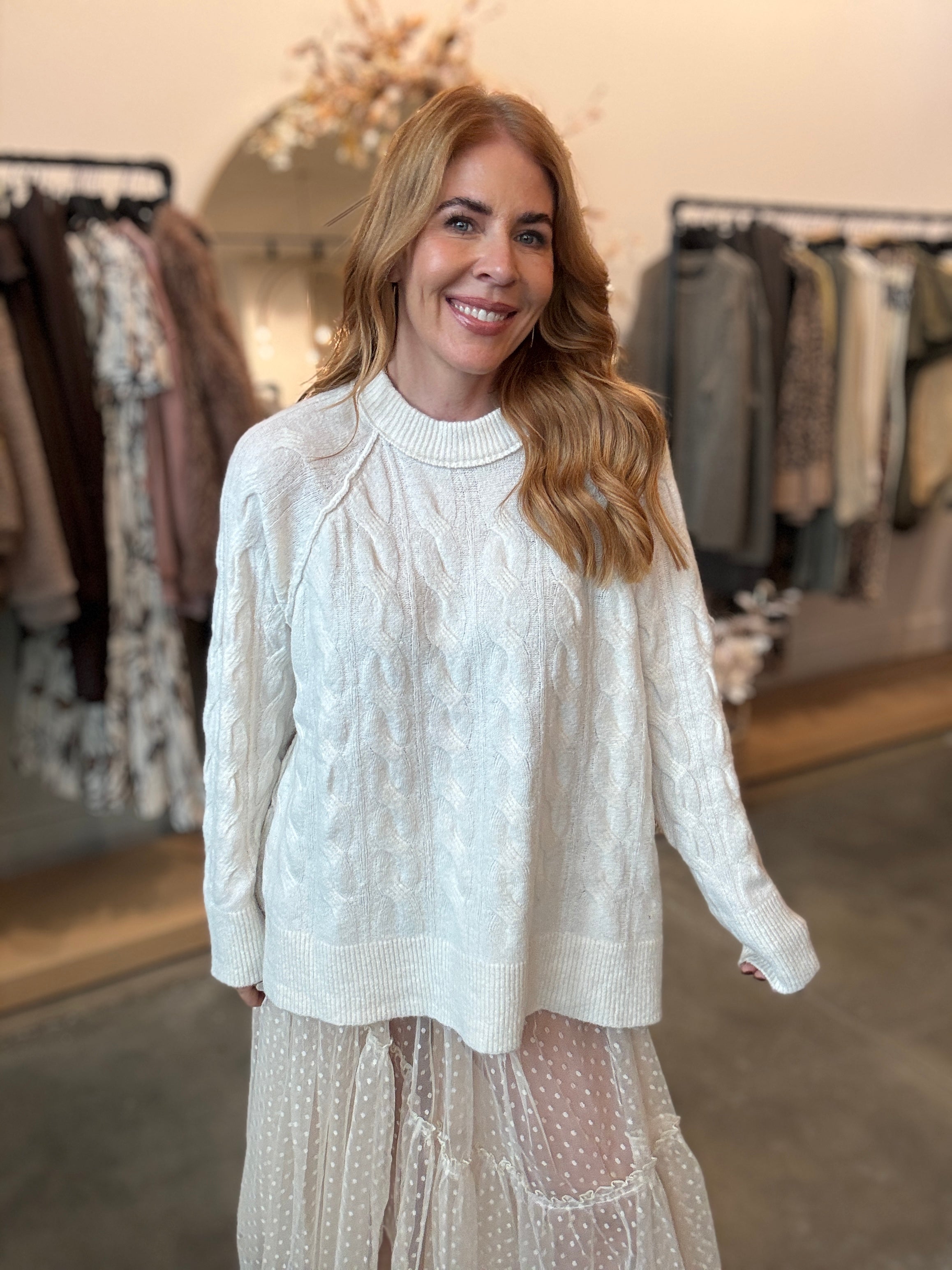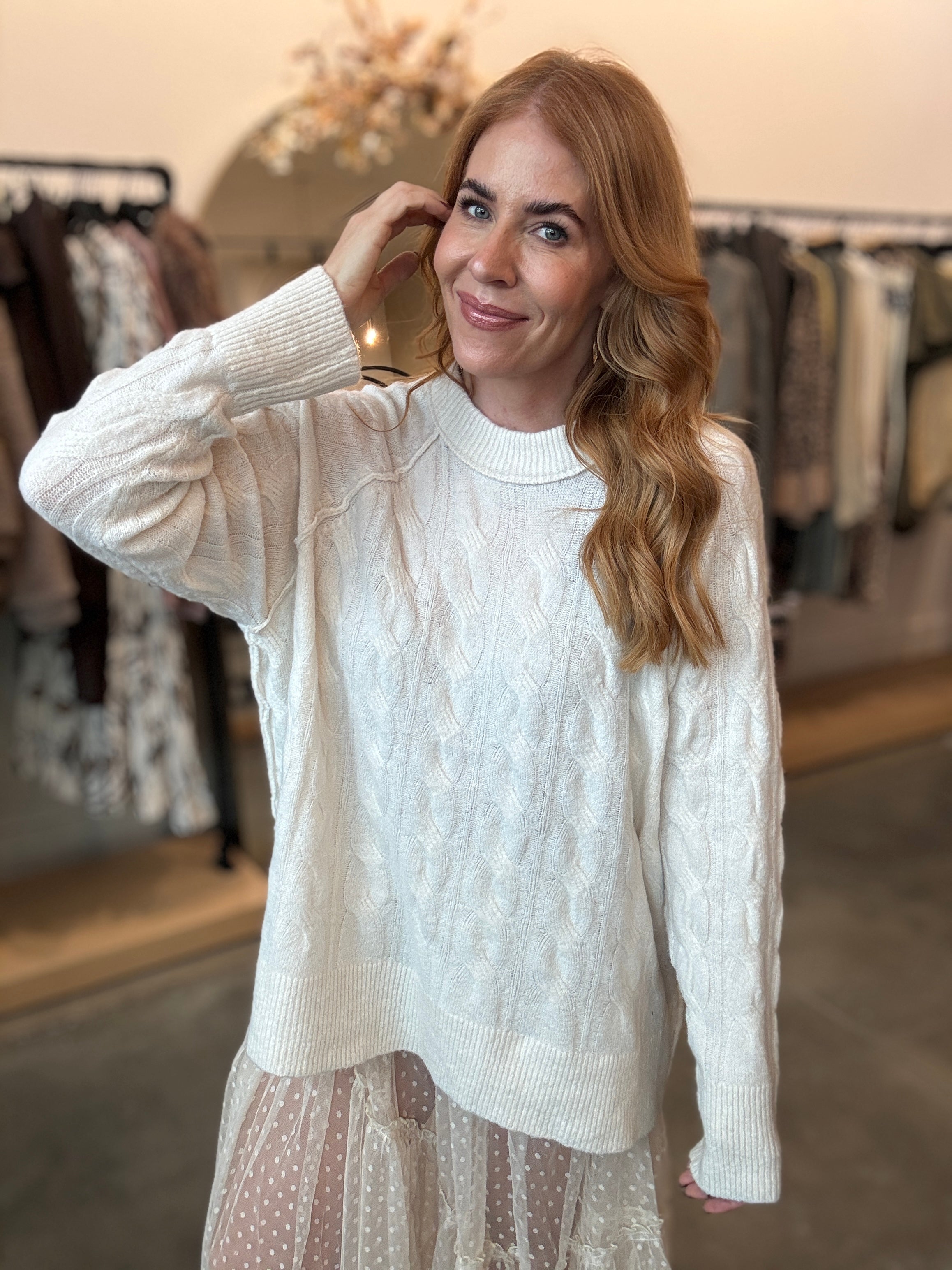 Slip into cozy vibes with this cream cable knit sweater that's basically a warm hug you can wear. The oversized fit means maximum comfort without sacrificing style, while the soft fabric keeps things feeling luxe against your skin. Whether you're lounging at home or running errands around town, this laid-back essential works overtime in your rotation.
