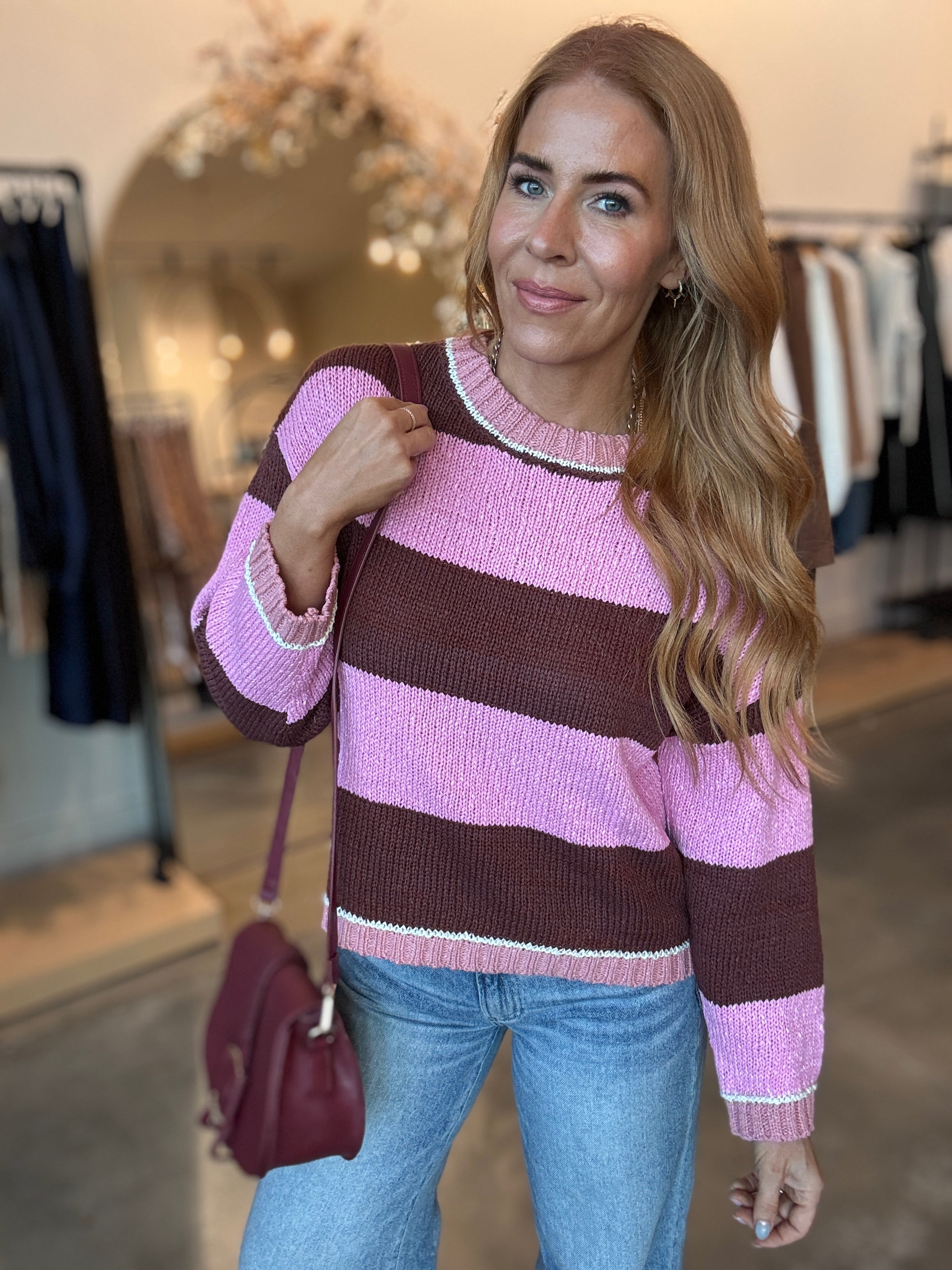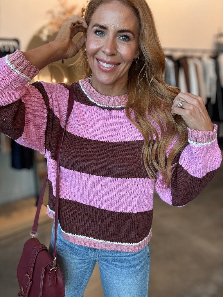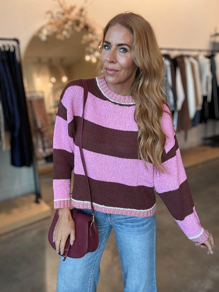This pink and brown/burgundy striped sweater brings cozy charm with its boxy fit and super soft feel. It’s a fun, easygoing piece that looks great paired with your favorite denim. Model is rocking a size small.