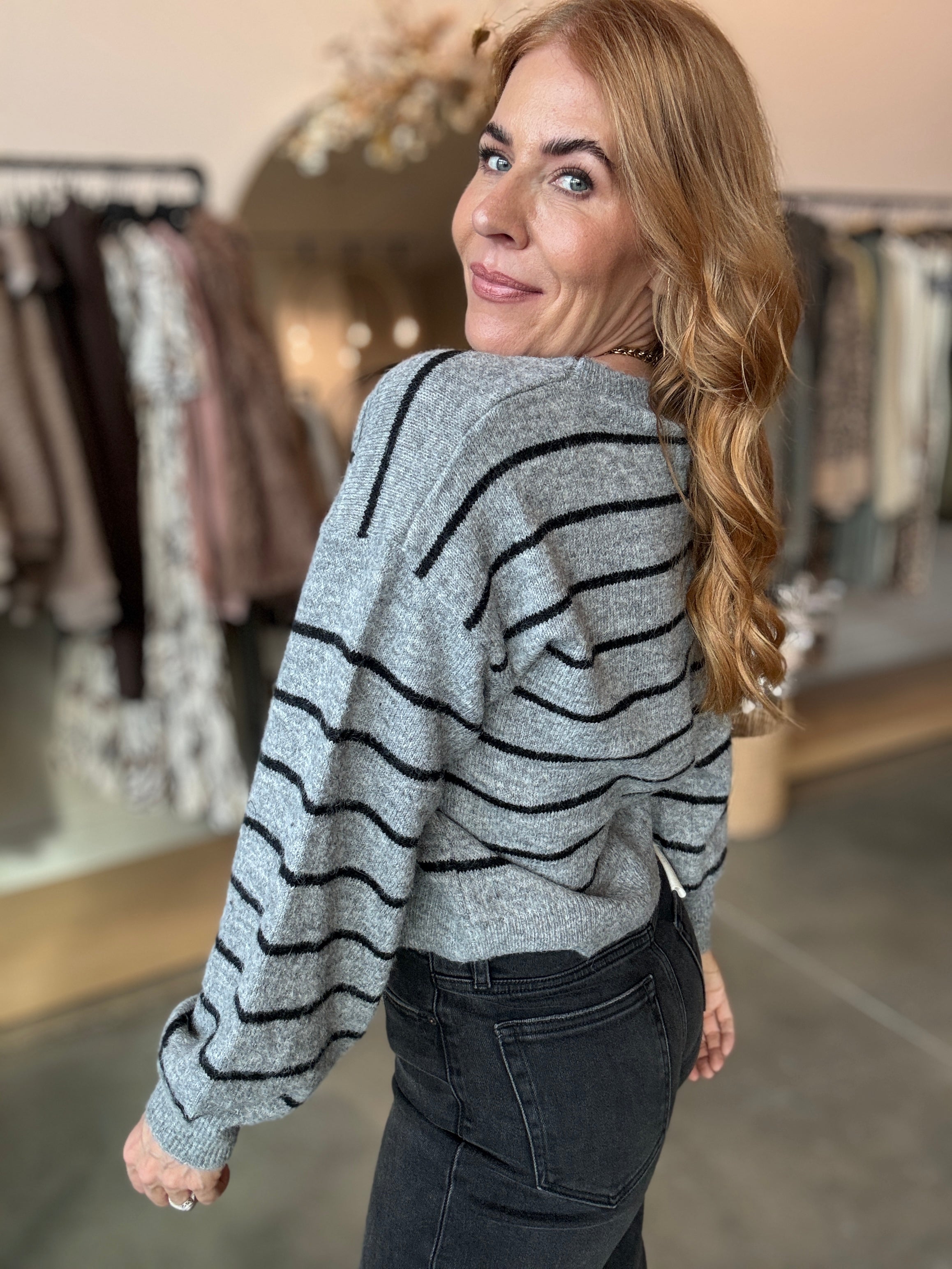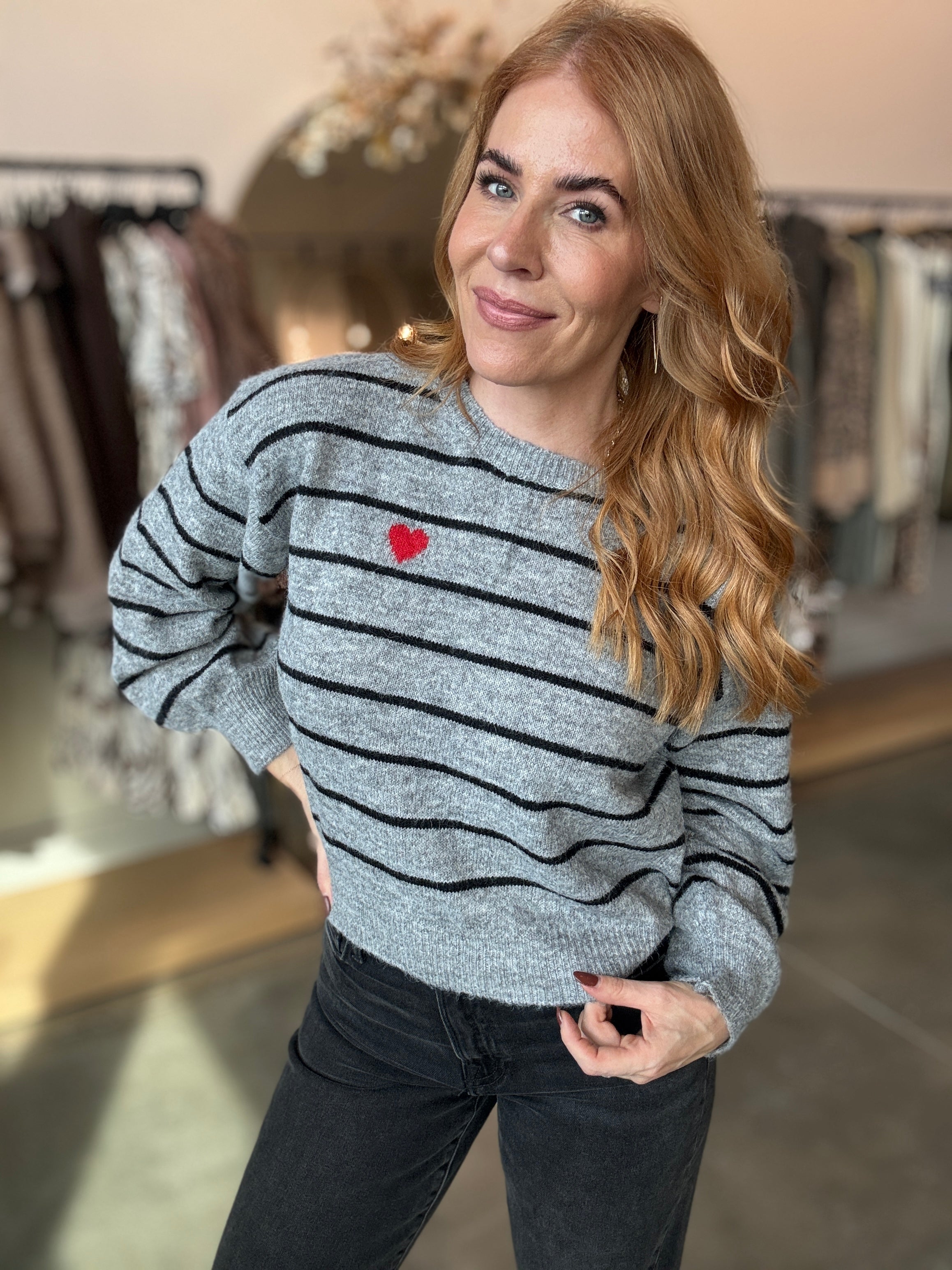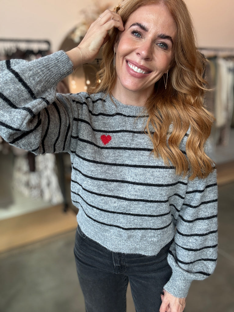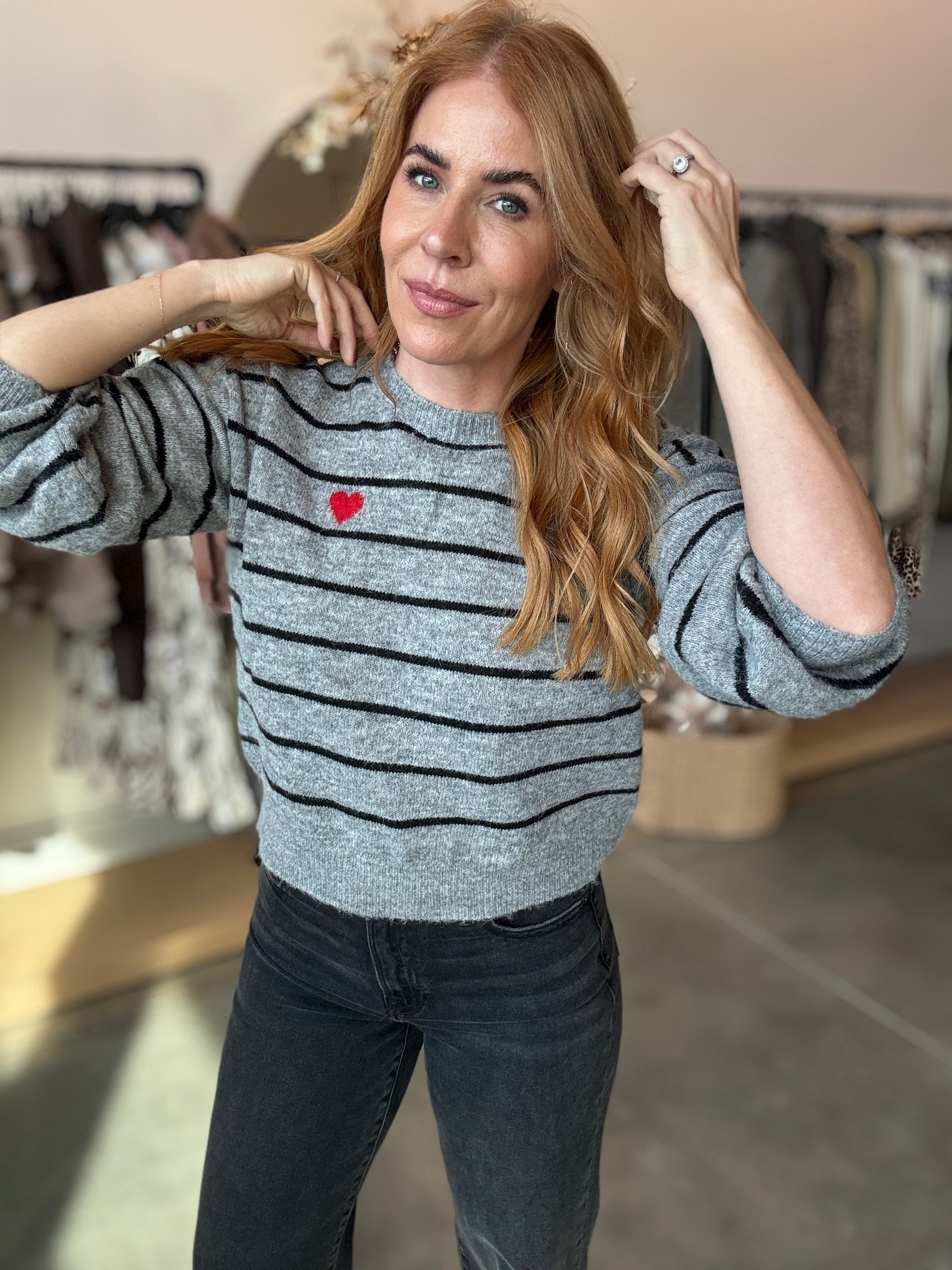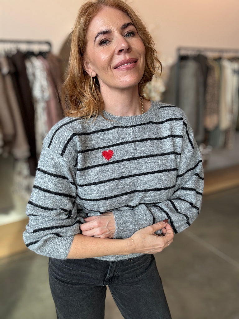 Wrap yourself in cozy charm with this delightful striped heart sweater. Crafted in the softest grey knit, it features an endearing heart design that captures pure sweetness. The relaxed one-size-fits-most fit makes it effortlessly wearable for anyone. Perfect for snuggling up or gifting to someone special who deserves a little extra love.