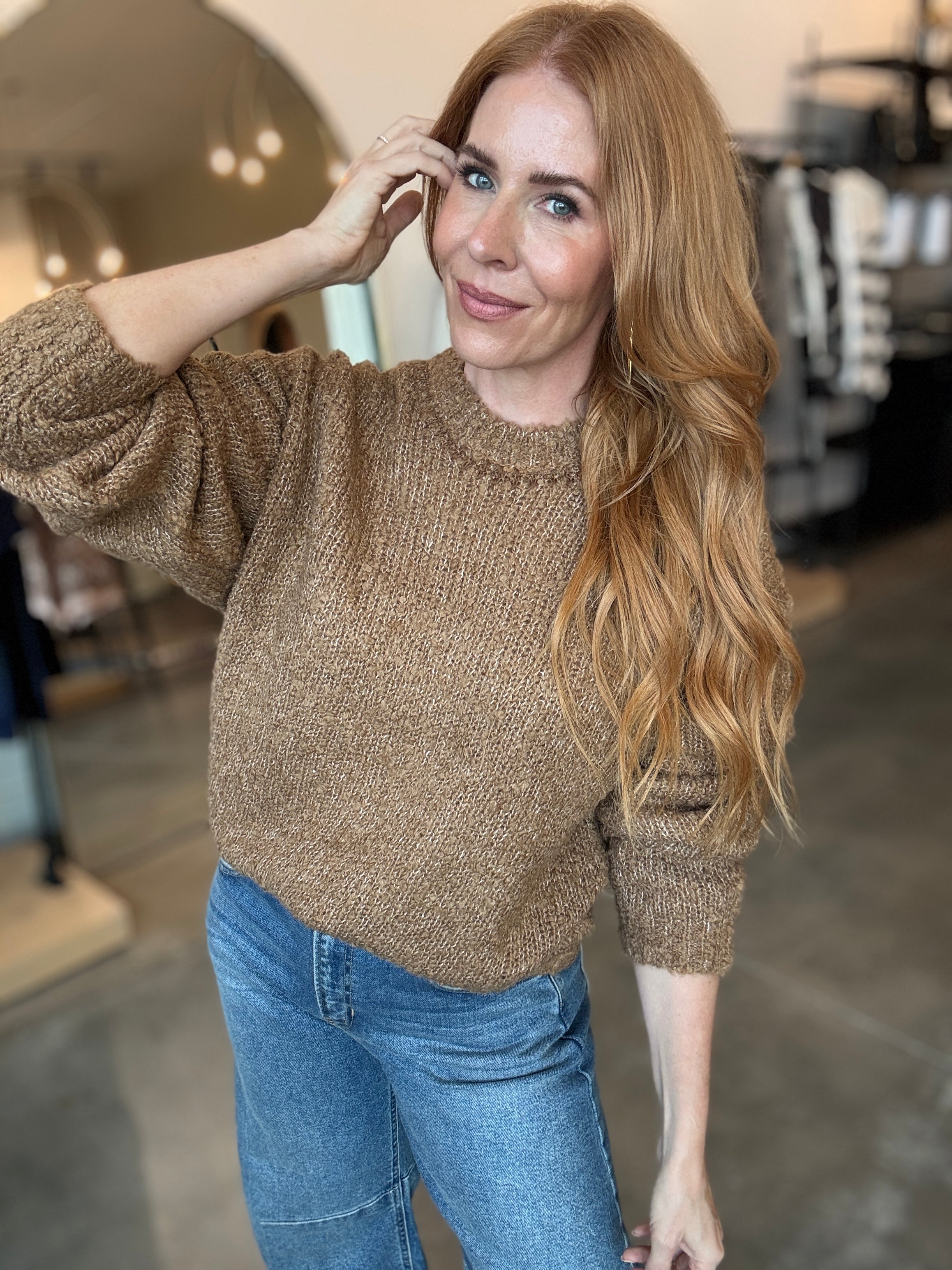 Crew neck, Long sleeve, Lightweight, Heavy soft wash, Relaxed fit, High Pile Poodle Yarns: 56% Acrylic, 17% Polyester, 12% RWSm 9% Nylon 6% Alpaca
