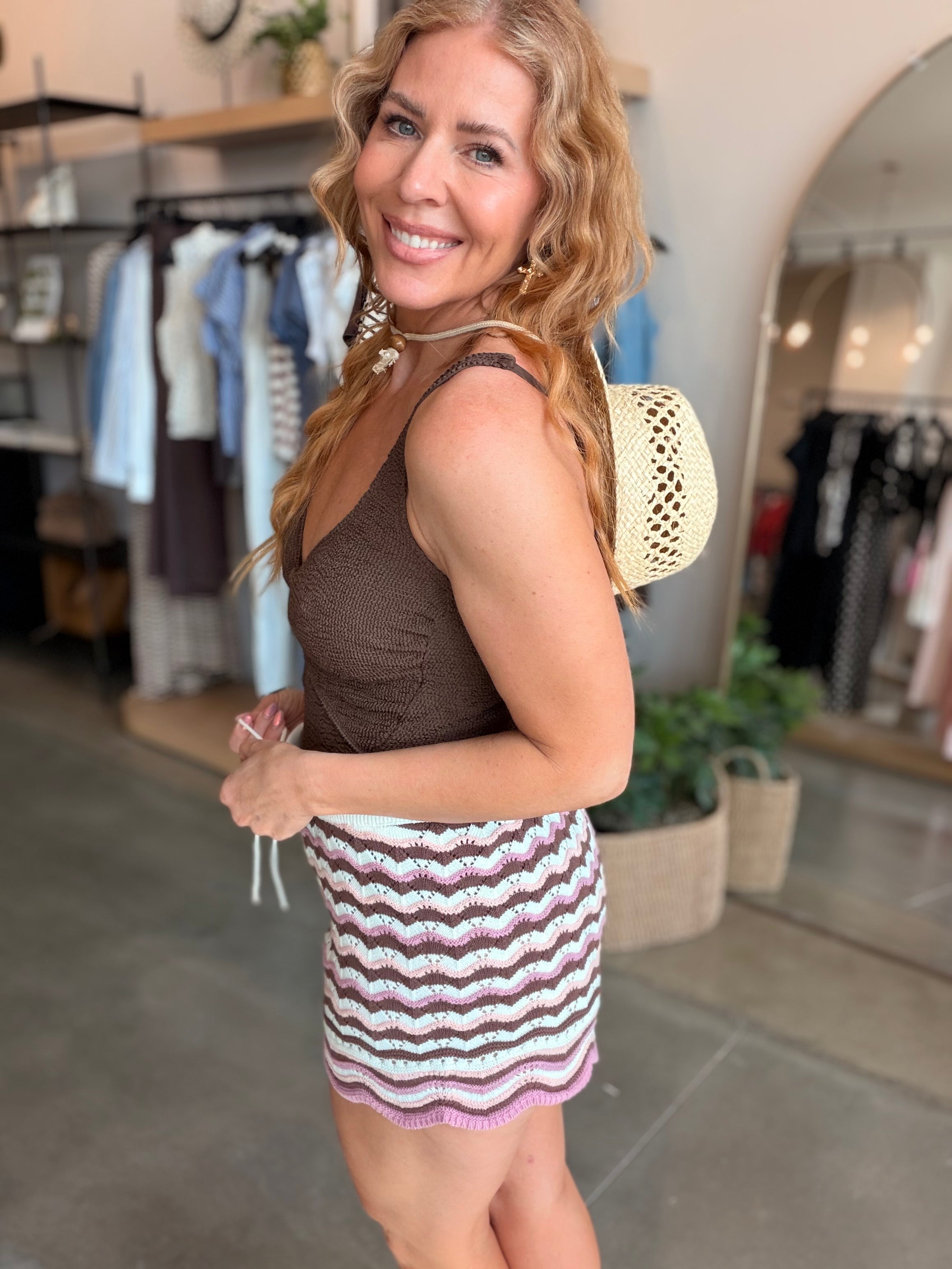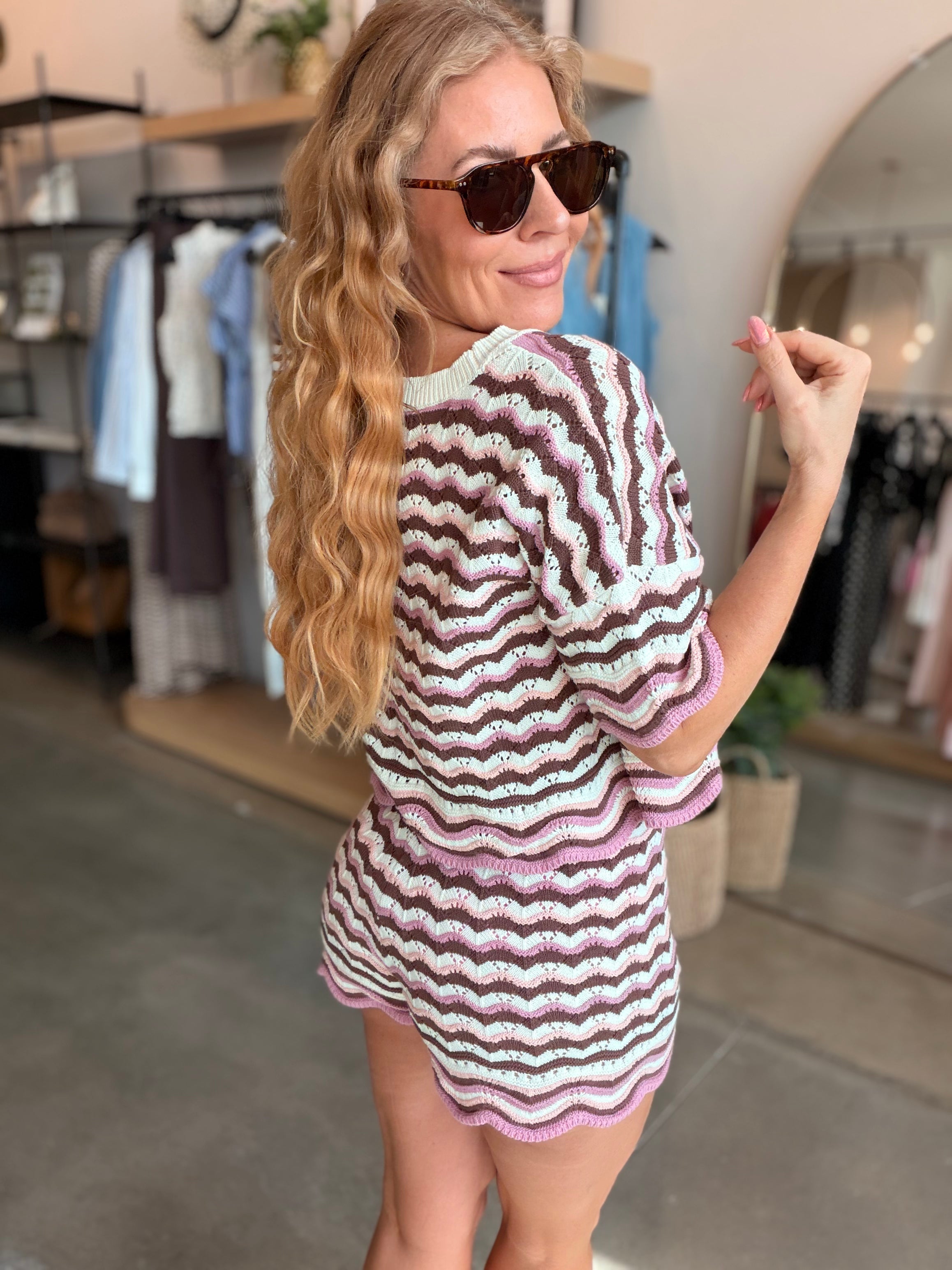 The Sunchaser Shorts are an effortless pick that look perfect when paired with a bikini top or the matching crop top. The high waist, colorful crochet knit, scalloped hem and drawstring waist will have you reaching for these all the time. A new peach, cream and blue colorway has entered the chat and we are crushing big time.