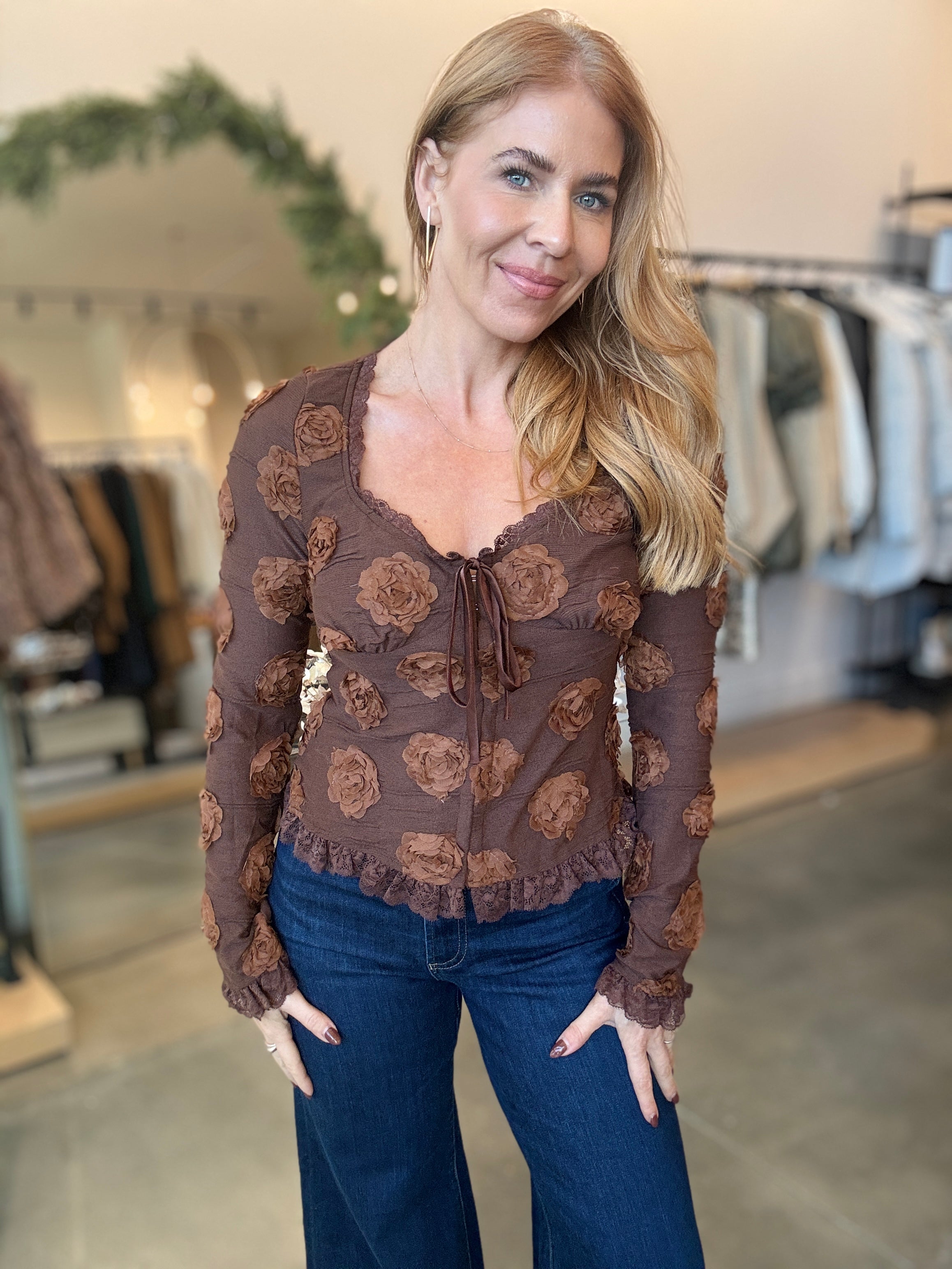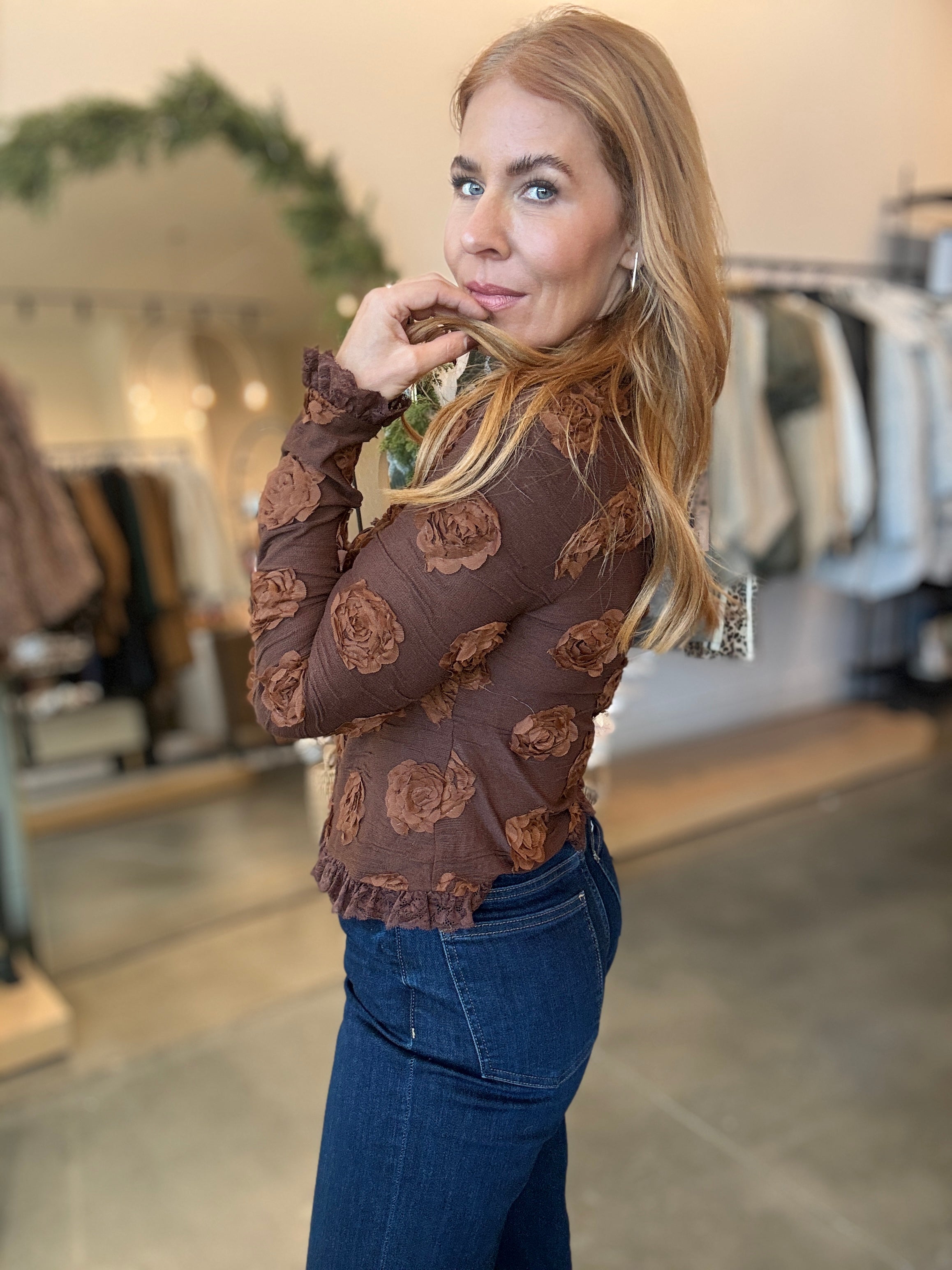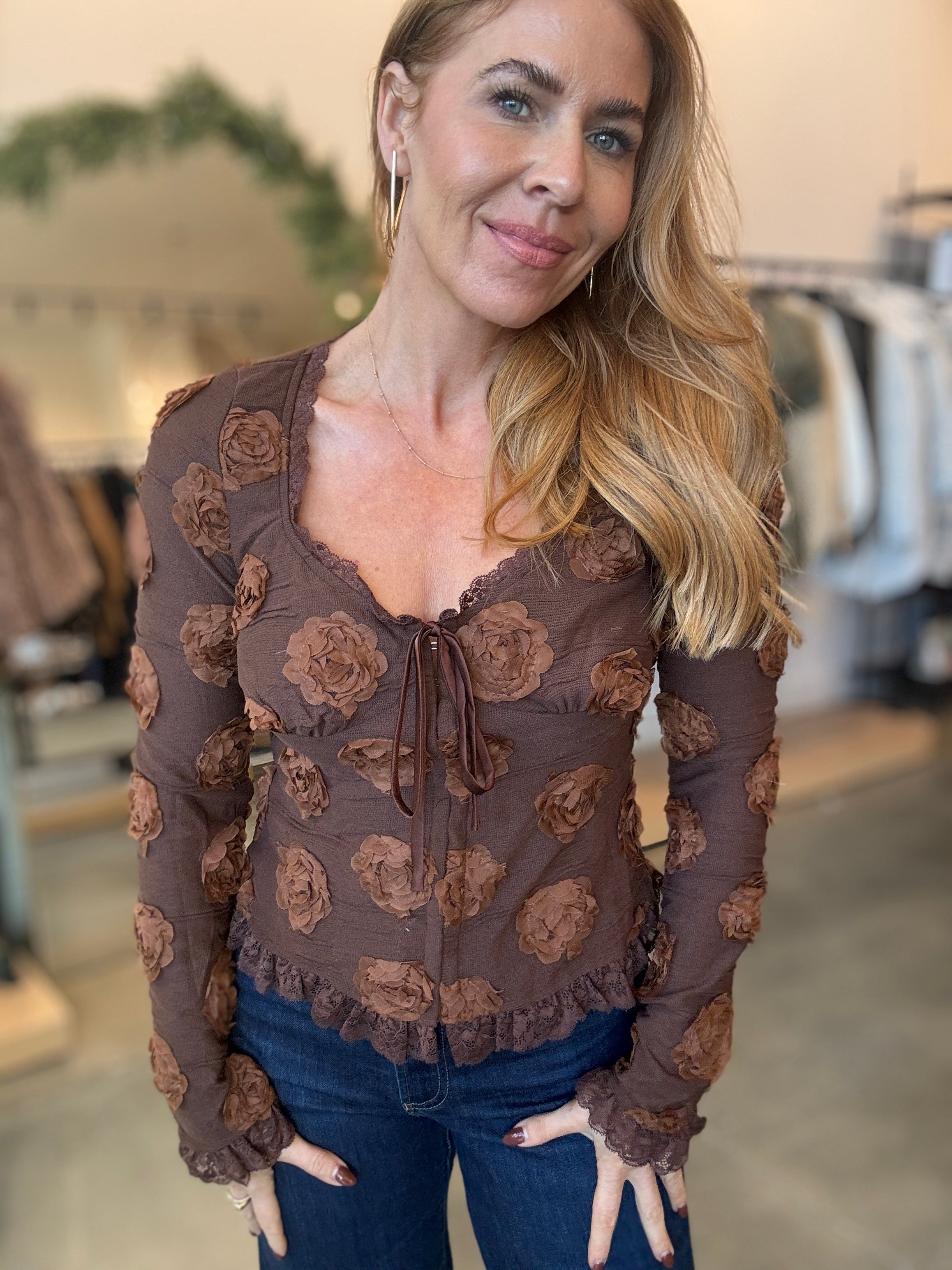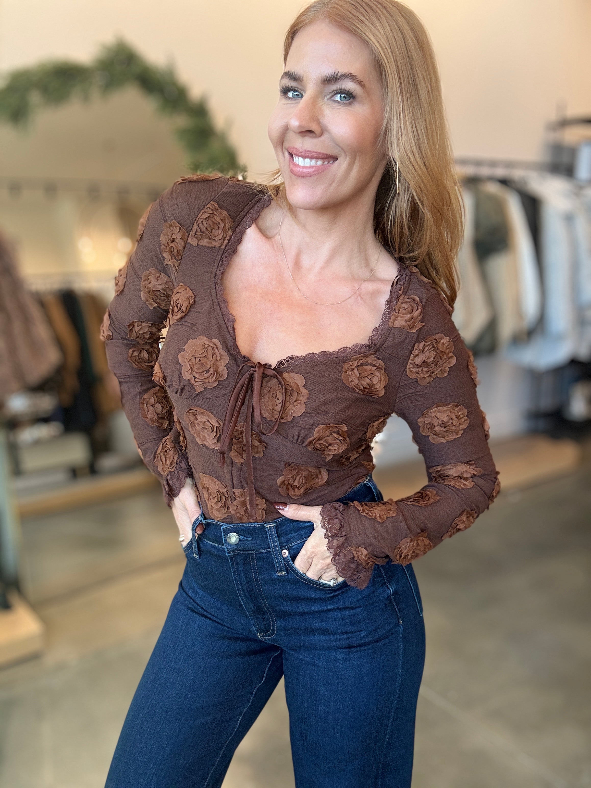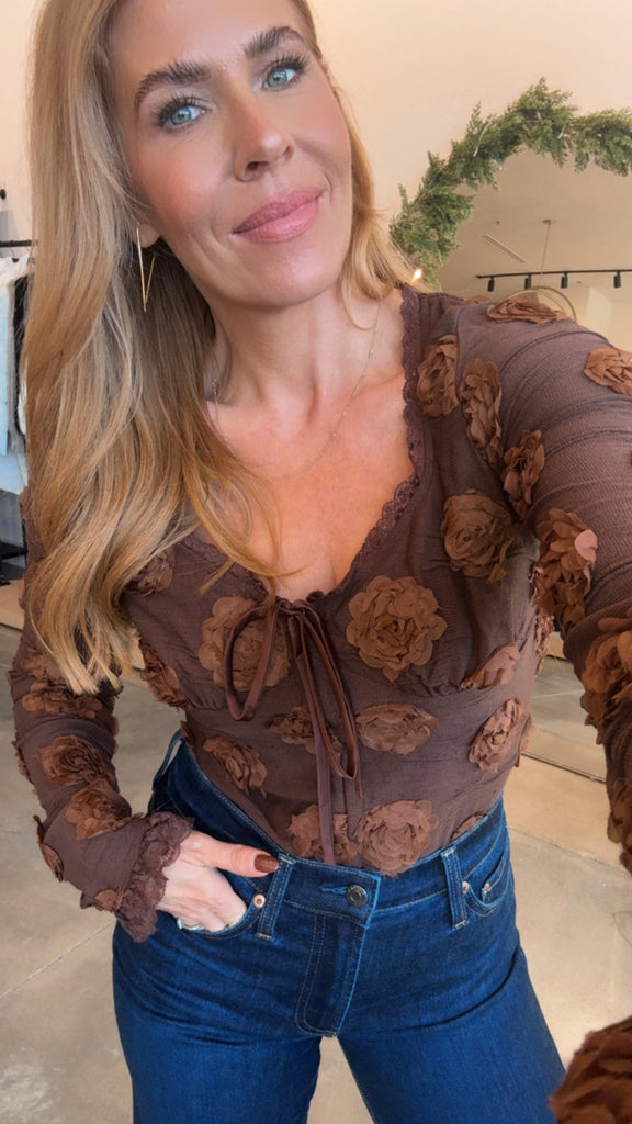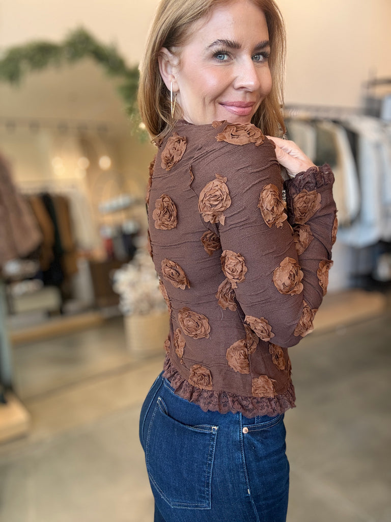 Slip into this charming chocolate brown top and let those dimensional roses do the talking. With its playful 3D floral design, it's the perfect blend of romantic vibes and modern style. Runs true to size, so you can grab your usual fit and get ready to turn heads with this adorable statement piece.
