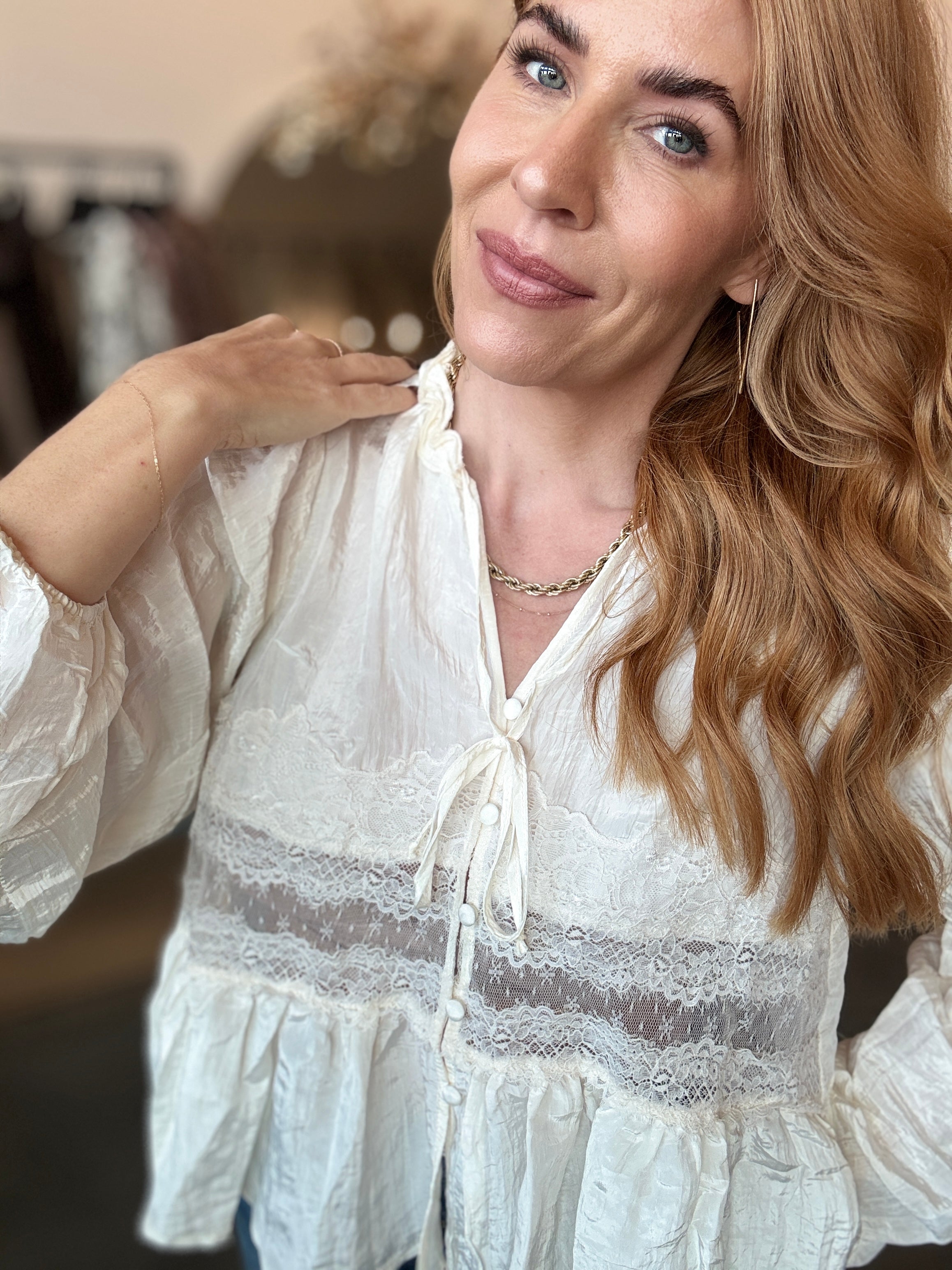 Effortlessly chic and undeniably romantic, this off-white lace blouse strikes the perfect balance between sweet and sophisticated. The delicate cutout details add just the right amount of intrigue, while the soft fabric keeps you comfortable all day long. Whether you're heading out for coffee with friends or getting ready for an evening of elegance, this versatile piece transitions seamlessly from casual to dressed-up glamour.