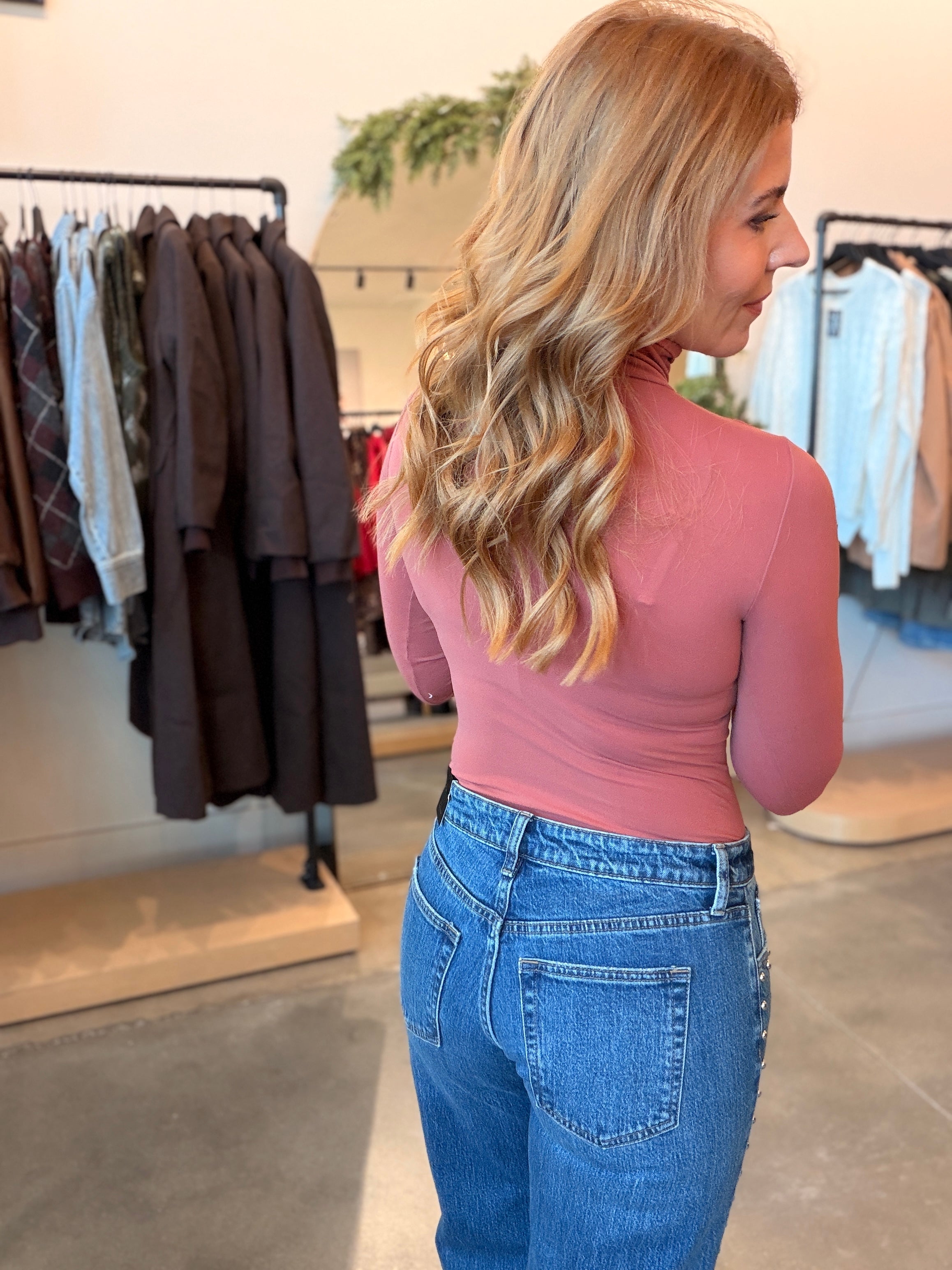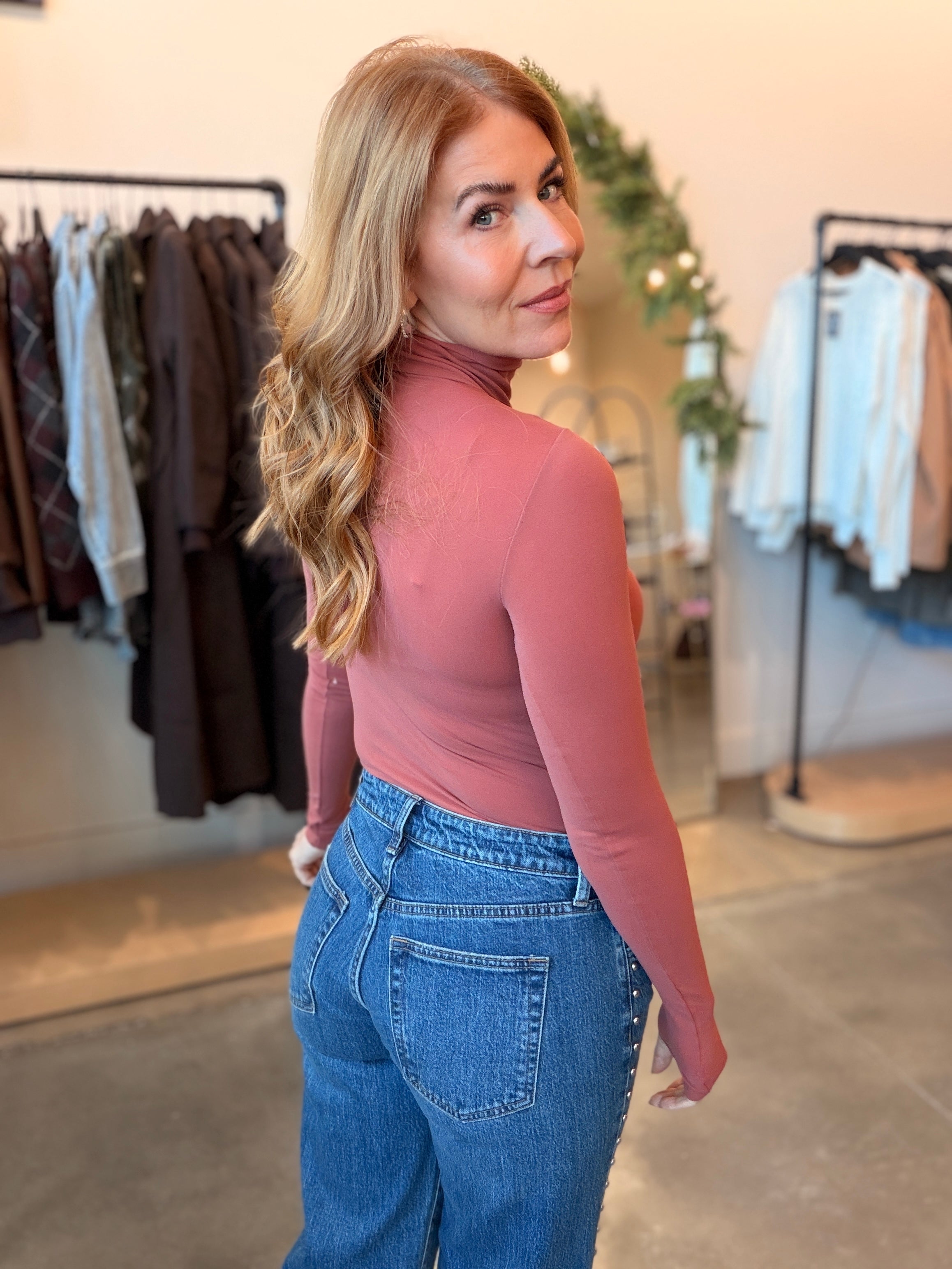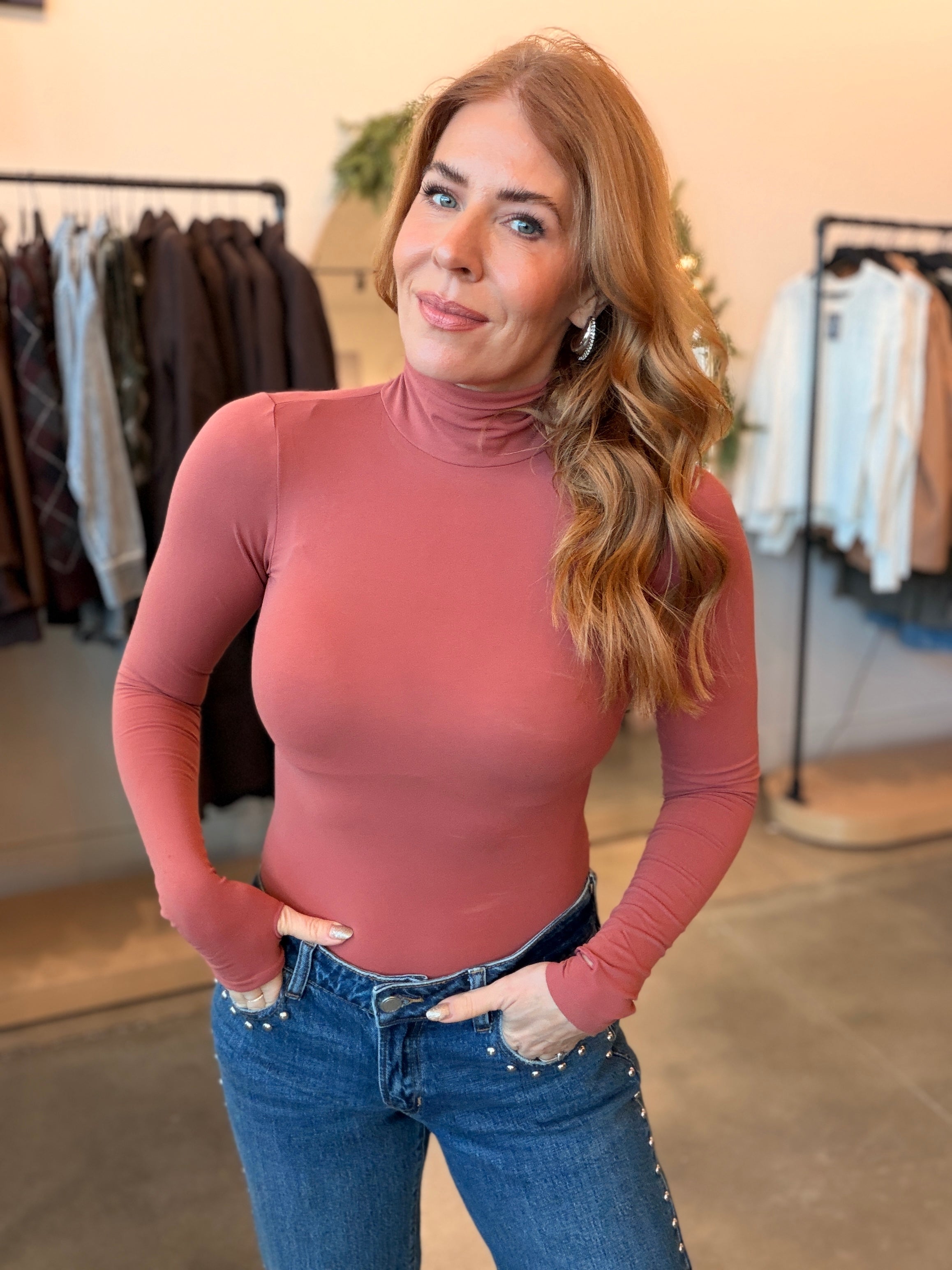 Stay cozy and chic with this seamless knit bodysuit featuring a classic turtleneck and long sleeves. The ultra-fitted silhouette makes it ideal for layering under cardigans and sweaters during colder months. True to size with a snug fit—note that it may be sheer depending on your build. Your new go-to piece for effortless winter style.
