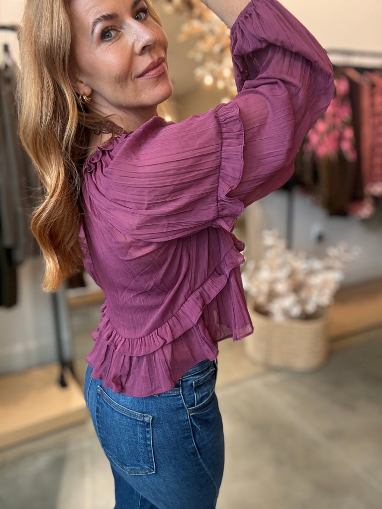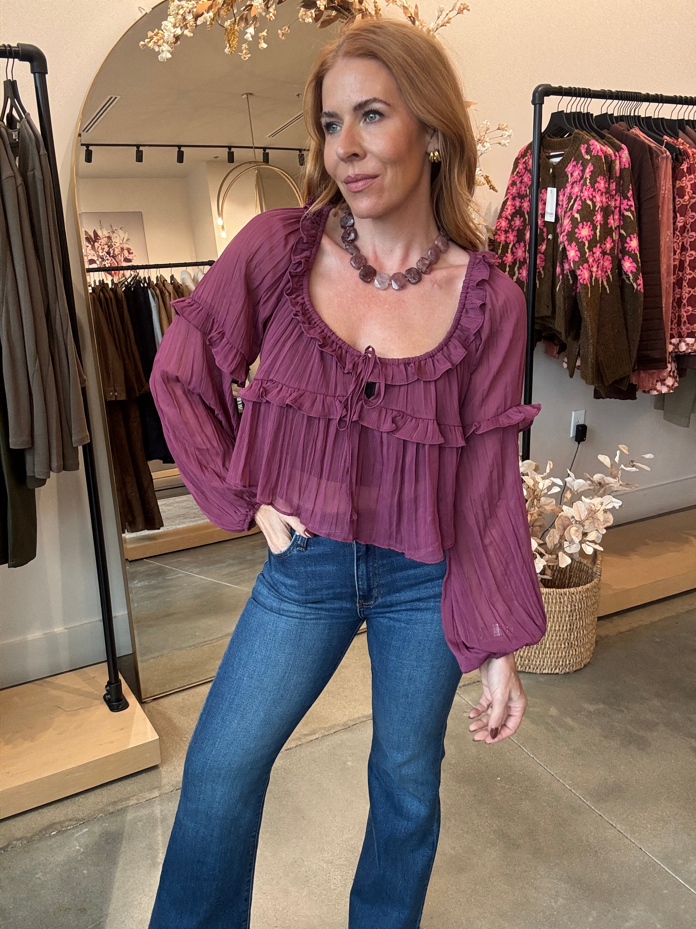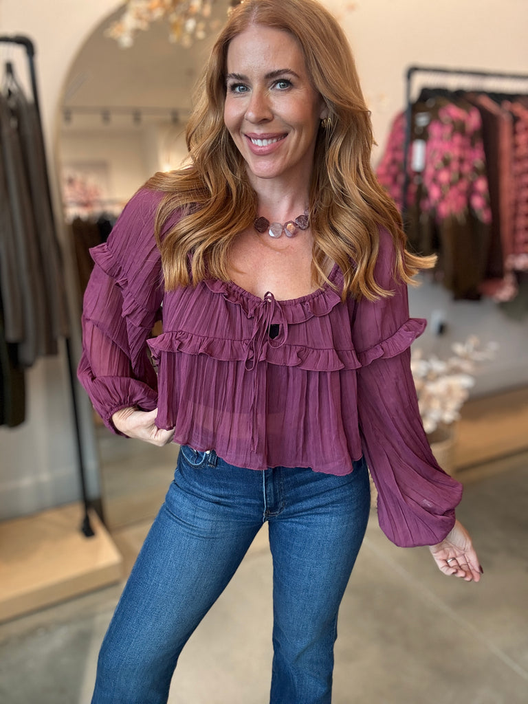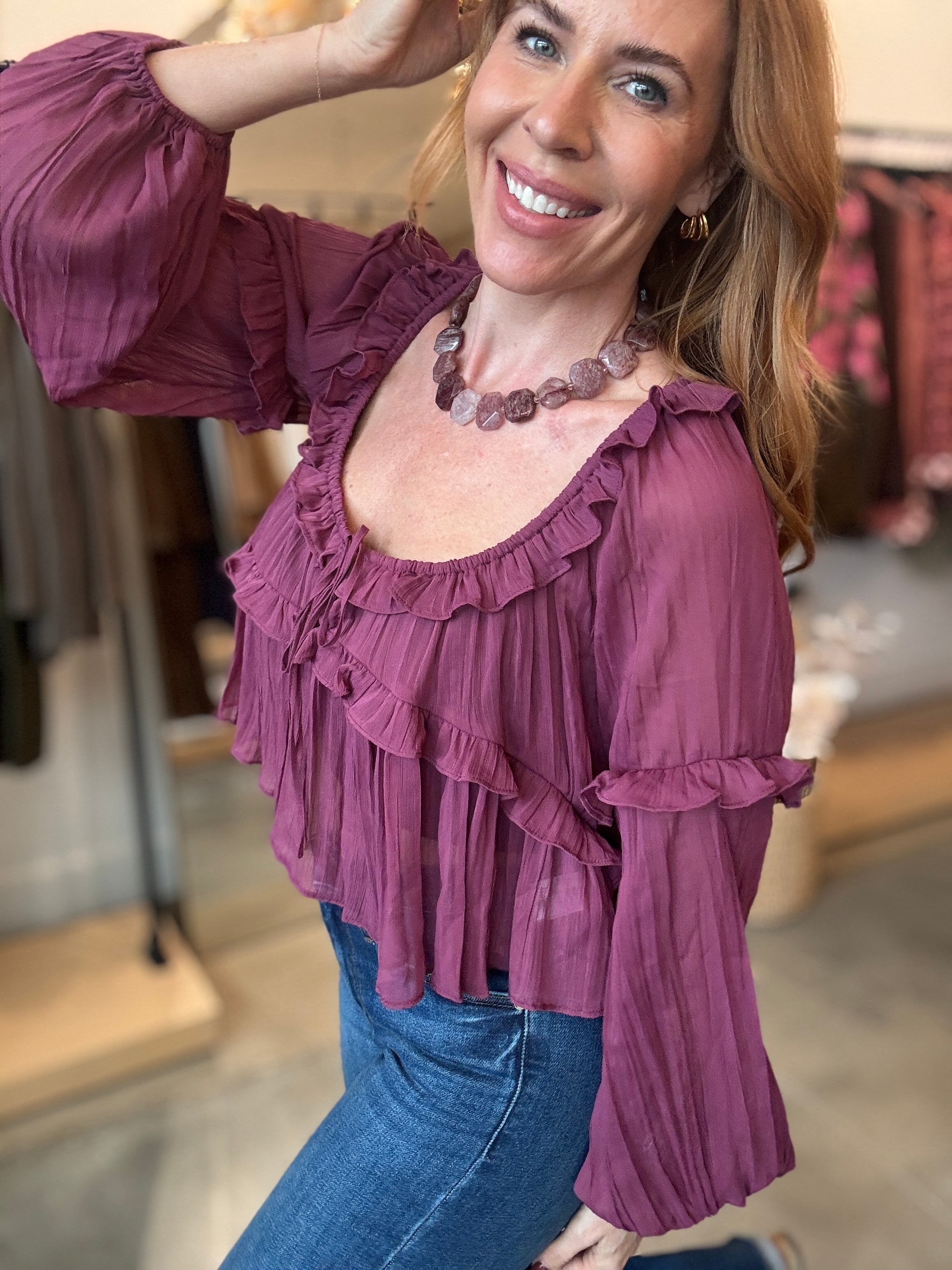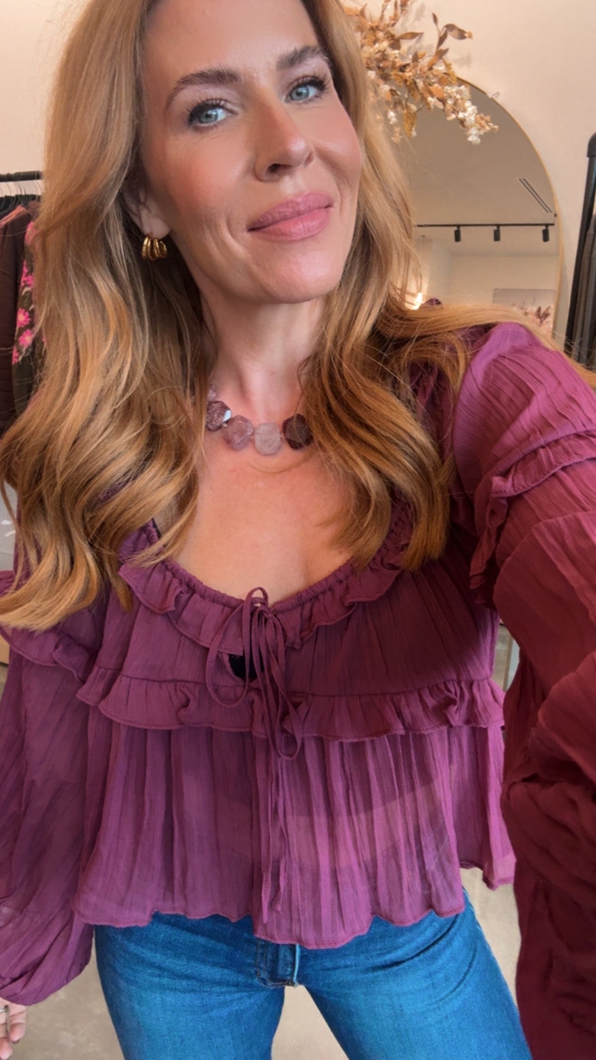 The Kensie Burgundy Blouse is this season’s must-have, featuring charming ruffles and a vibrant green hue. Pair it with denim or leather for a fun and fabulous look perfect for family photos. Andrea is wearing a size small. This top runs true to size.