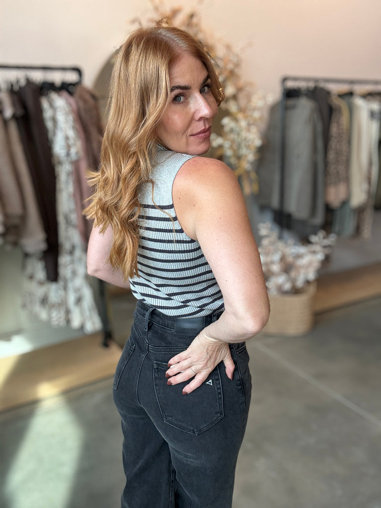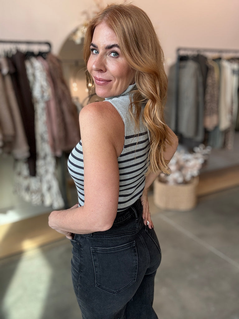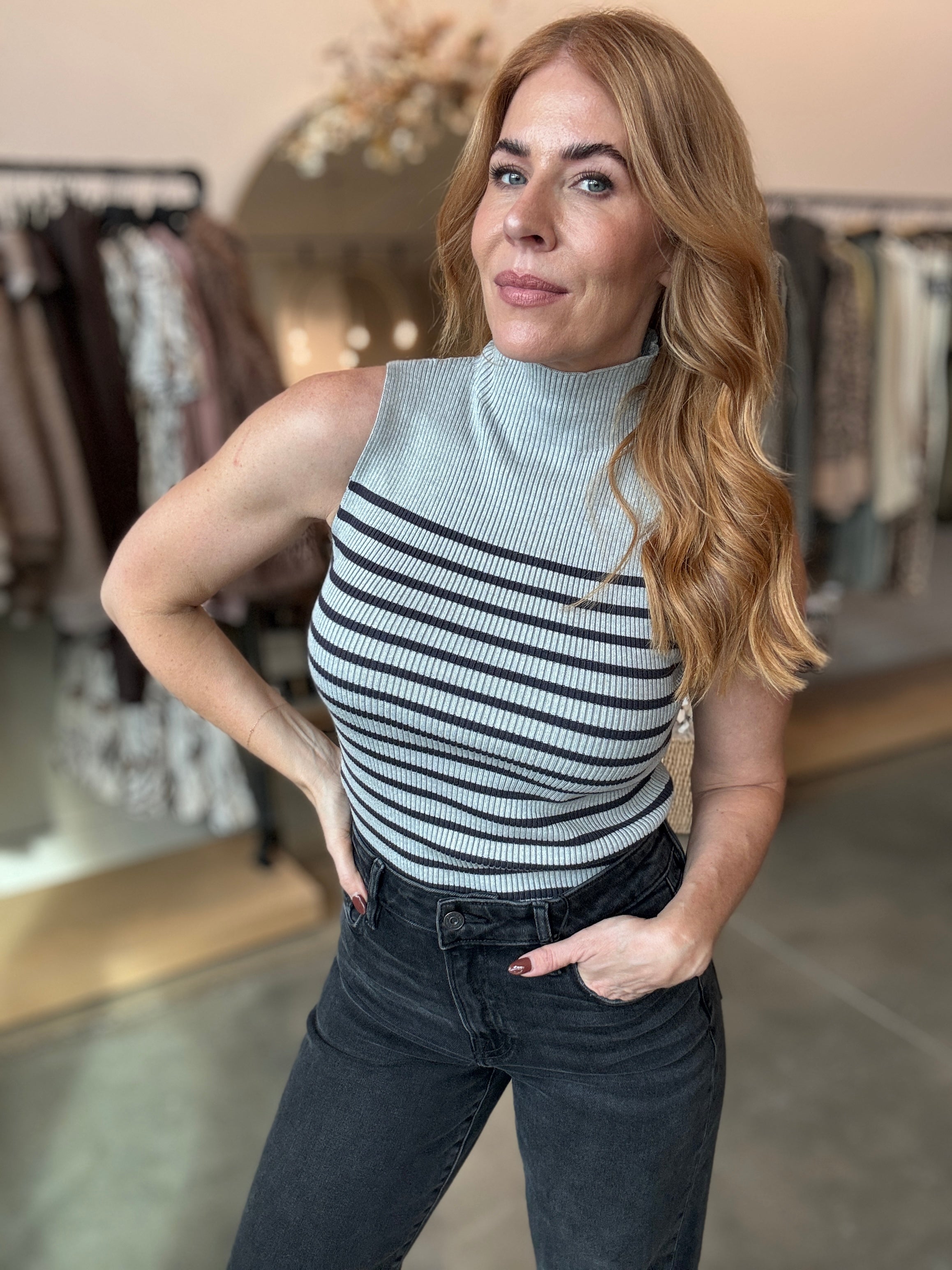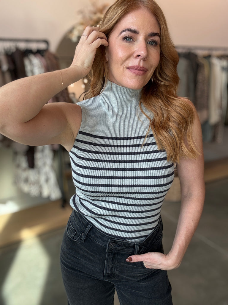 Stripes meet style in this high-neck essential that keeps you cozy where it counts while letting your arms take center stage. Layer it solo or throw it over your favorite tee for instant cool-girl vibes. The model is wearing a size M.