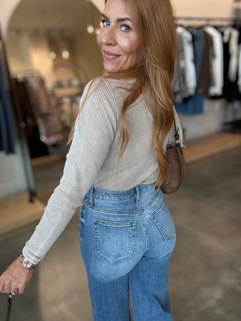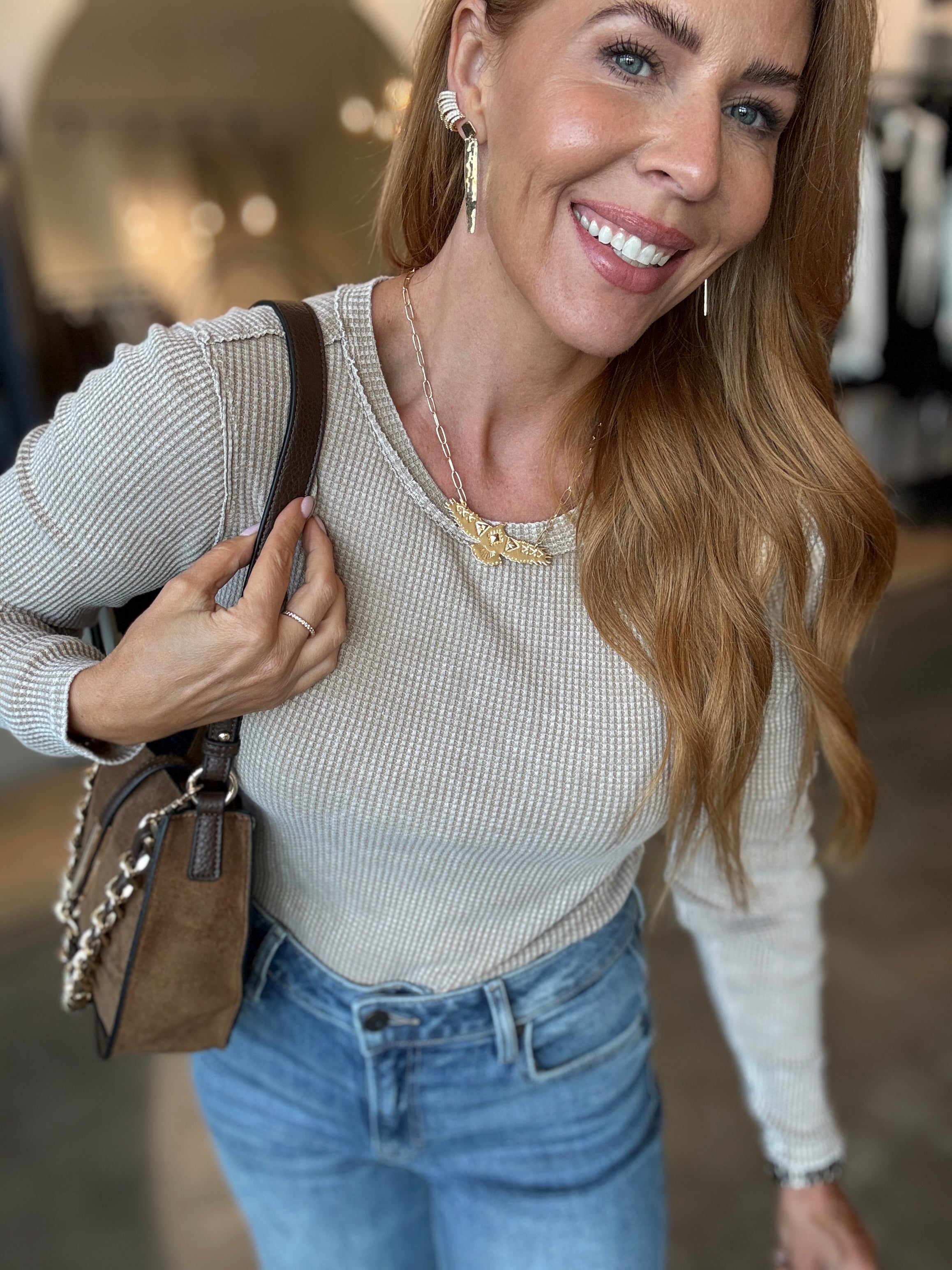 The Arlet Mini Thermal Top fits just right—Andrea is rocking a Small. This cute essential is perfect for layering and ready to become your new favorite staple.