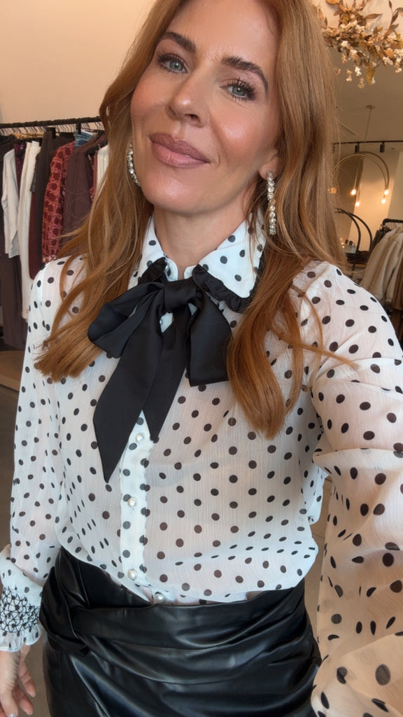 The Wintour Pearl Button Polka Dot Tie Blouse brings all the charm of a chic Parisian style. Step aside, Emily—a fresh new look has arrived! This blouse fits true to size and features a detachable black neck tie for versatility. Pearl buttons add the perfect finishing touch to this adorable, playful piece.