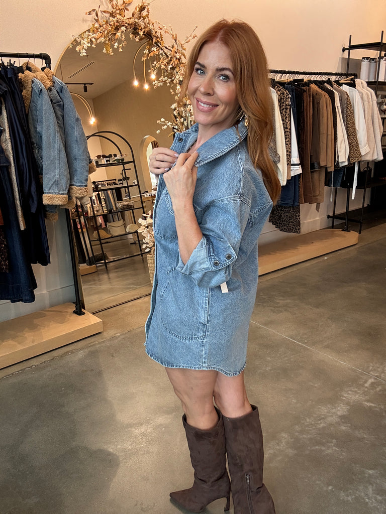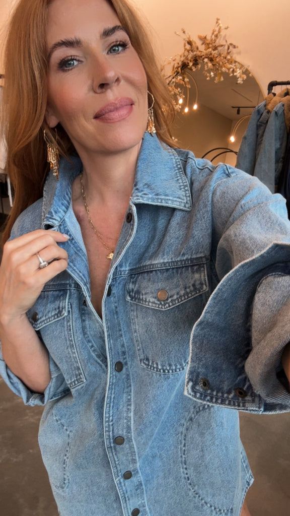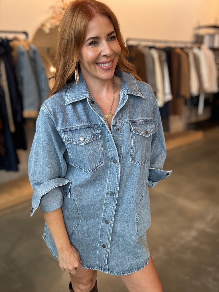 Ultimate Long Denim Layer Jacket can be worn layered over your fav tee or sweater or styled as a dress buttoned and worn with boots. Very oversized. Wearing a small.
