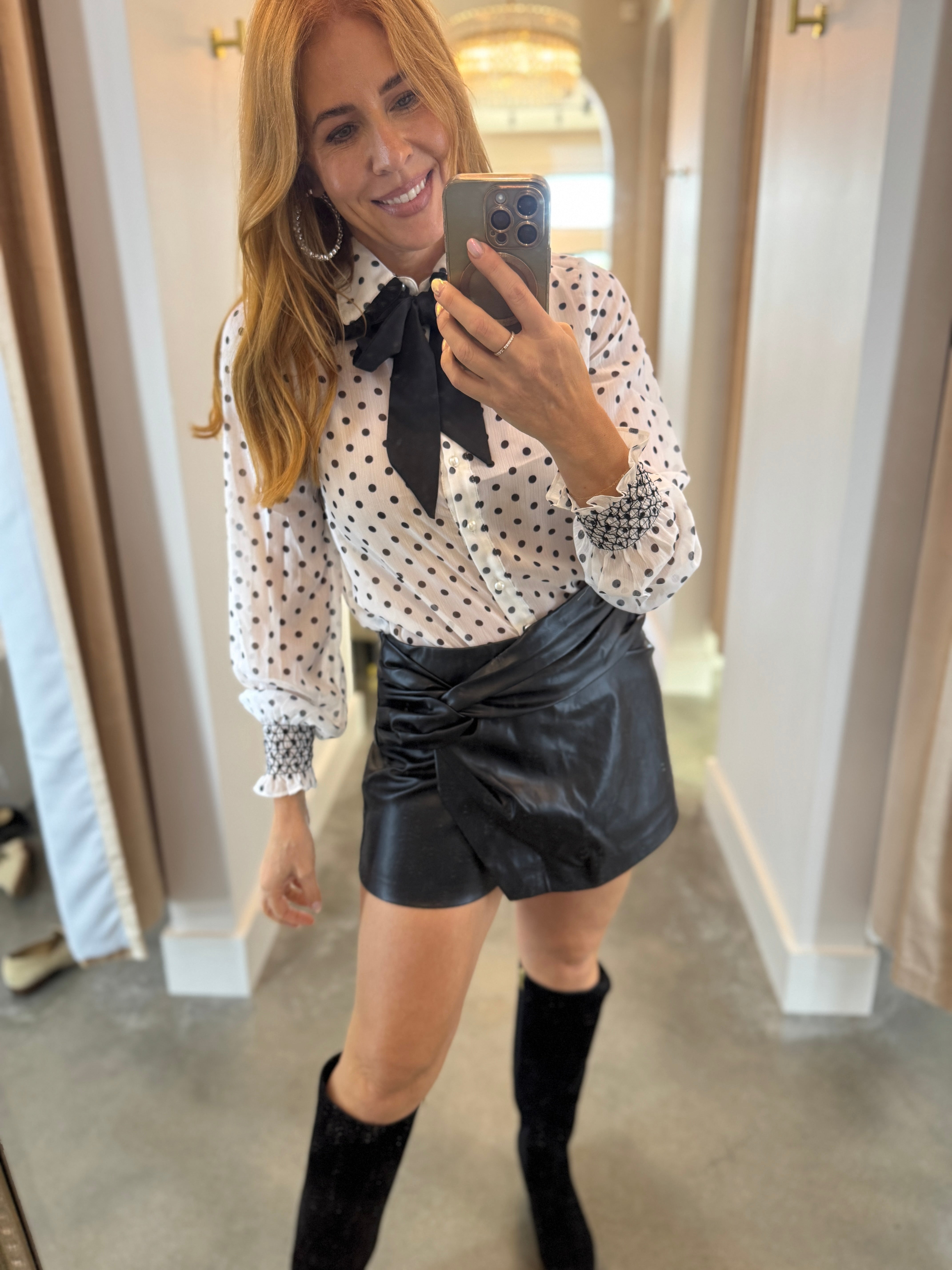 The Twisted Black Skort is a fun and flirty faux leather piece perfect for pairing with your favorite tops, bodysuits, or cozy sweaters this season. It’s designed to be on the shorter side—Andrea went up to a medium for a comfy fit. Love showing off your legs? Stick to your true size. Prefer a bit more coverage? Grab the next size up for a little extra length and confidence.