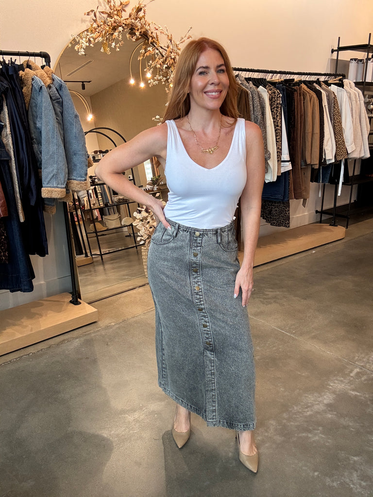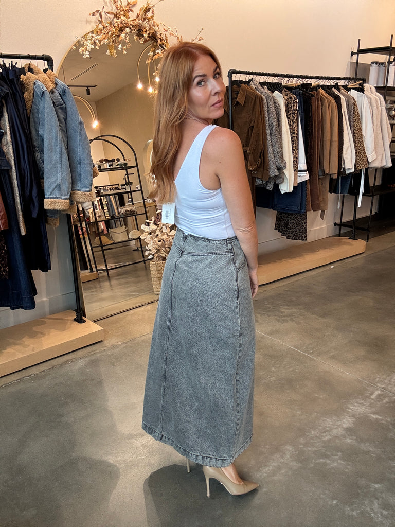 This Grey Wash High Waisted Denim Maxi Skirt fits roomy and drops a bit lower on the hips. Pair it with an oversized sweater and a cool suede belt for effortless charm.