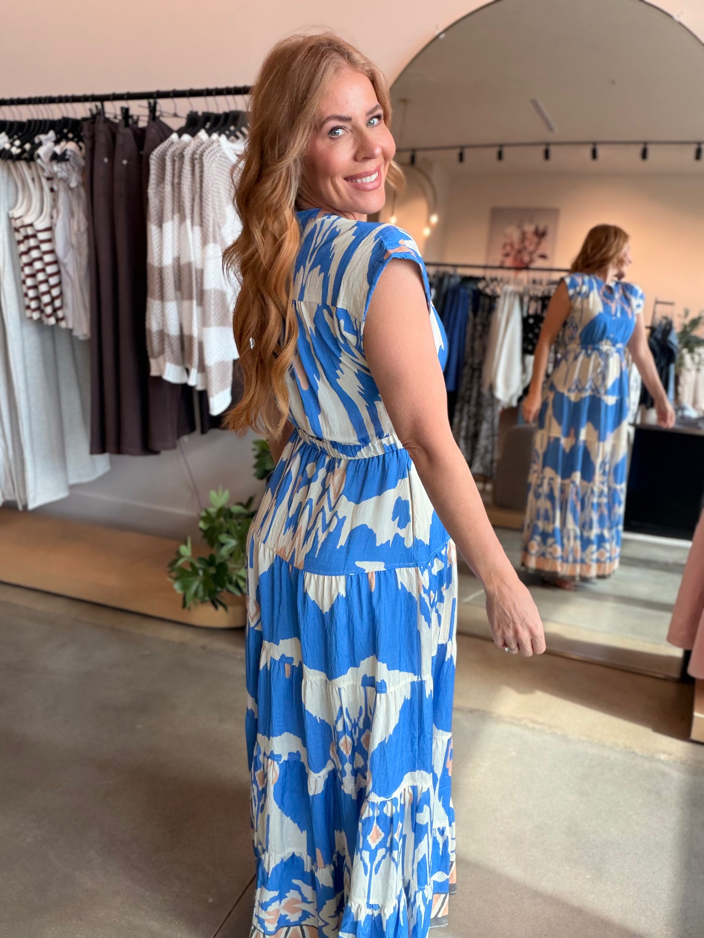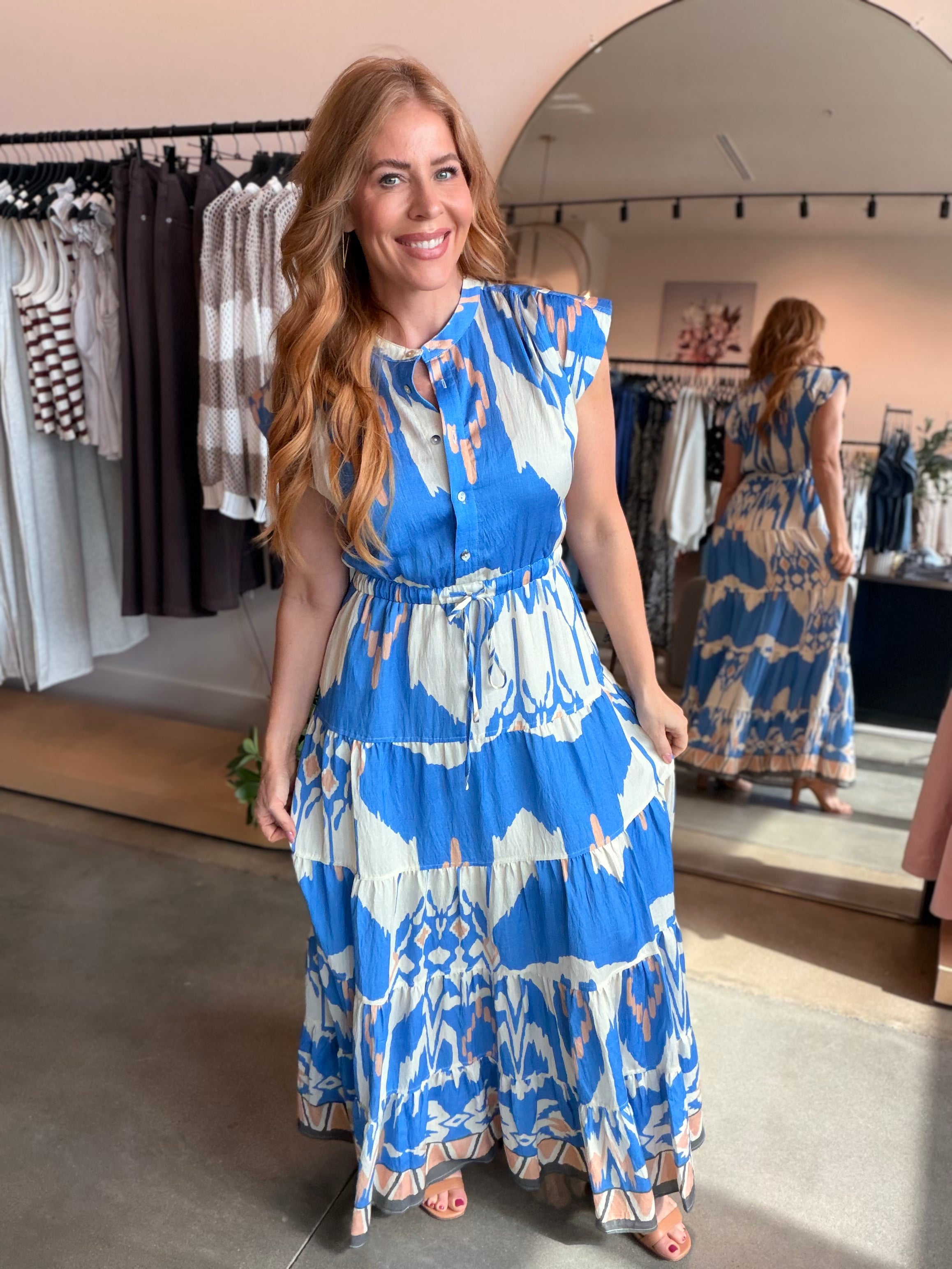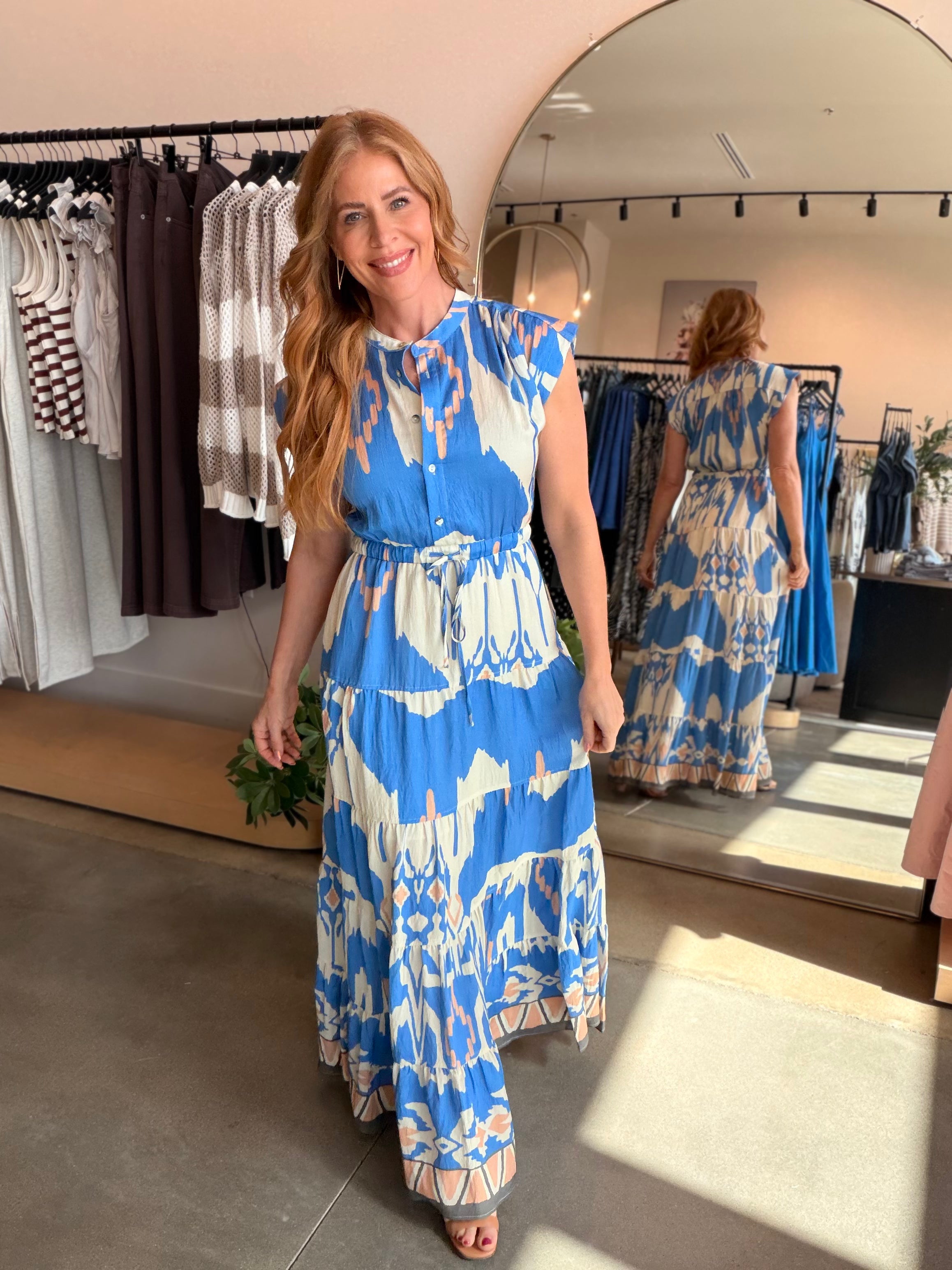 Effortlessly chic and endlessly versatile, the Blue Button Multi Maxi brings timeless elegance to your everyday wardrobe. This classic silhouette strikes the perfect balance between refined and relaxed, making it a go-to piece for any occasion.