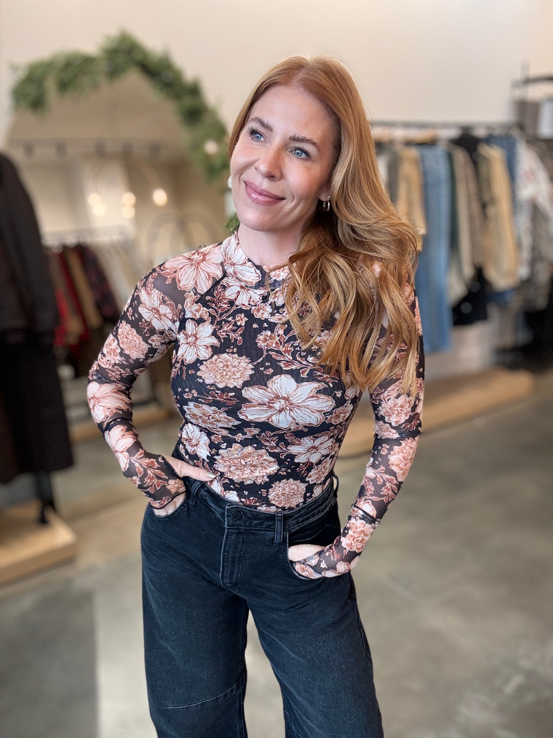 Stay cozy and on-trend with this fitted floral mesh top, complete with a mock-neck and convenient thumbholes. The perfect blend of winter warmth and botanical charm, this piece brings playful style to your seasonal wardrobe.