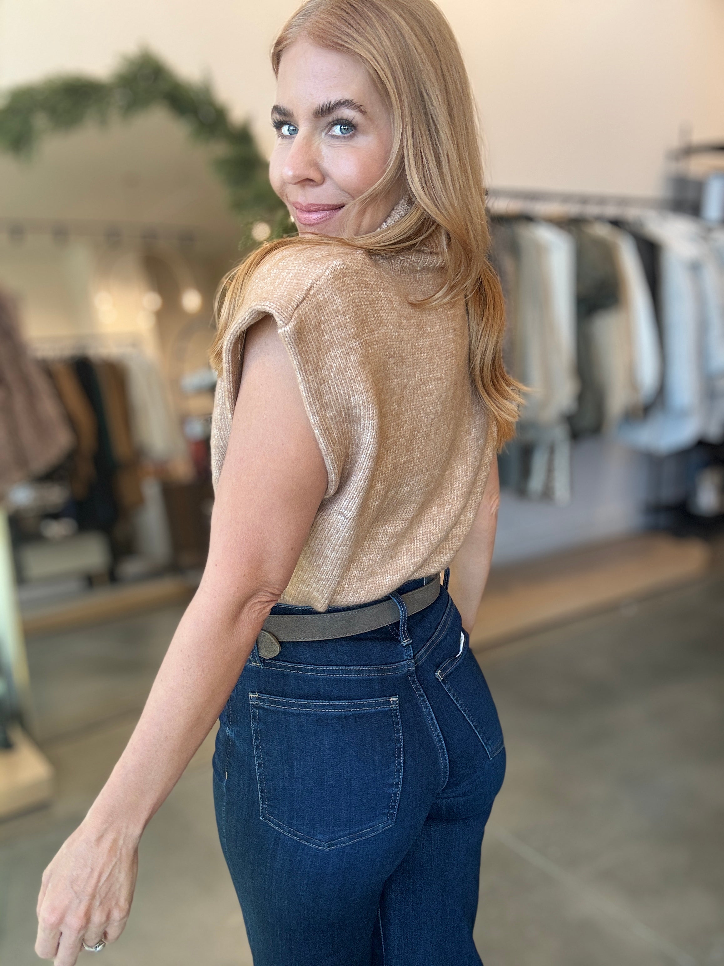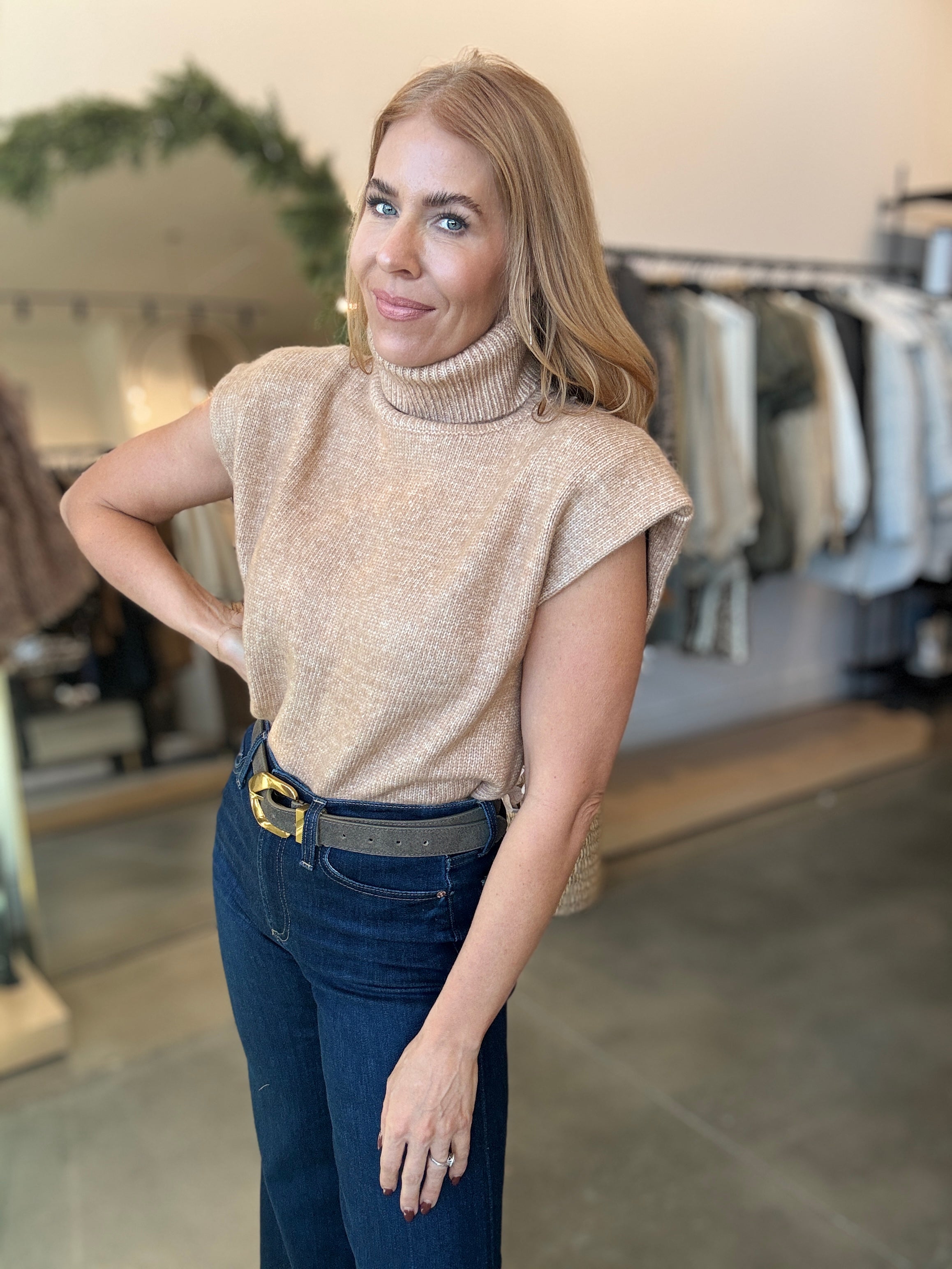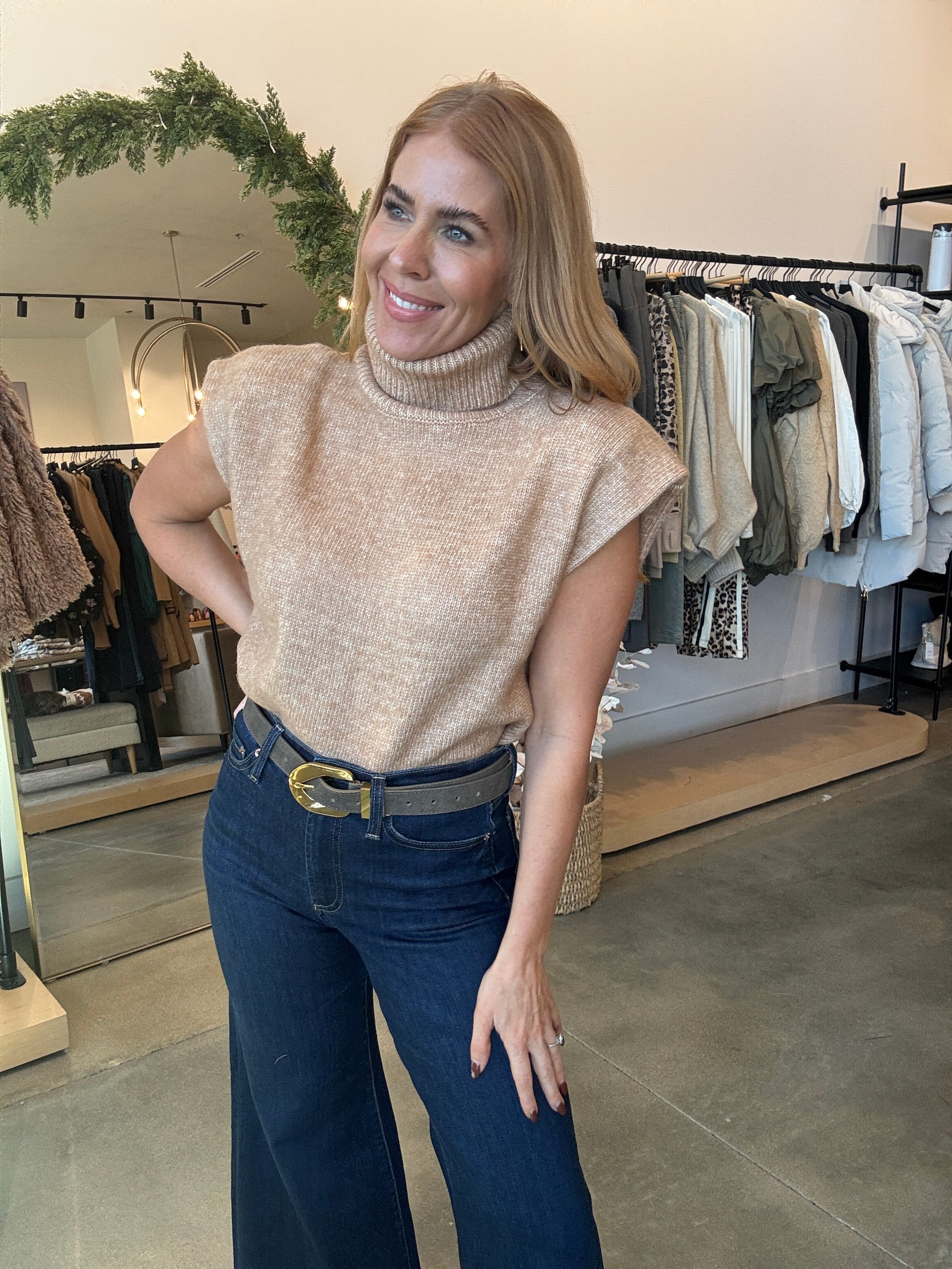 Tan Turtleneck Shoulder Pad Sweater