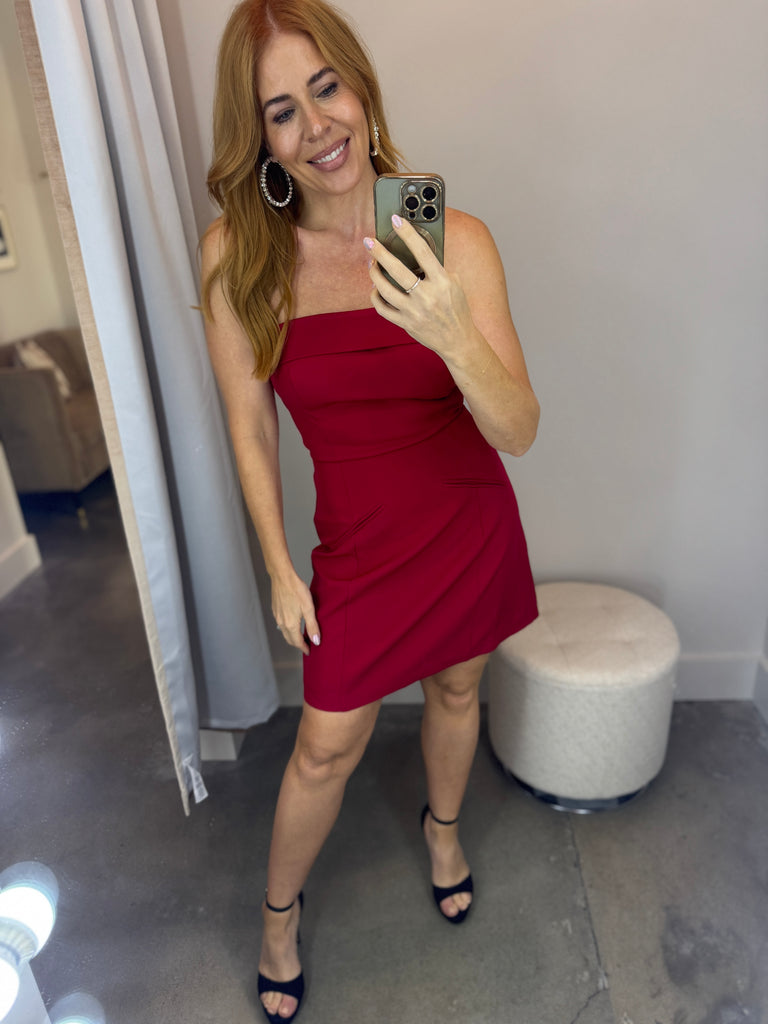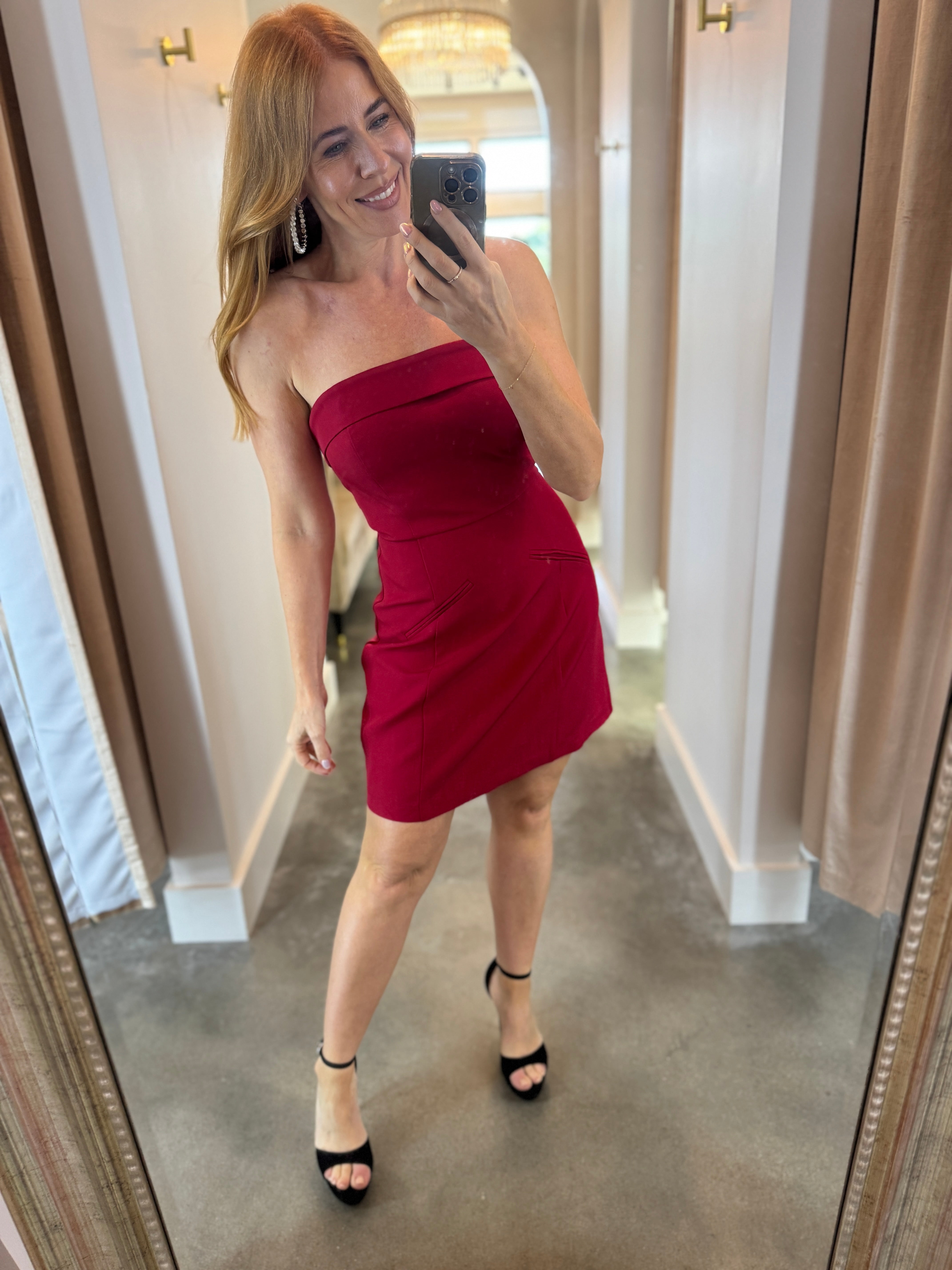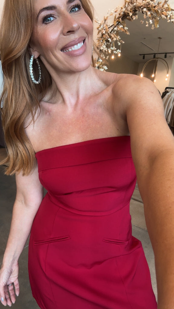The Strapless Red Mini Dress is your go-to for holiday celebrations! Featuring a flattering shape and comfy, thick yet breathable fabric, it shines in a rich cherry red hue. True to size, with Andrea rocking a size small. It zips up in the back and has silicone along the top to keep everything perfectly put.